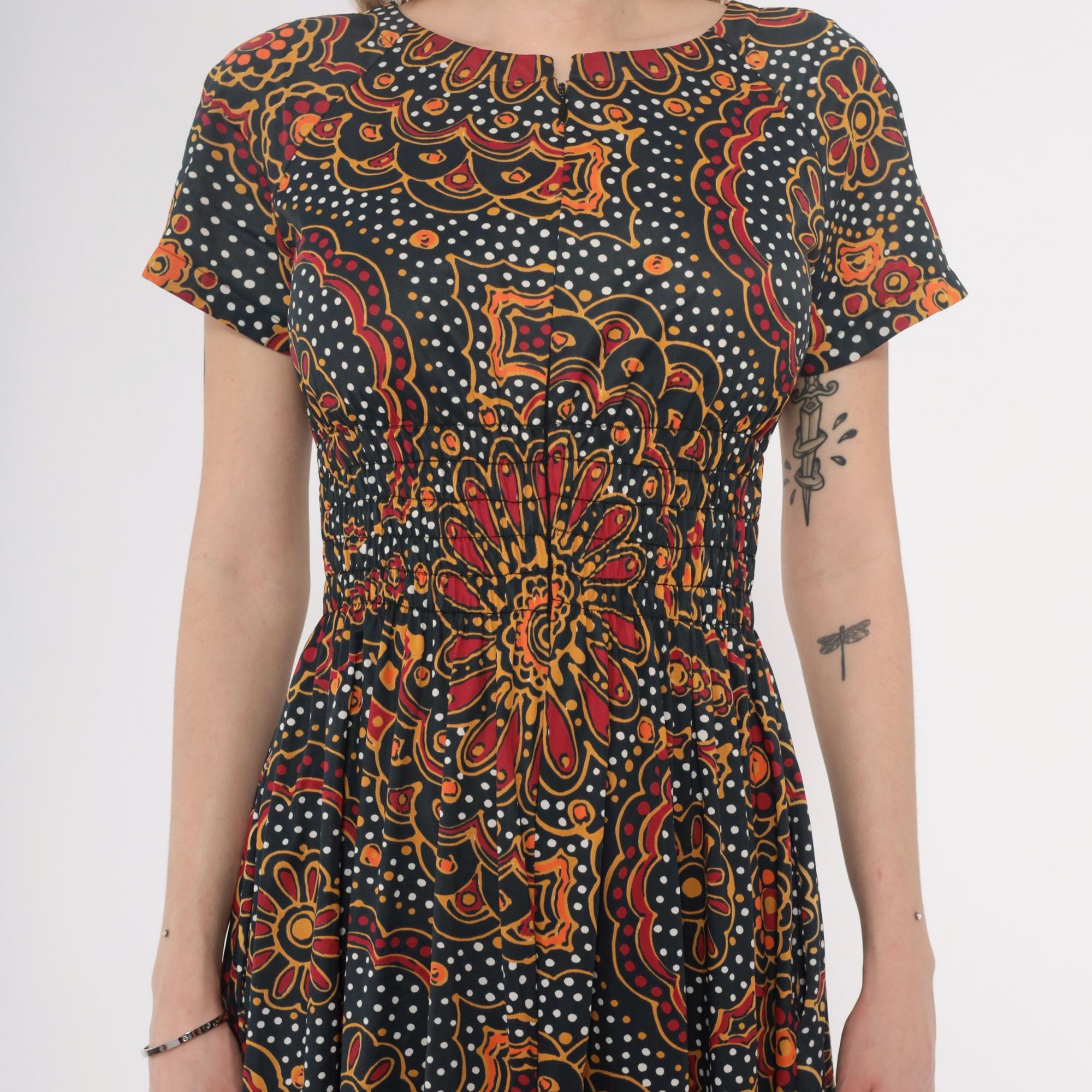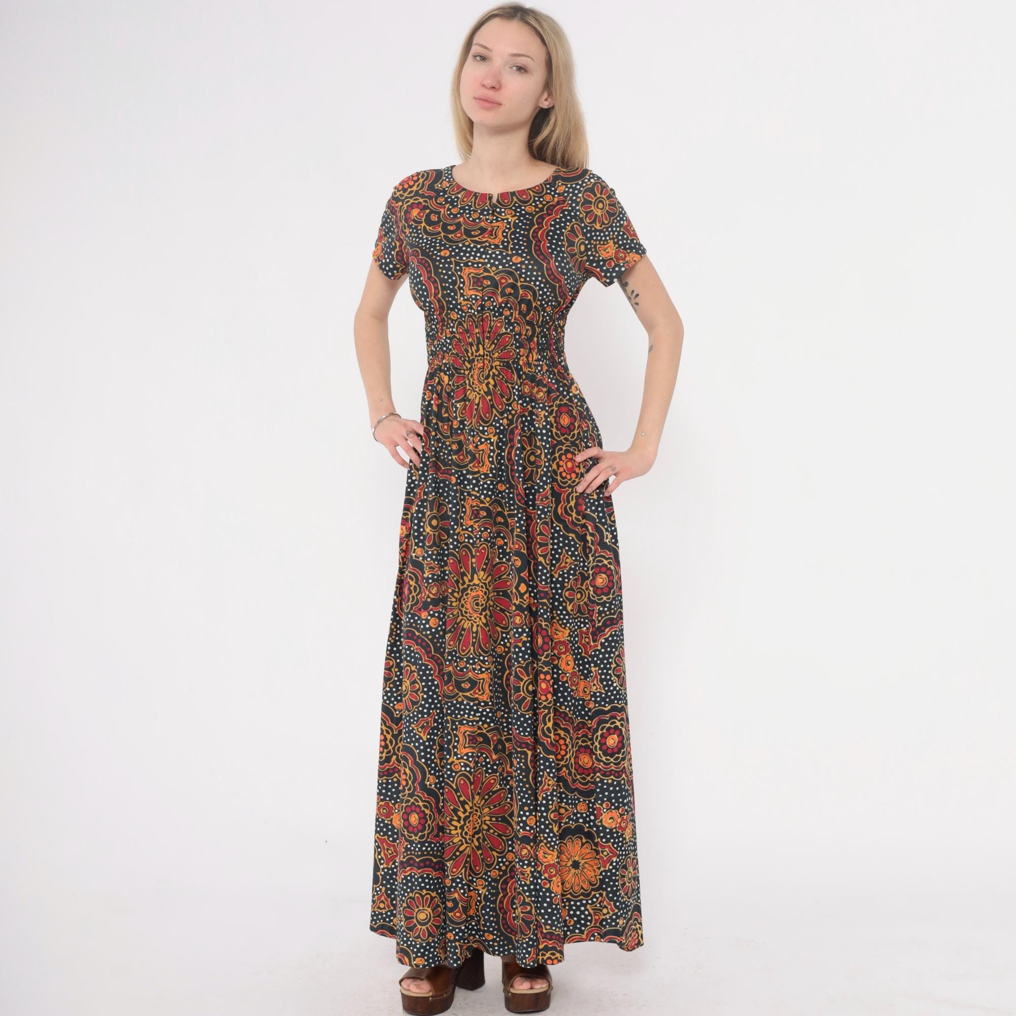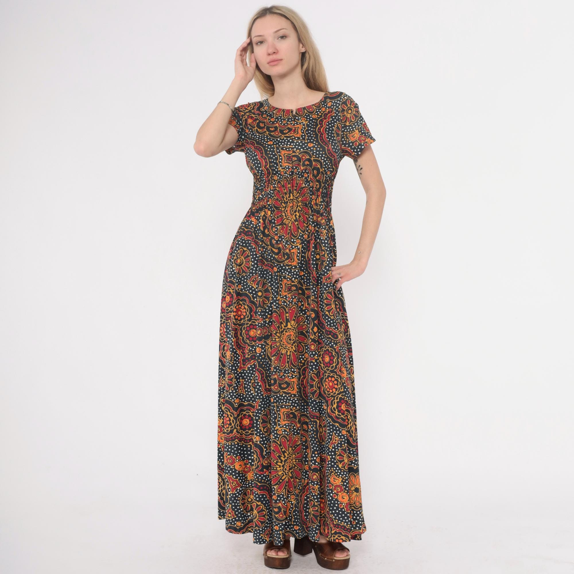 70s psychedelic maxi dress with mandala and paisley floral print in red, orange, yellow, and burgundy on navy fabric with white polka dot background. Round neckline, short sleeves, fitted bodice with empire waist below the bust, full-length skirt.