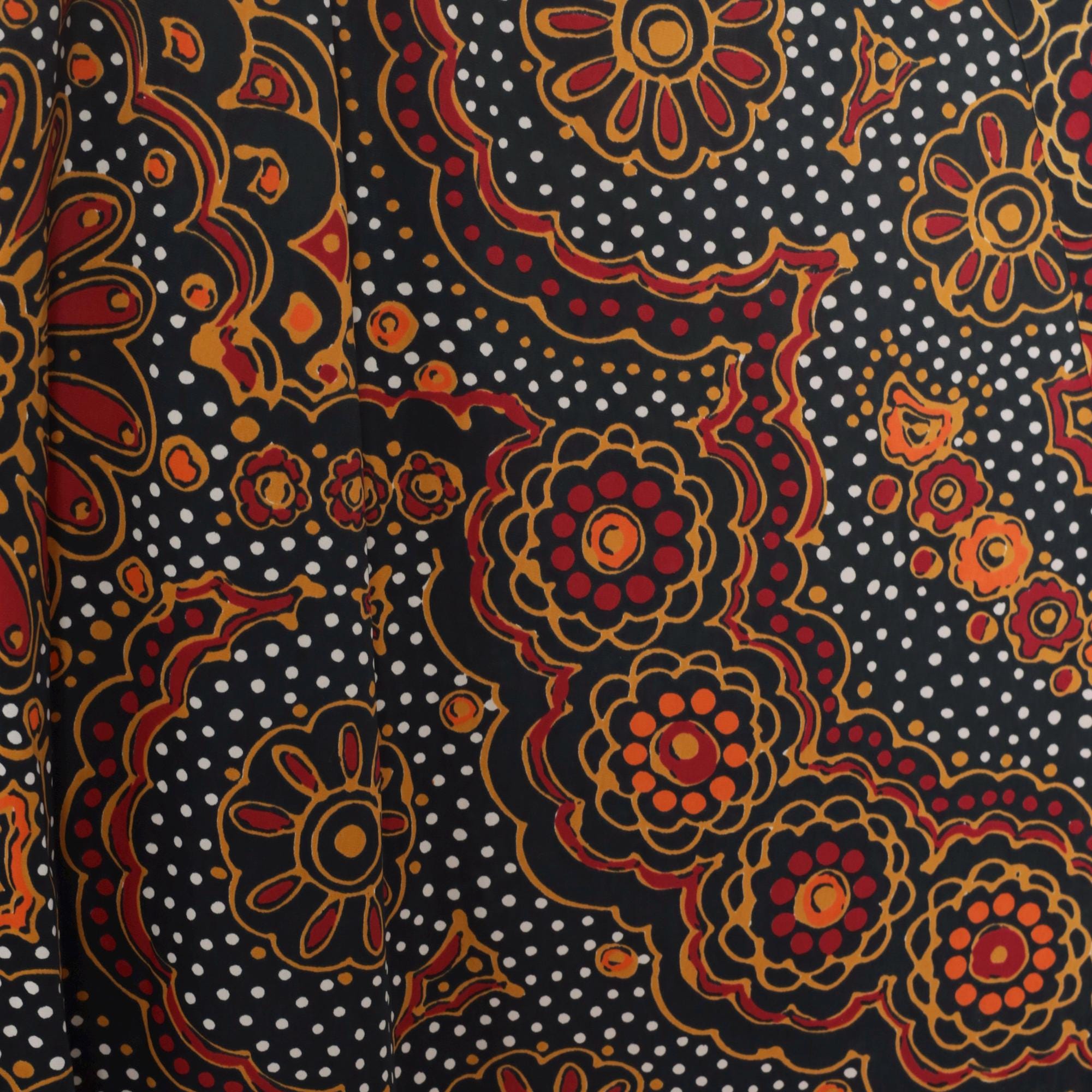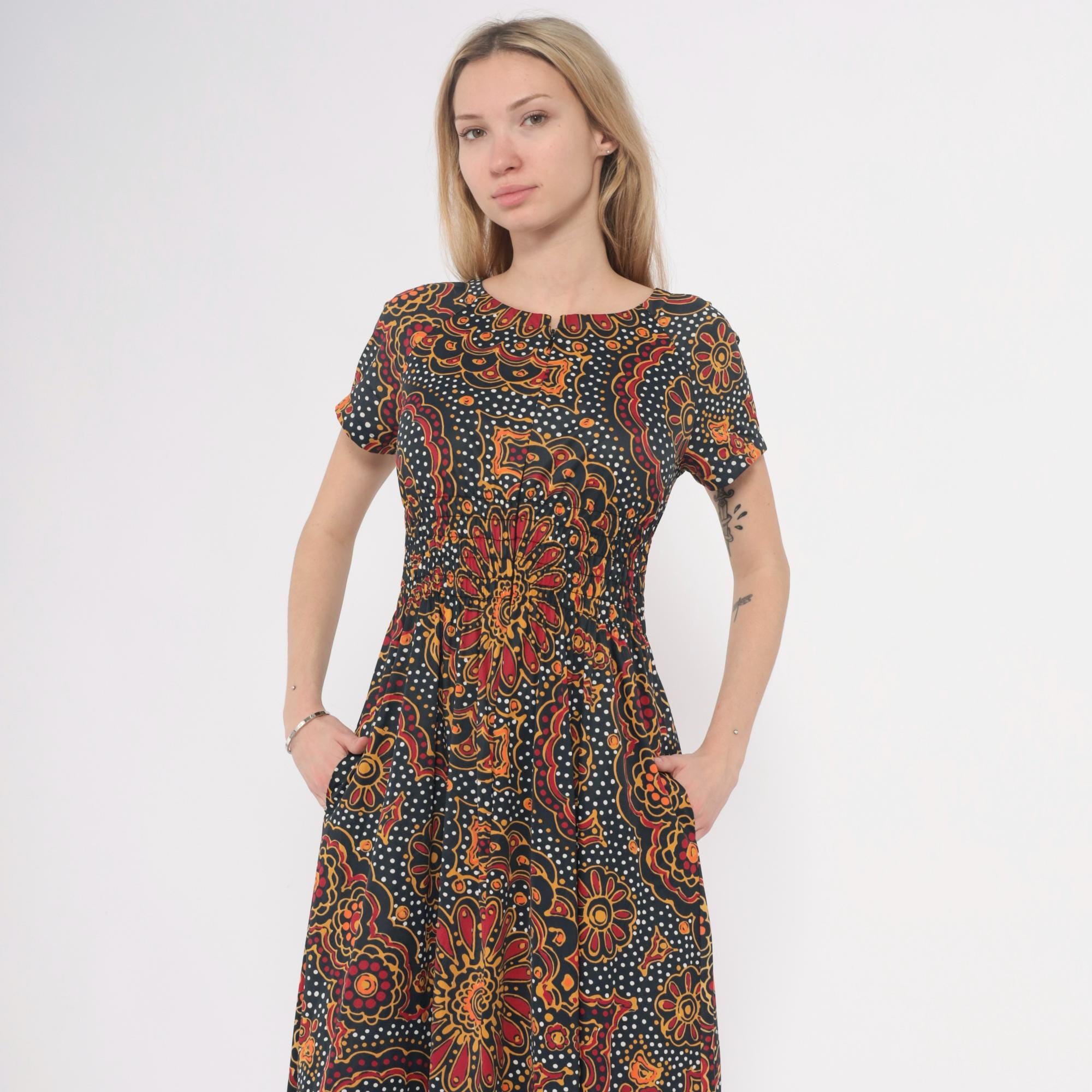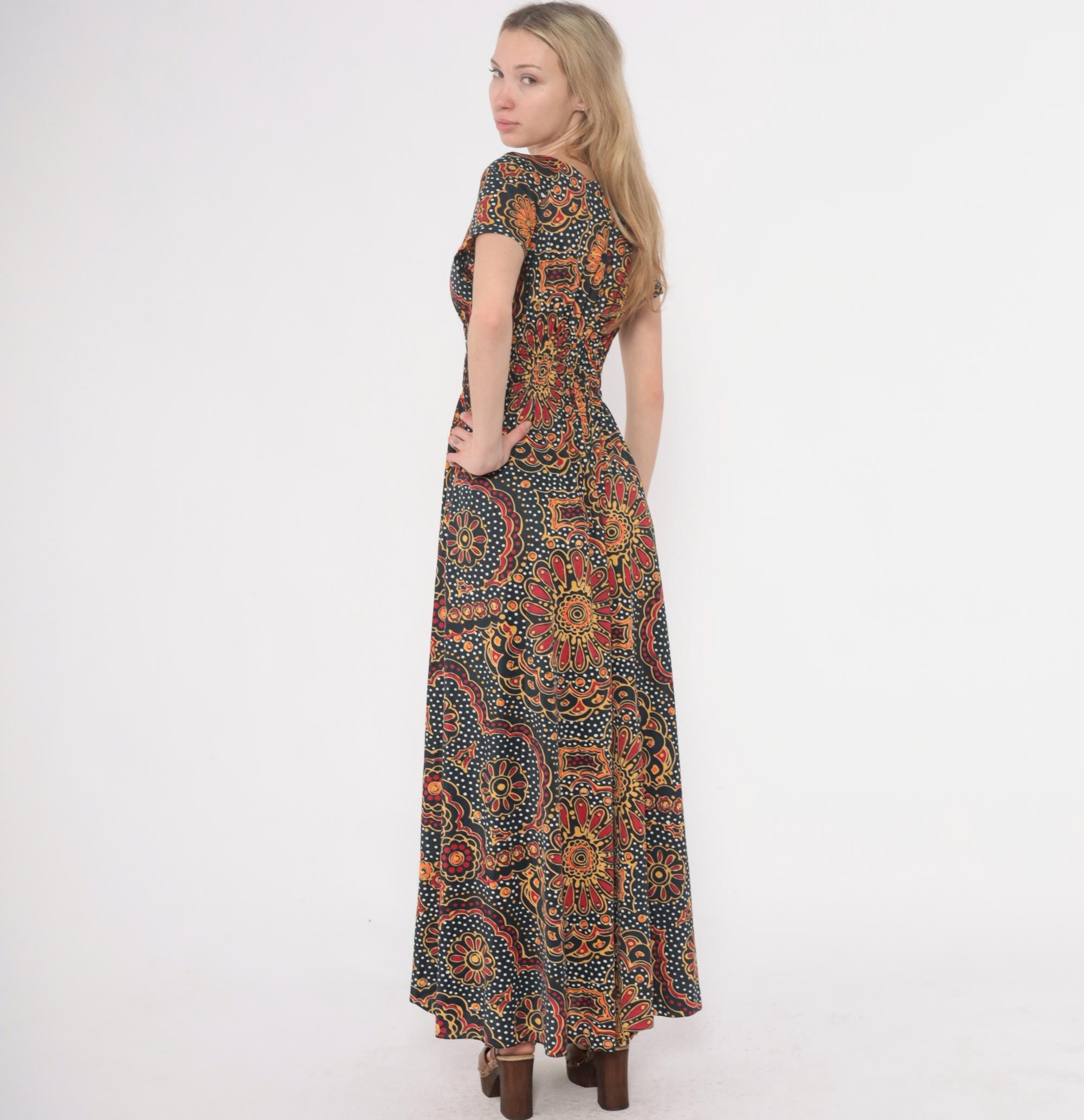 70s psychedelic maxi dress with mandala and paisley floral print in red, orange, yellow, and burgundy on navy fabric with white polka dot background. Round neckline, short sleeves, fitted bodice with empire waist below the bust, full-length skirt.
