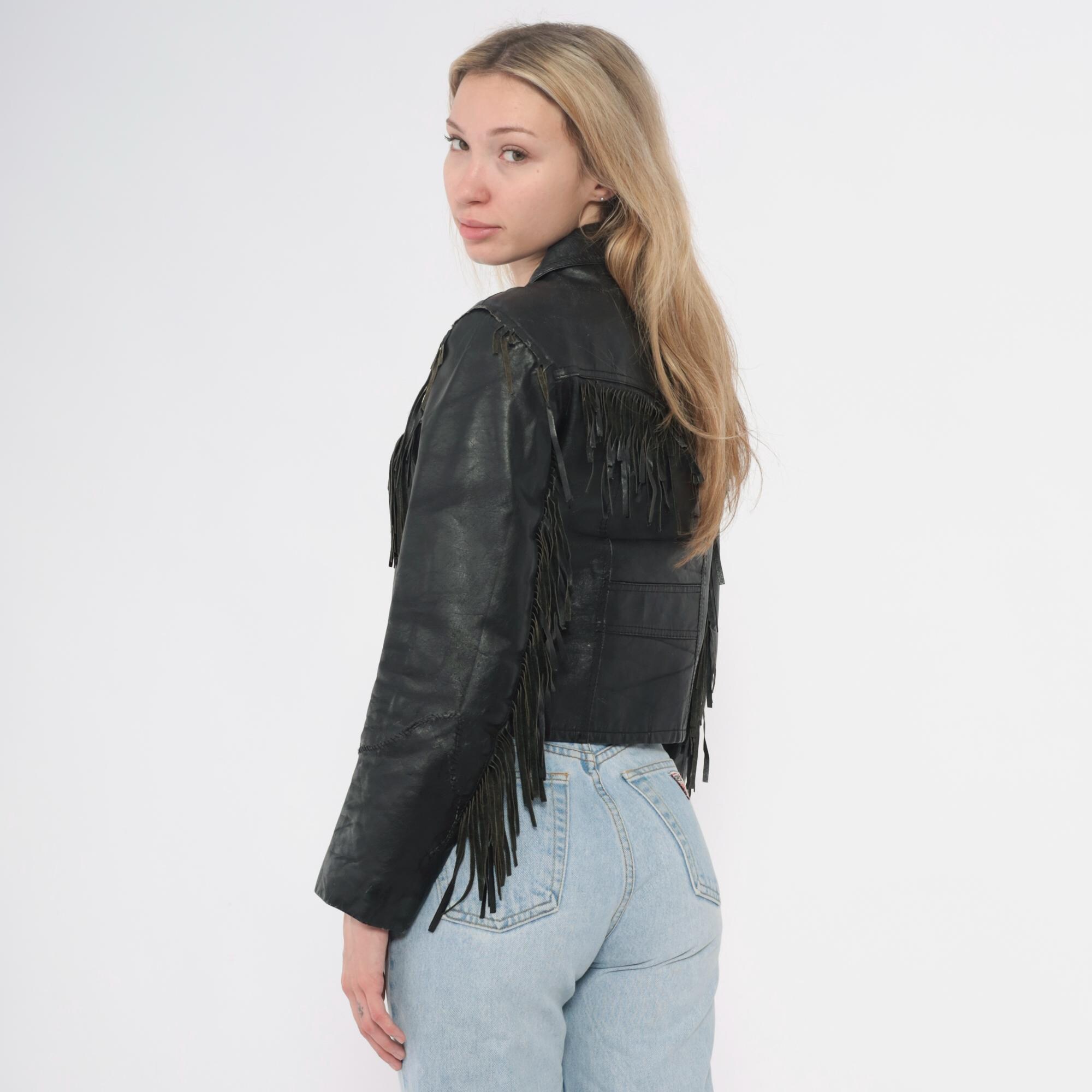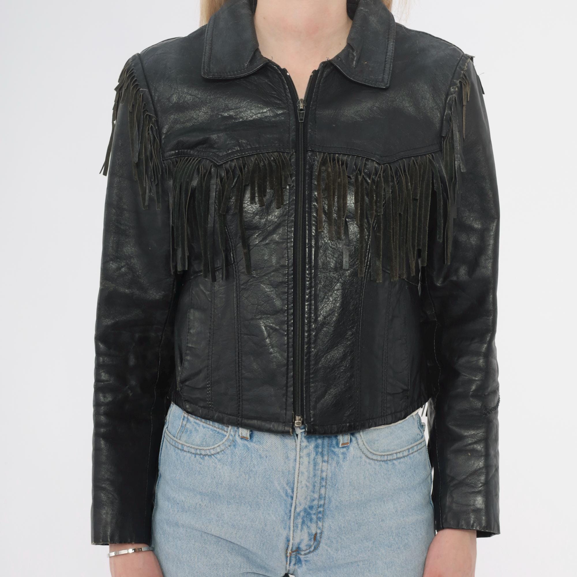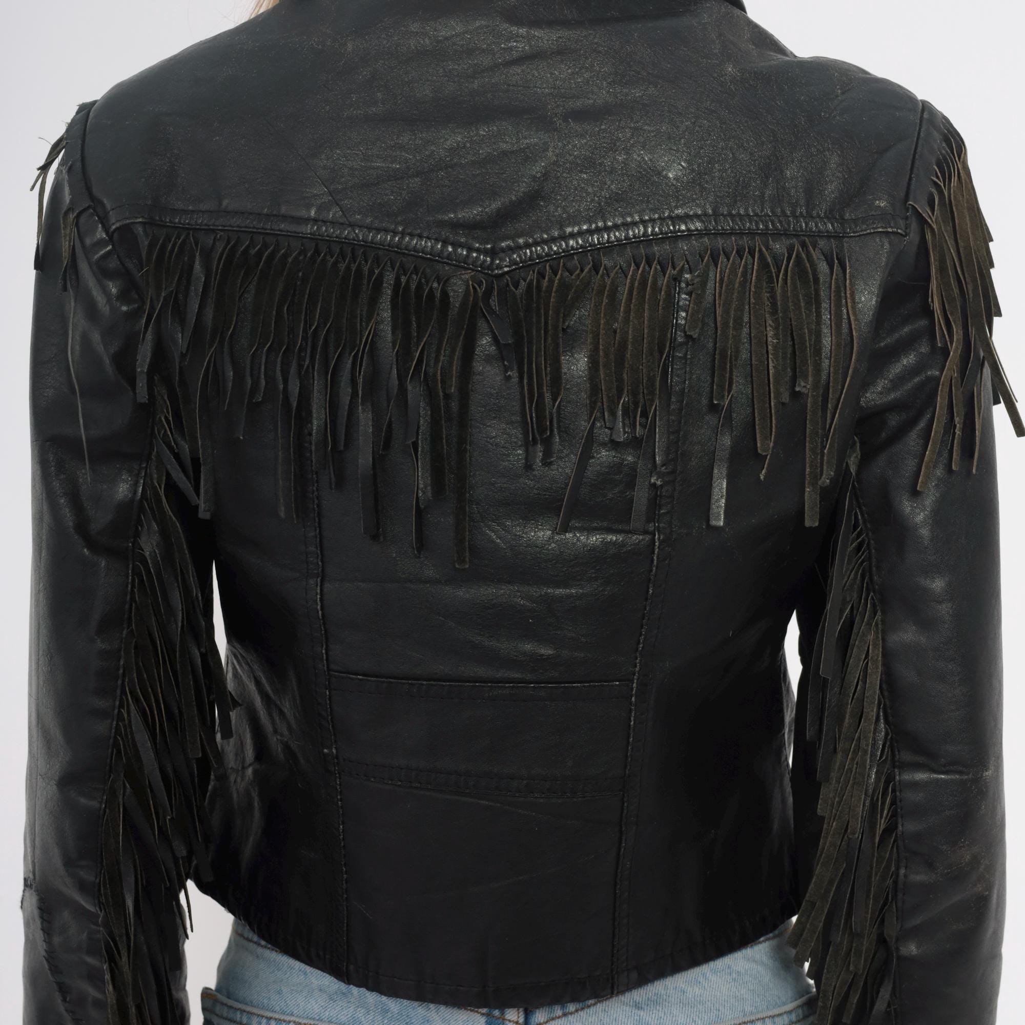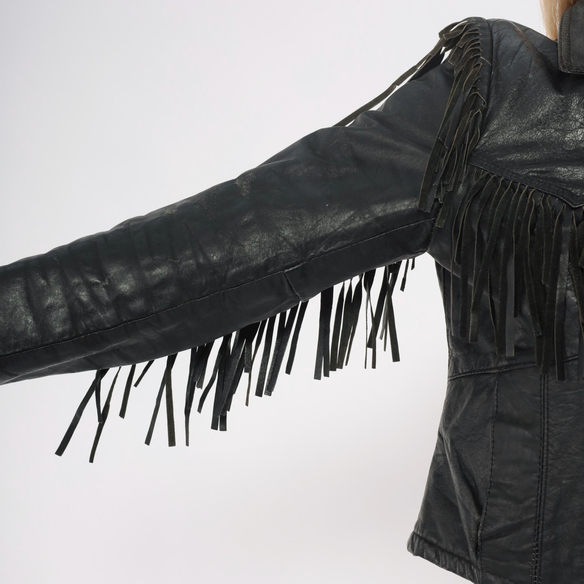 90s black leather fringe jacket from Jonathan Christopher with fringe detailing across the chest, back, shoulders, and along the sleeves. Zip front closure with collared neckline and cropped length. Distressed leather.