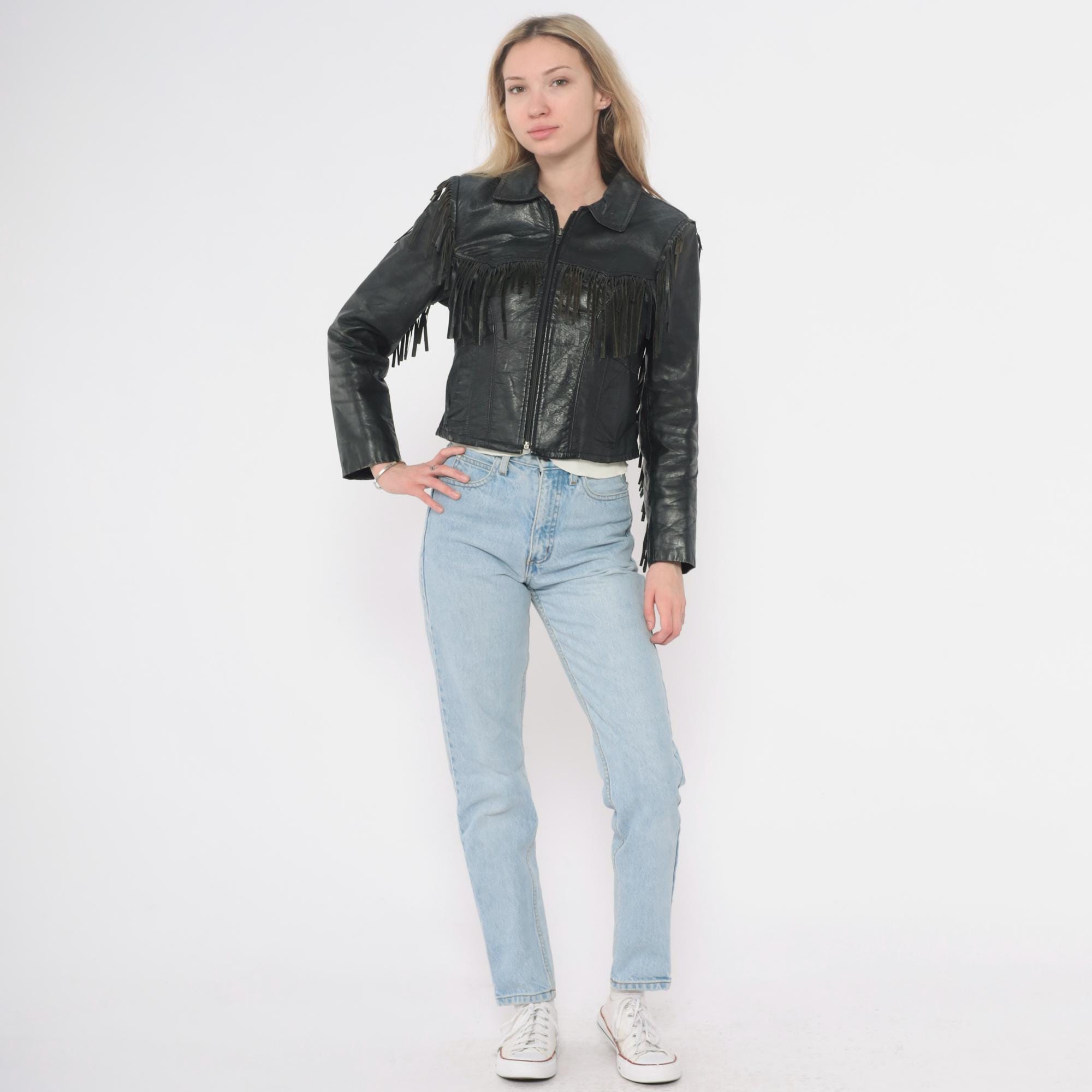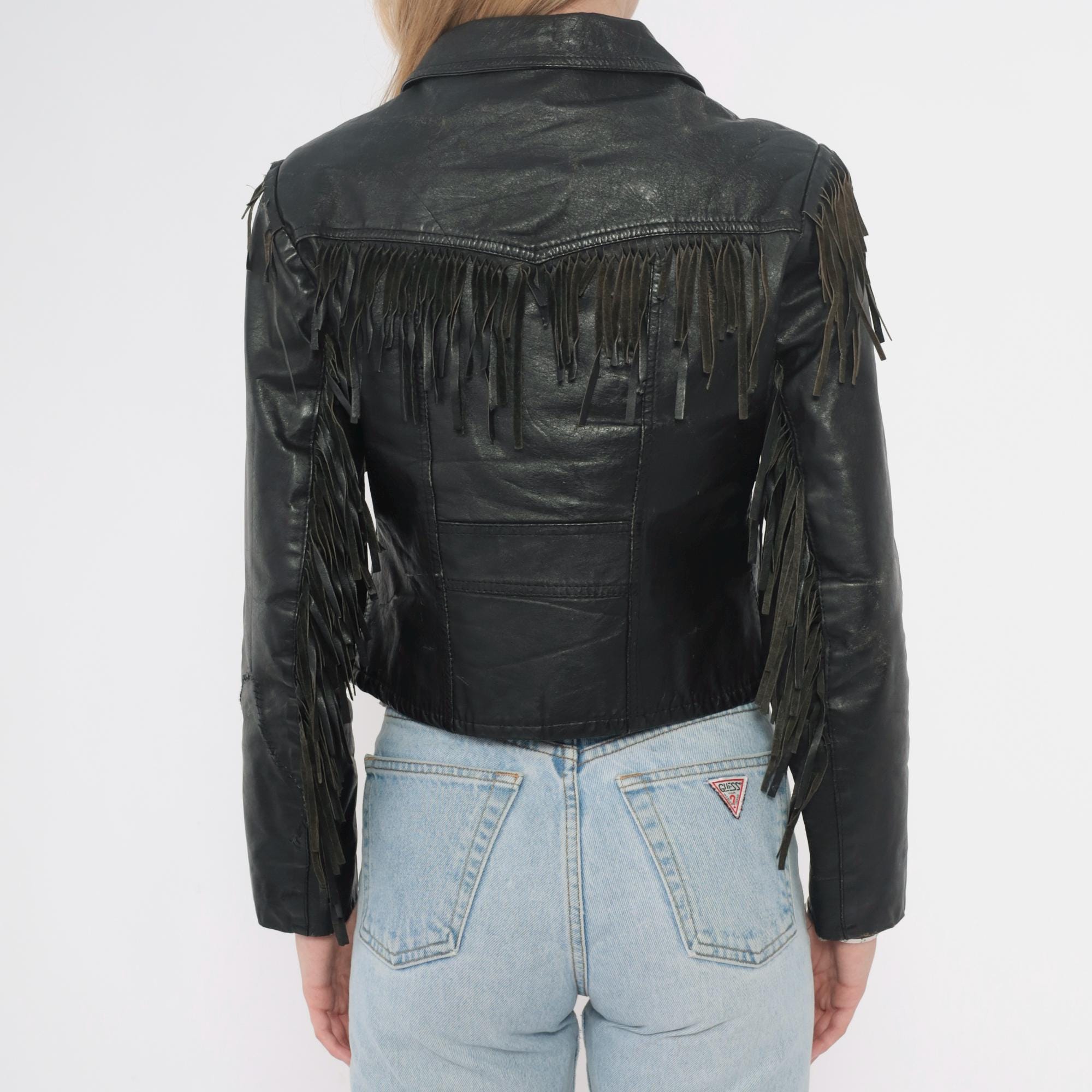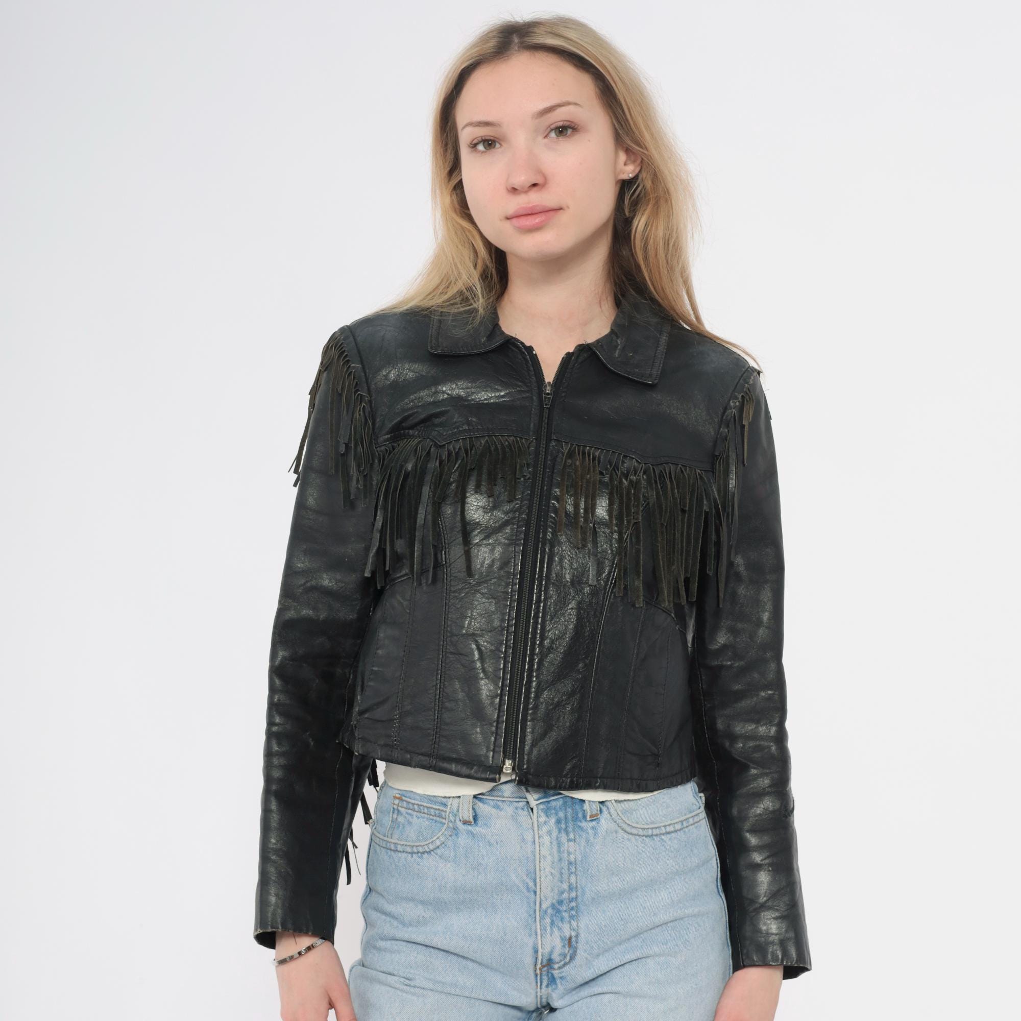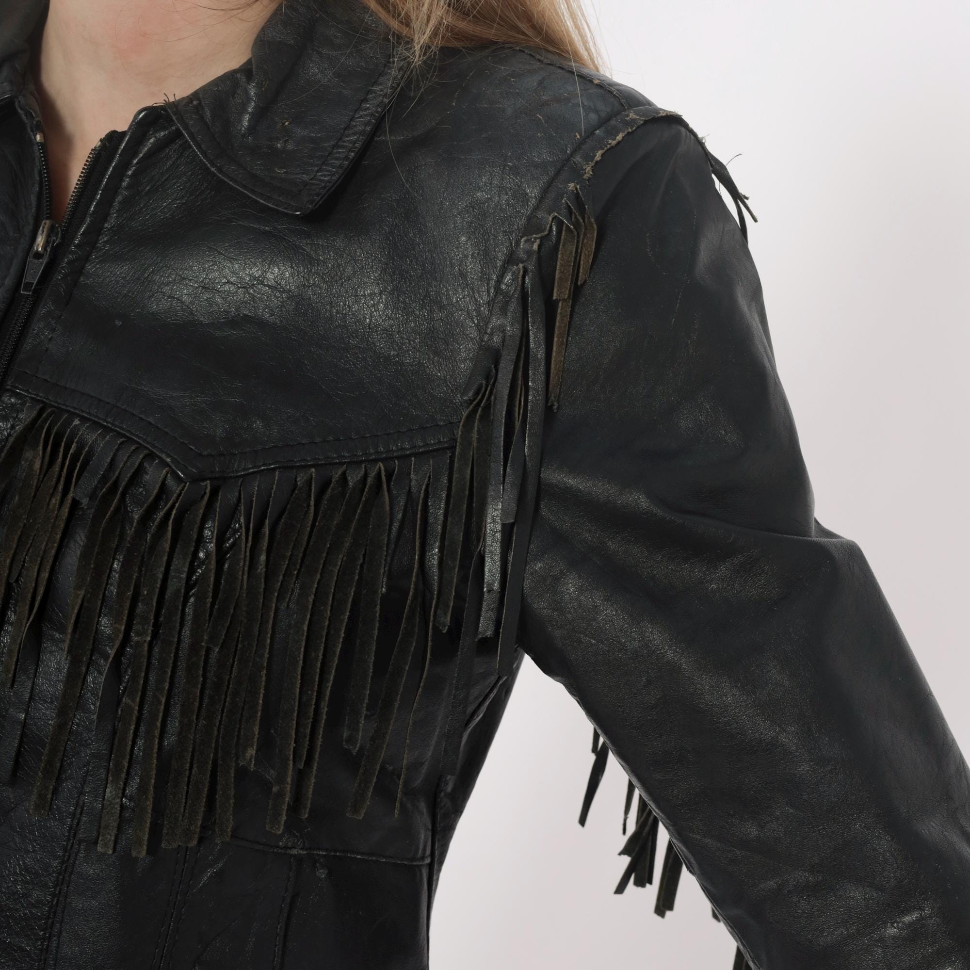 90s black leather fringe jacket from Jonathan Christopher with fringe detailing across the chest, back, shoulders, and along the sleeves. Zip front closure with collared neckline and cropped length. Distressed leather.