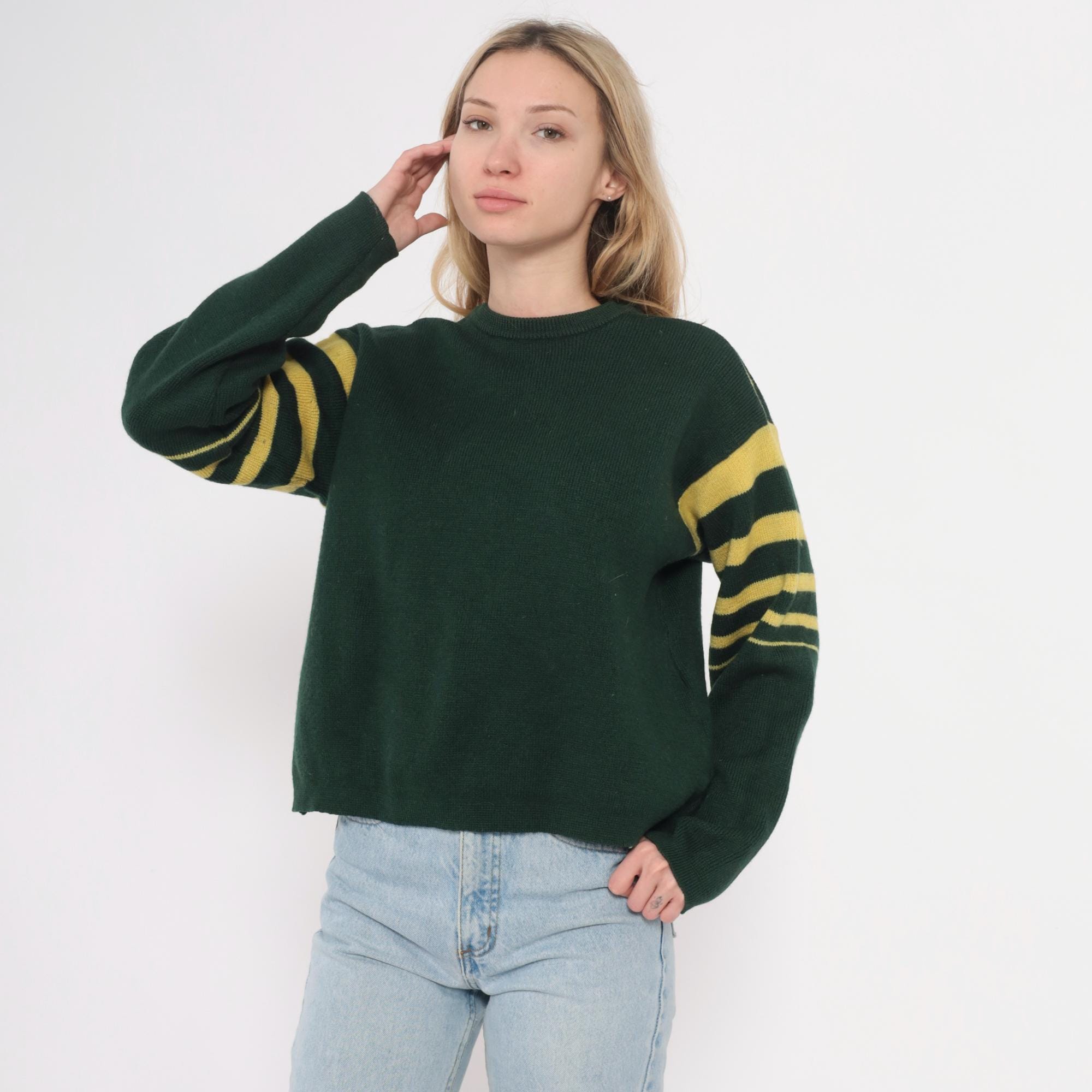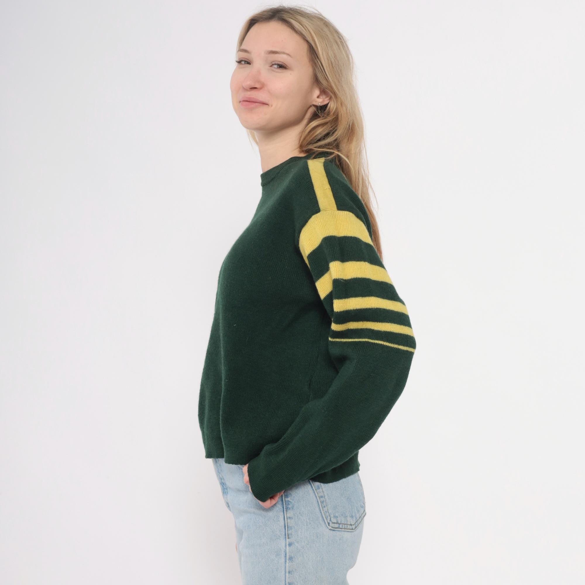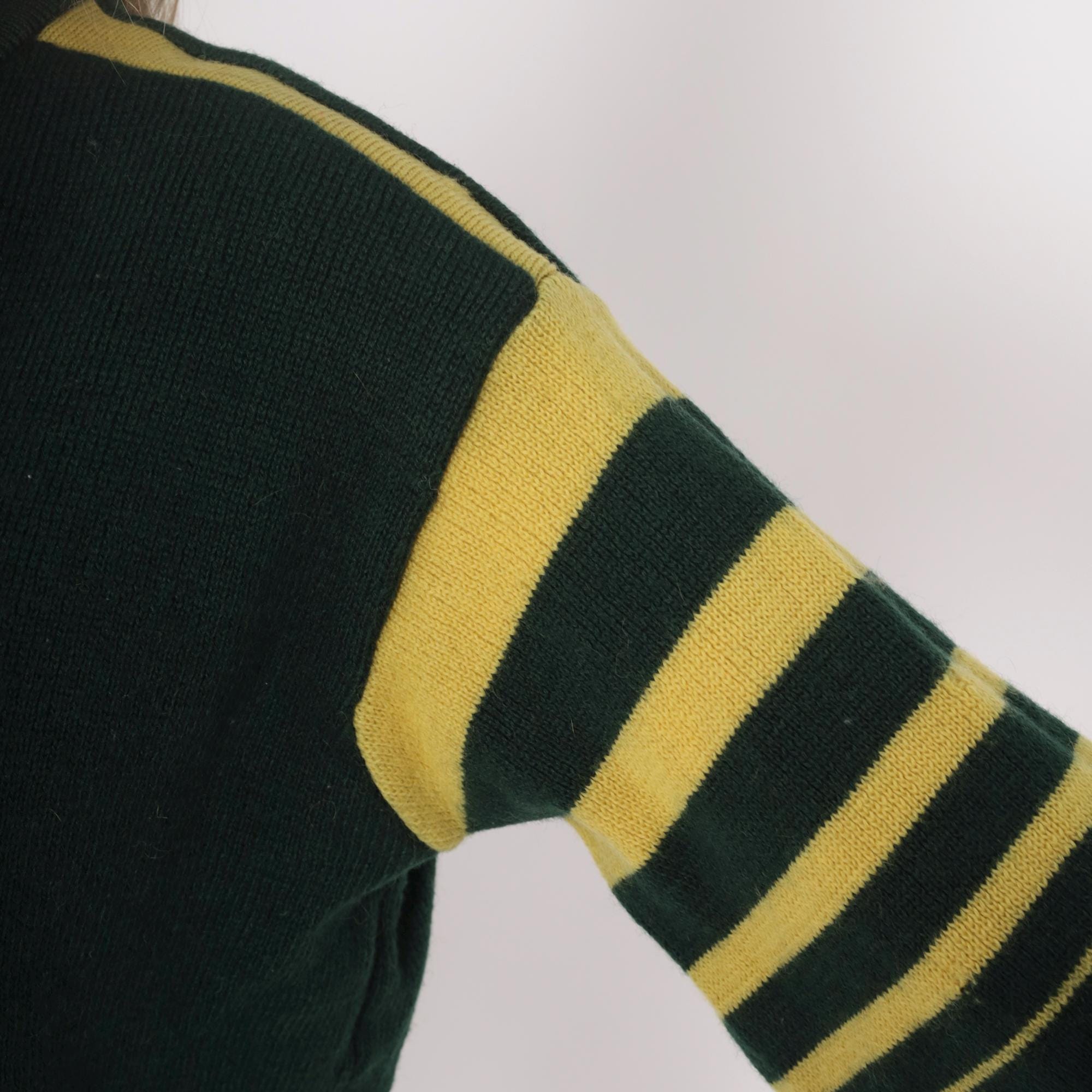 70s green wool sweater from norvyk by renoir with yellow and black horizontal striped sleeves. Solid green ribbed knit body, crew neckline, cropped hem with ribbed cuffs and waistband. Wool.