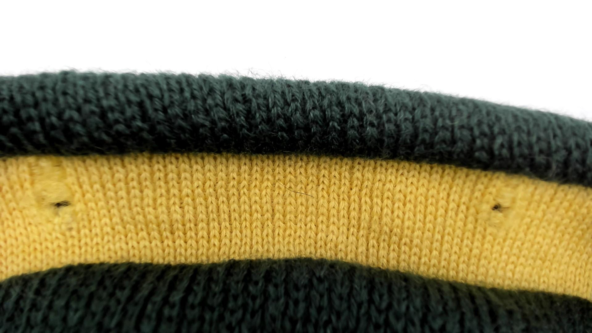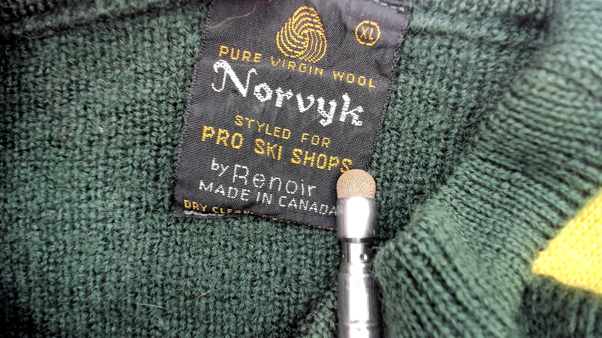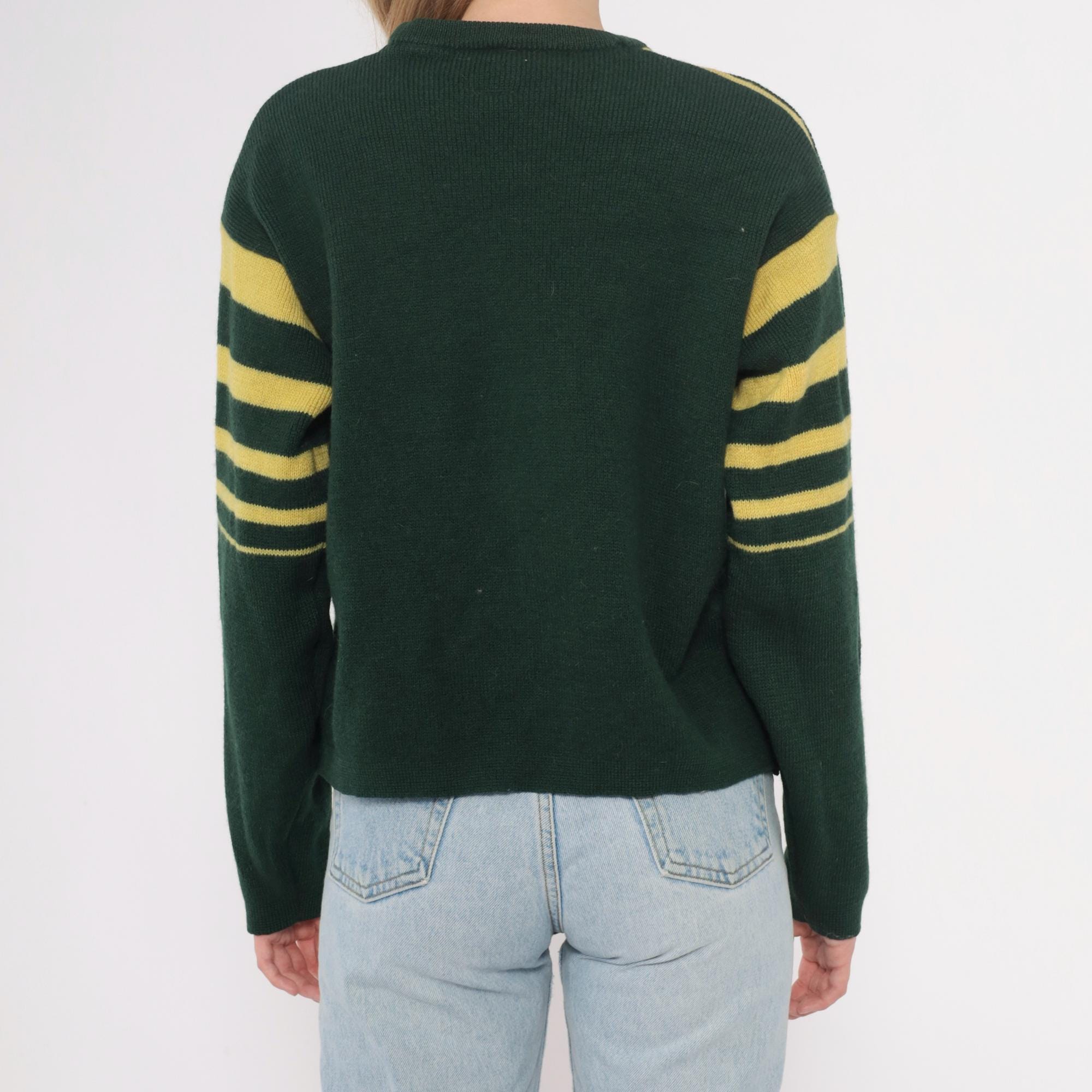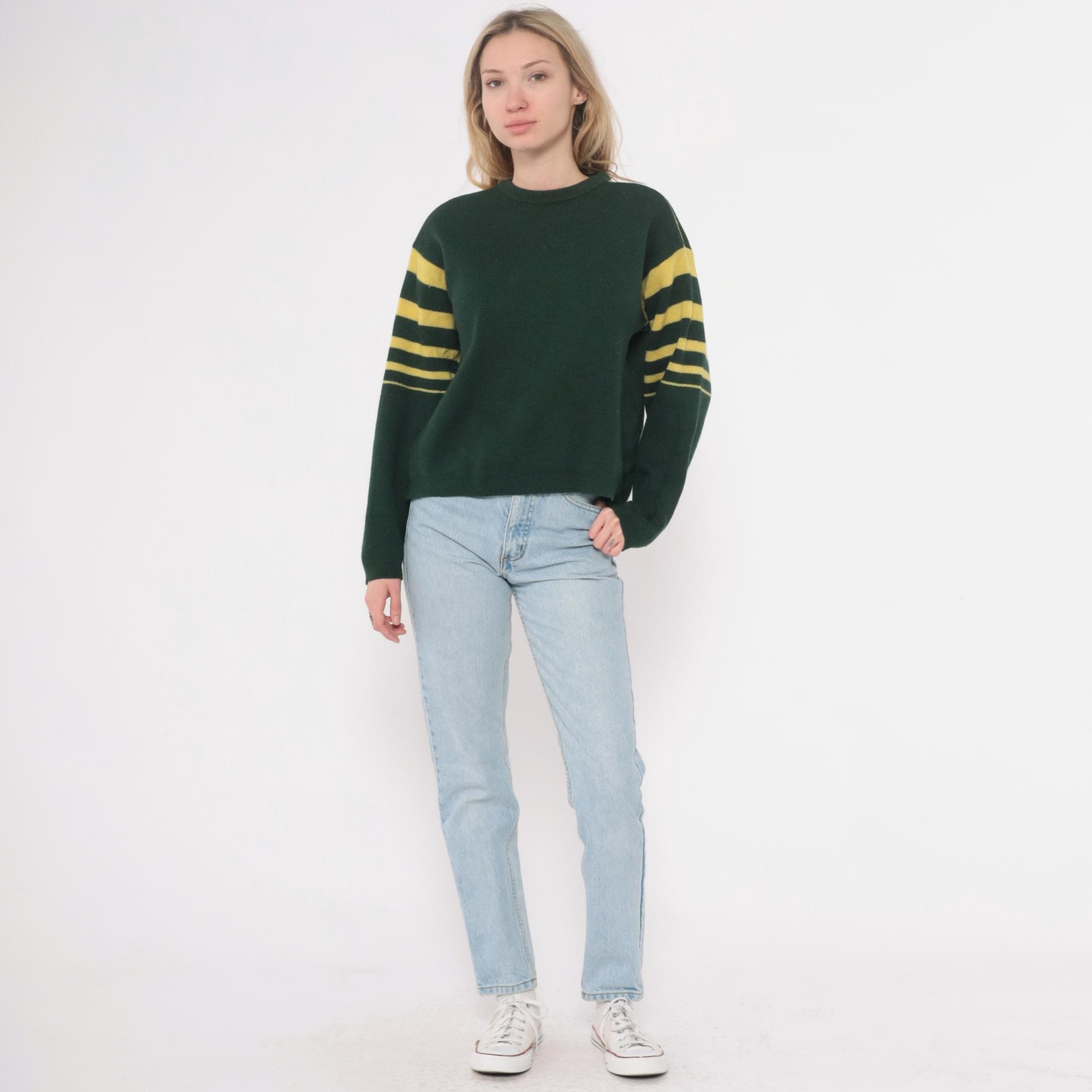 70s green wool sweater from norvyk by renoir with yellow and black horizontal striped sleeves. Solid green ribbed knit body, crew neckline, cropped hem with ribbed cuffs and waistband. Wool.
