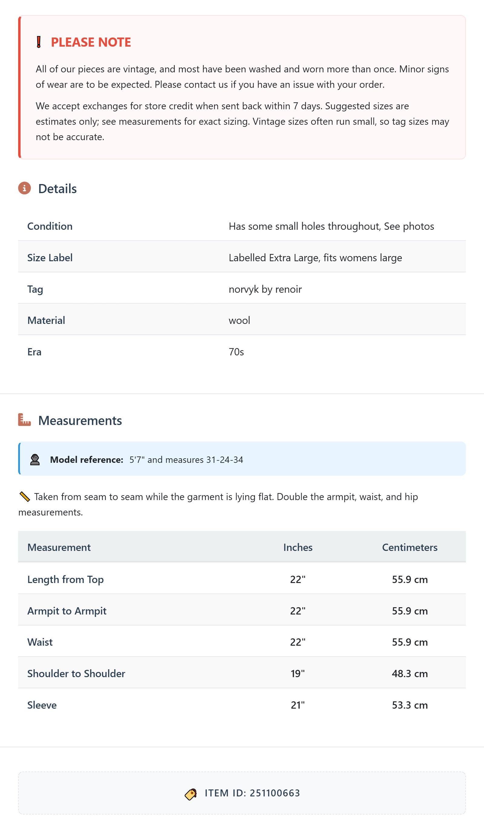 All of our pieces are vintage, and most have been washed and worn more than once. Minor signs of wear are to be expected. Please contact us if you have an issue with your order. We accept exchanges for store credit when sent back within 7 days.