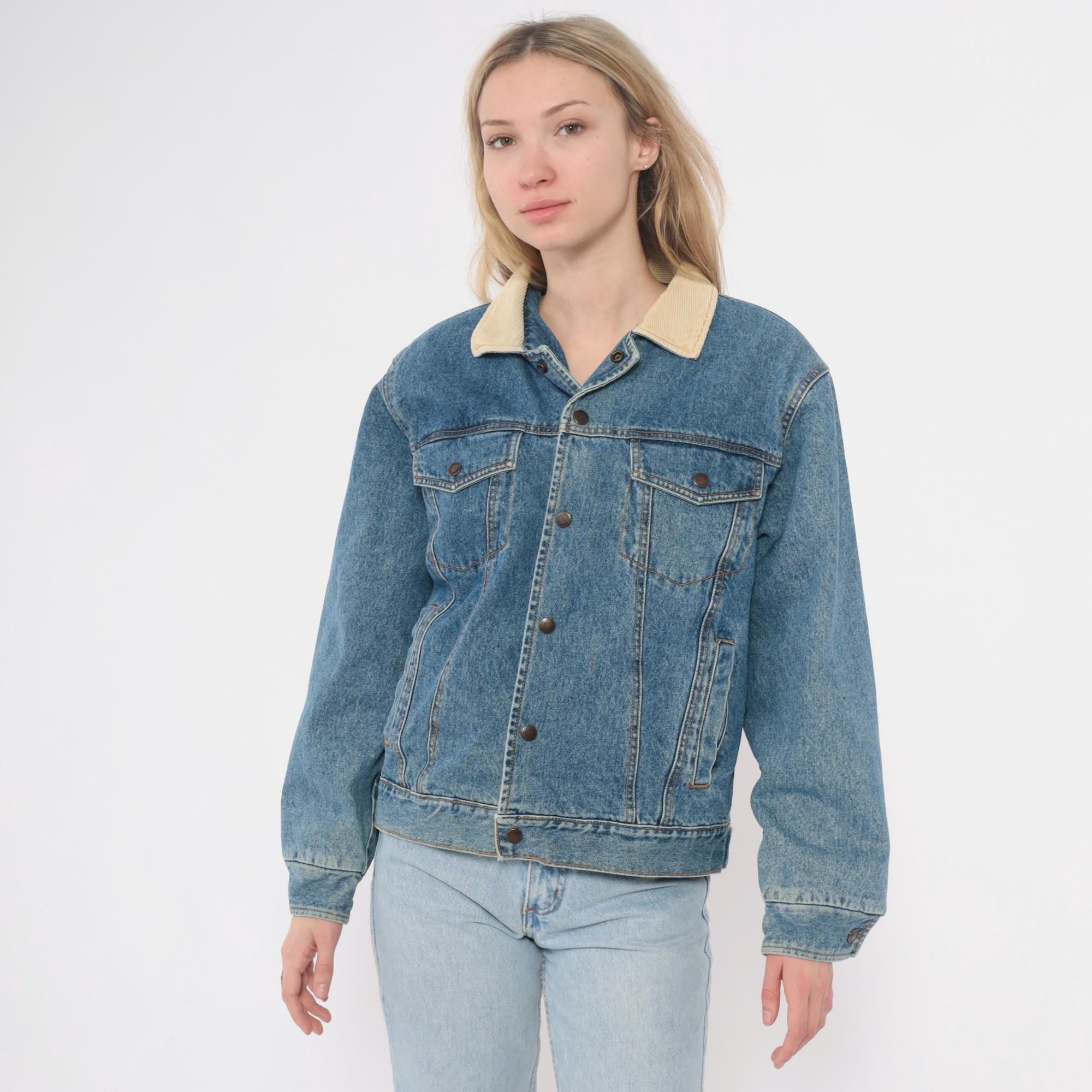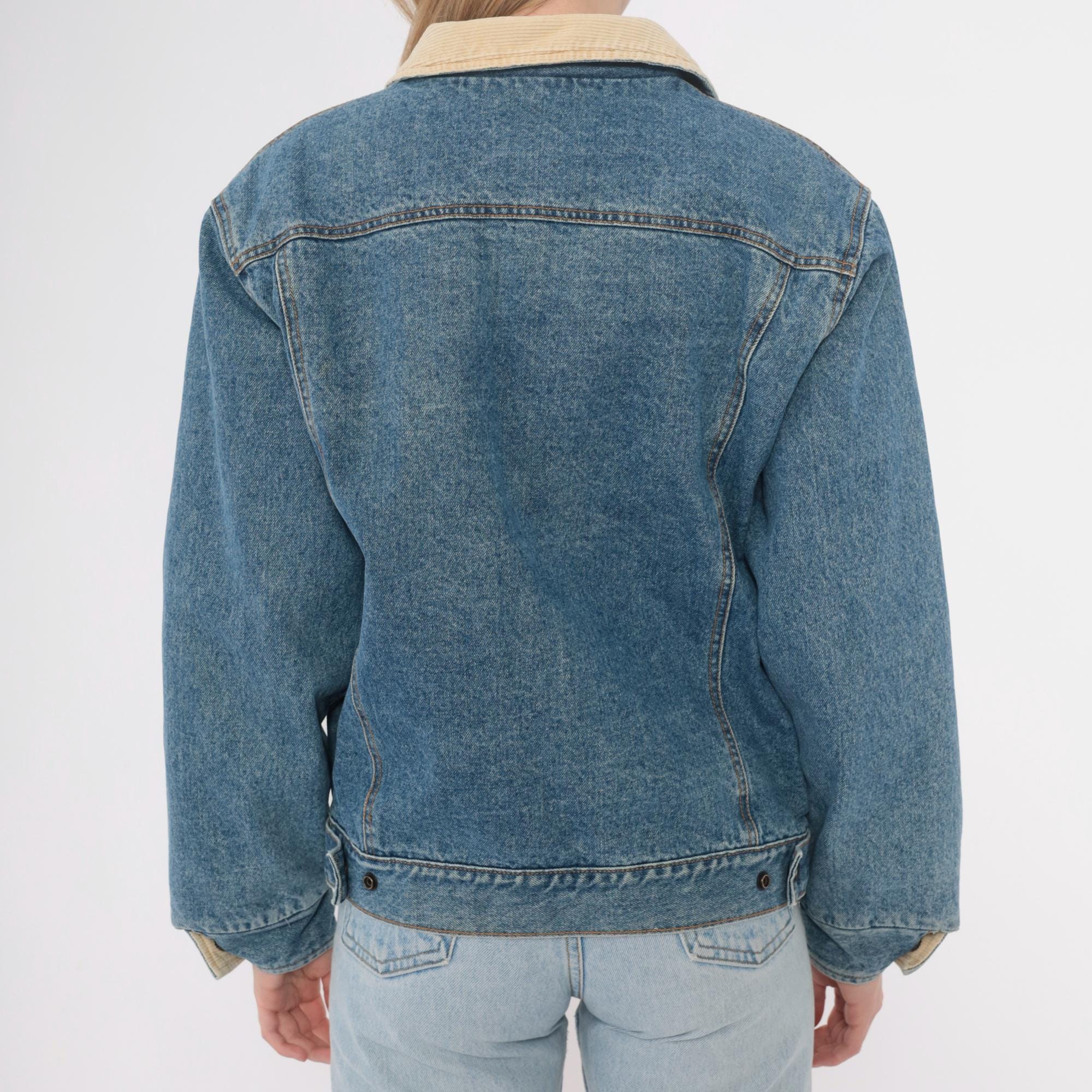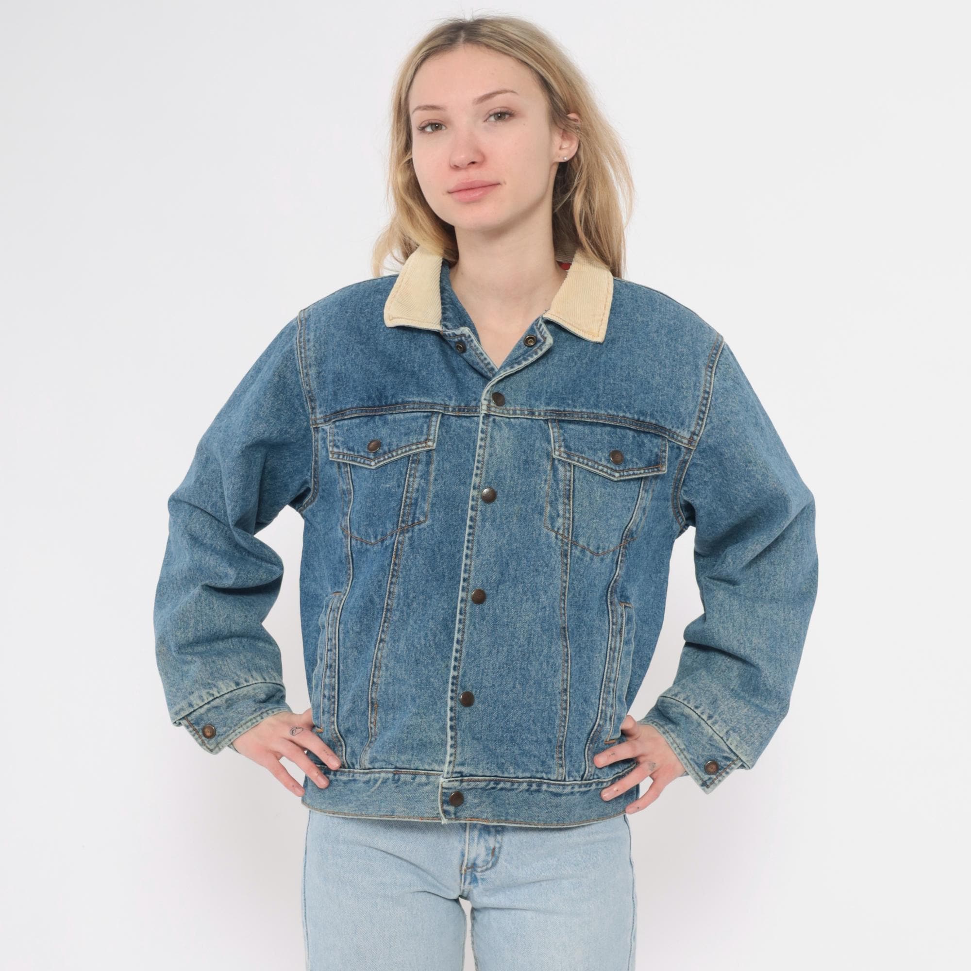90s denim jacket in medium blue wash with tan corduroy collar and red and black buffalo check flannel lining. Classic trucker style with button front closure, chest flap pockets, and long sleeves. Cotton denim outer shell. Tagged size Medium.