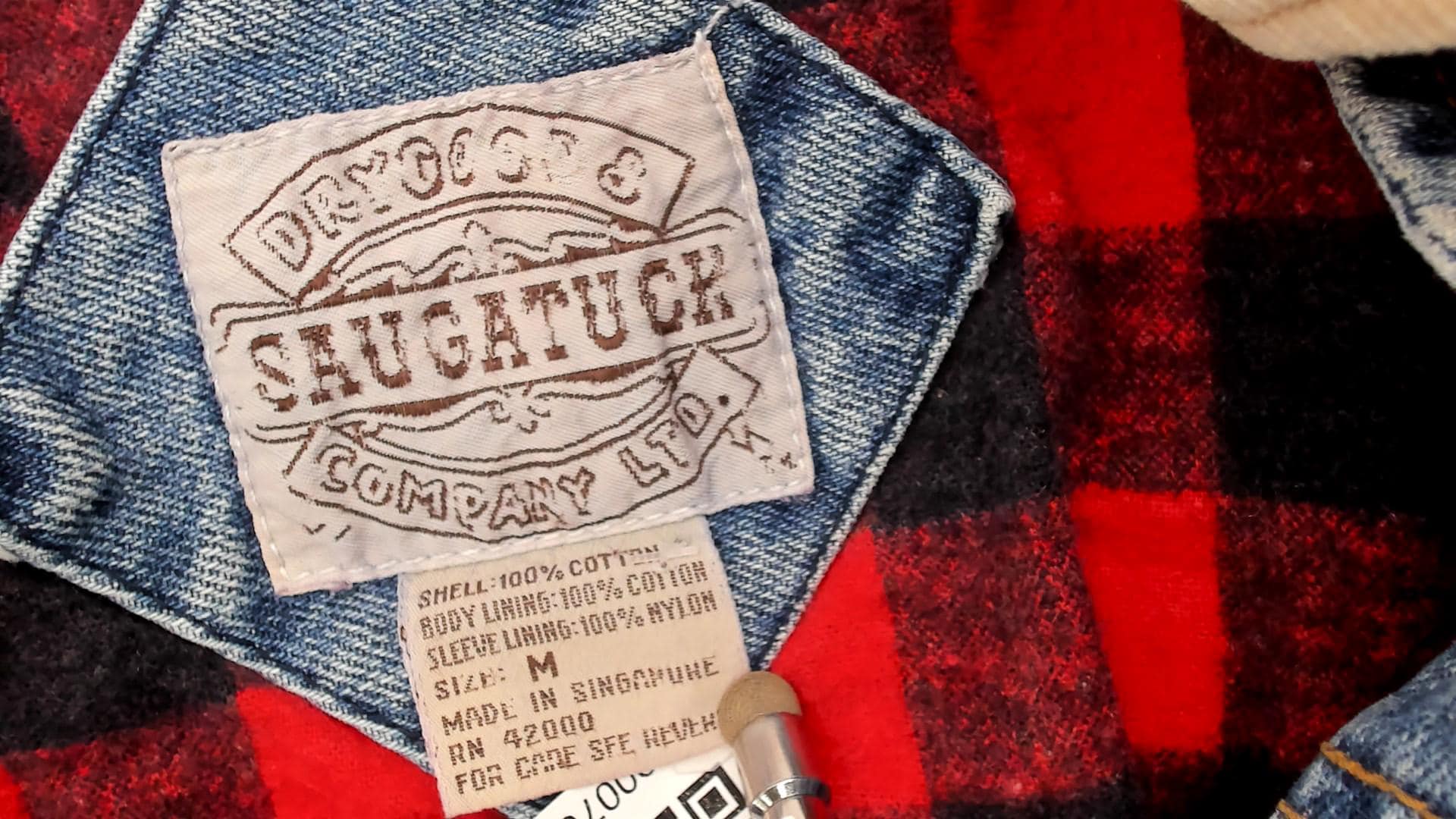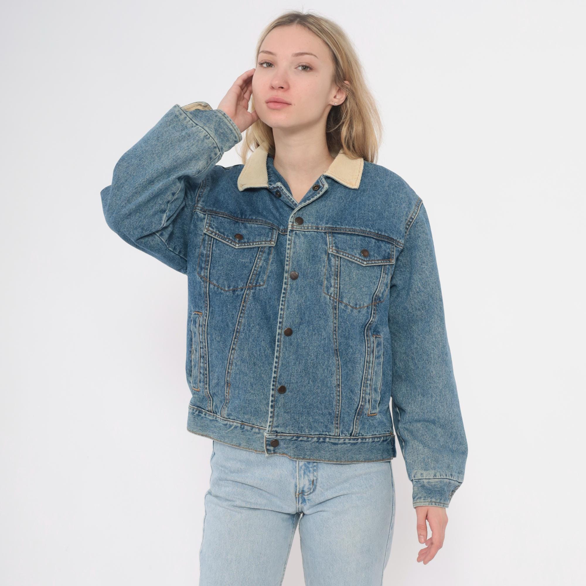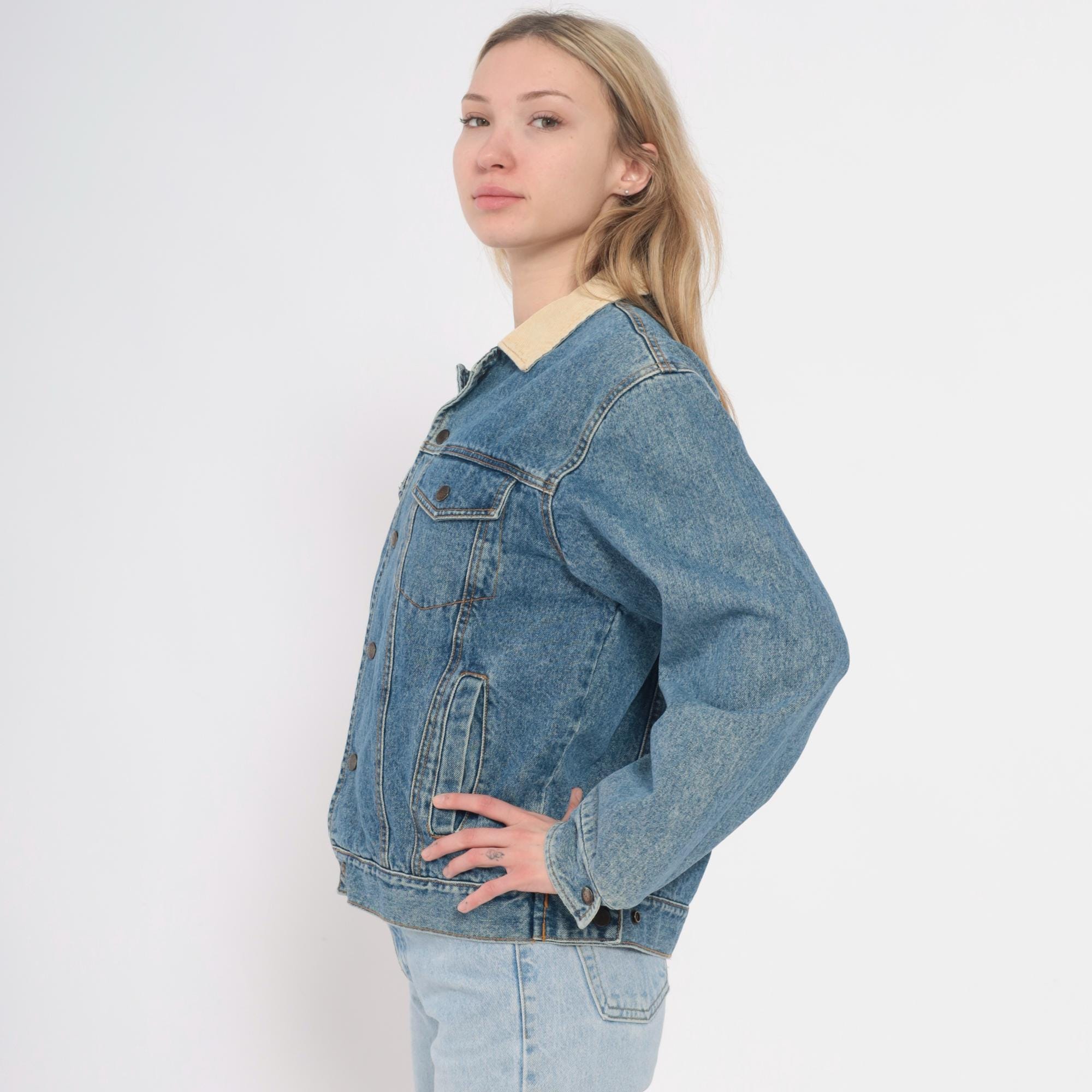 90s denim jacket in medium blue wash with tan corduroy collar and red and black buffalo check flannel lining. Classic trucker style with button front closure, chest flap pockets, and long sleeves. Cotton denim outer shell. Tagged size Medium.