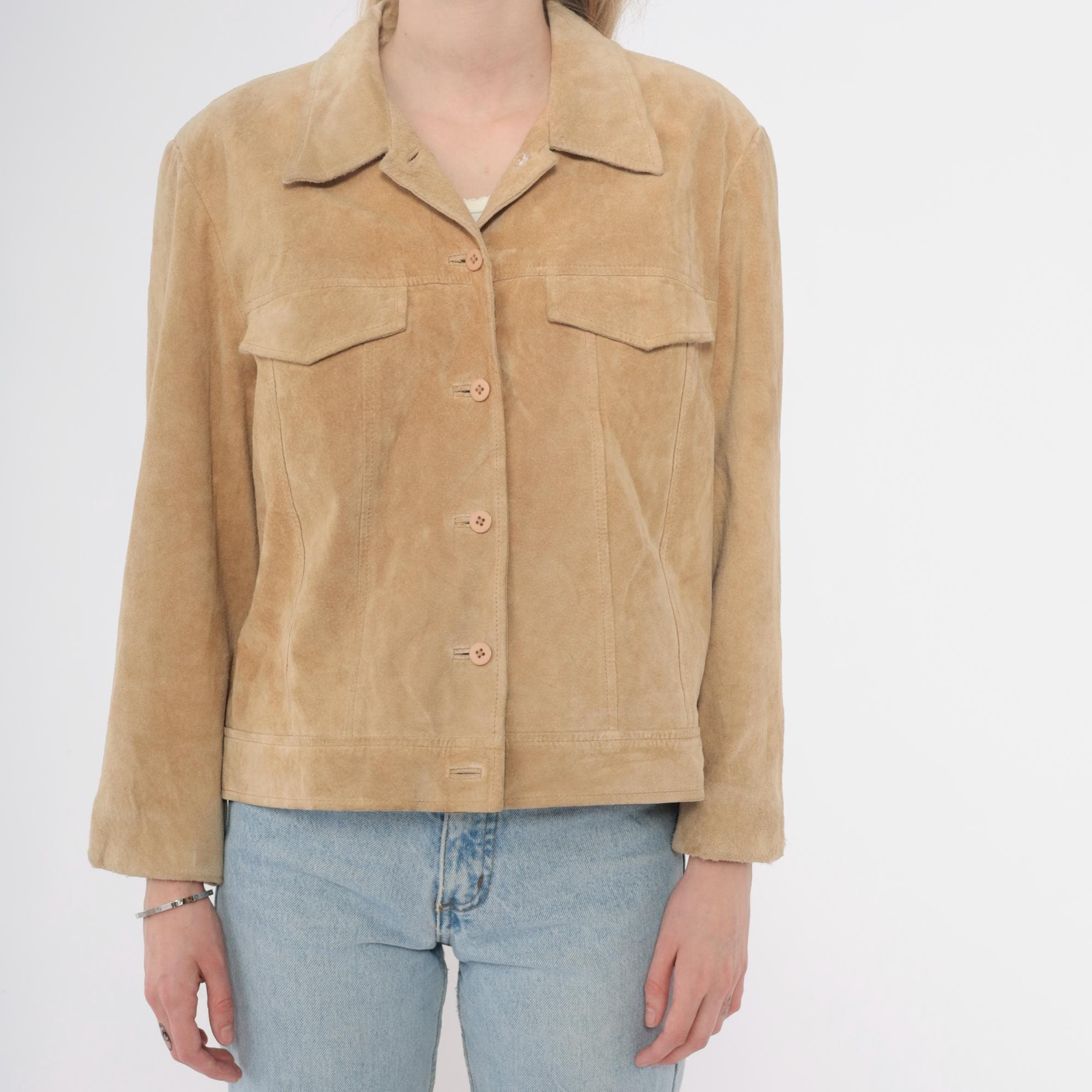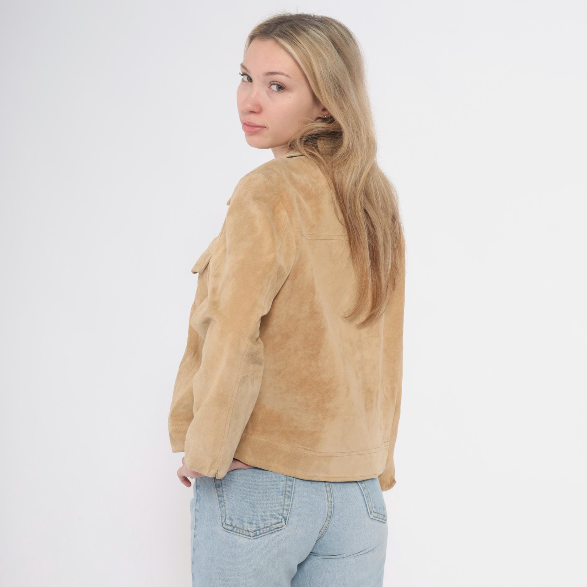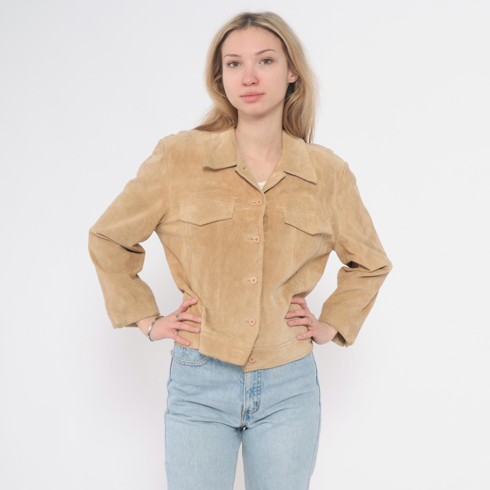 Y2K tan suede jacket from Willi Smith Collection with pointed collar, button front closure, and two chest pockets with flap closures. Cropped length hitting at the hip with a boxy, relaxed fit and long sleeves. Leather. Tagged size Medium.