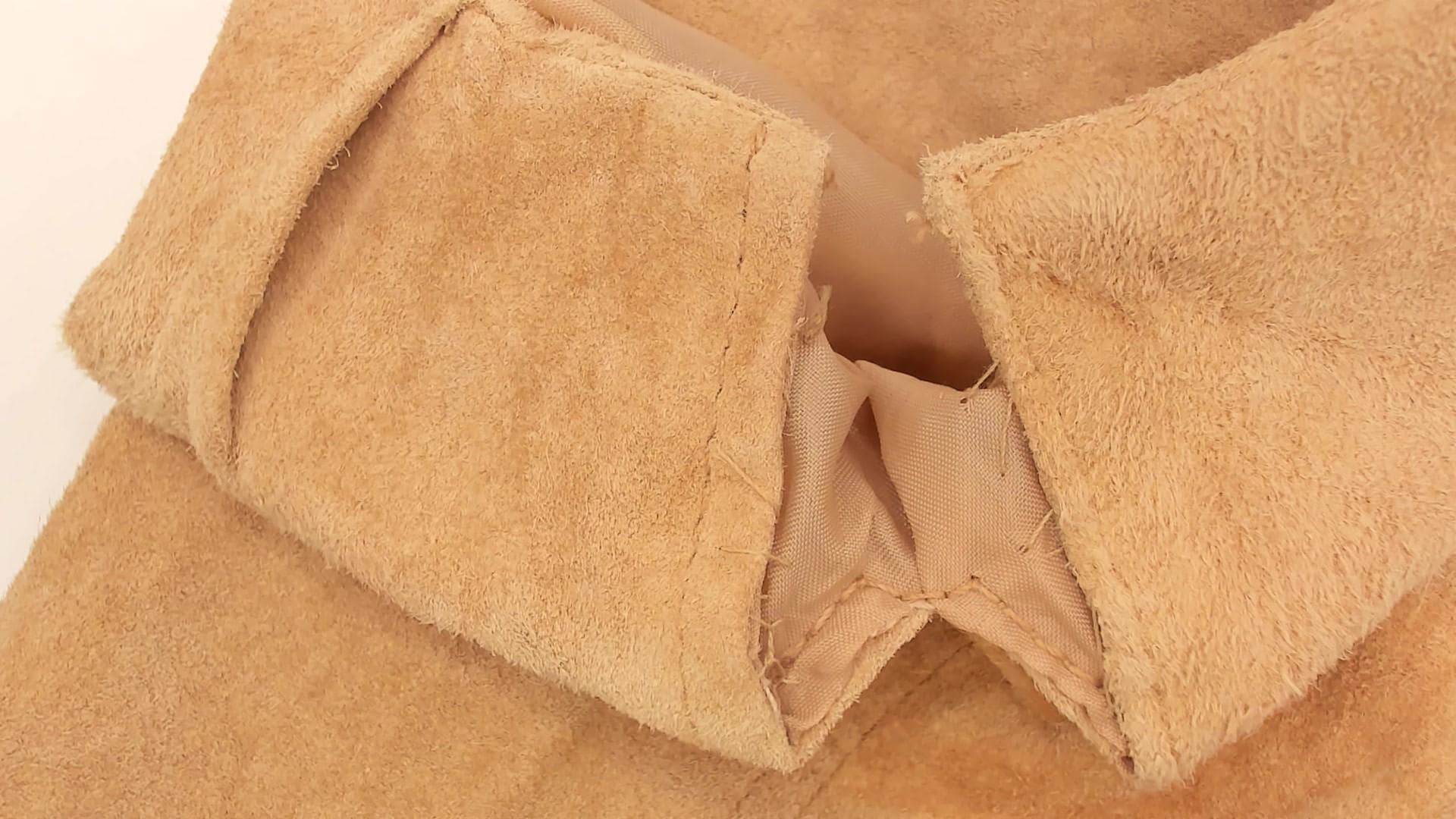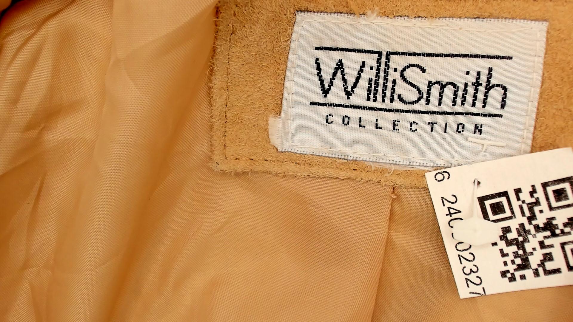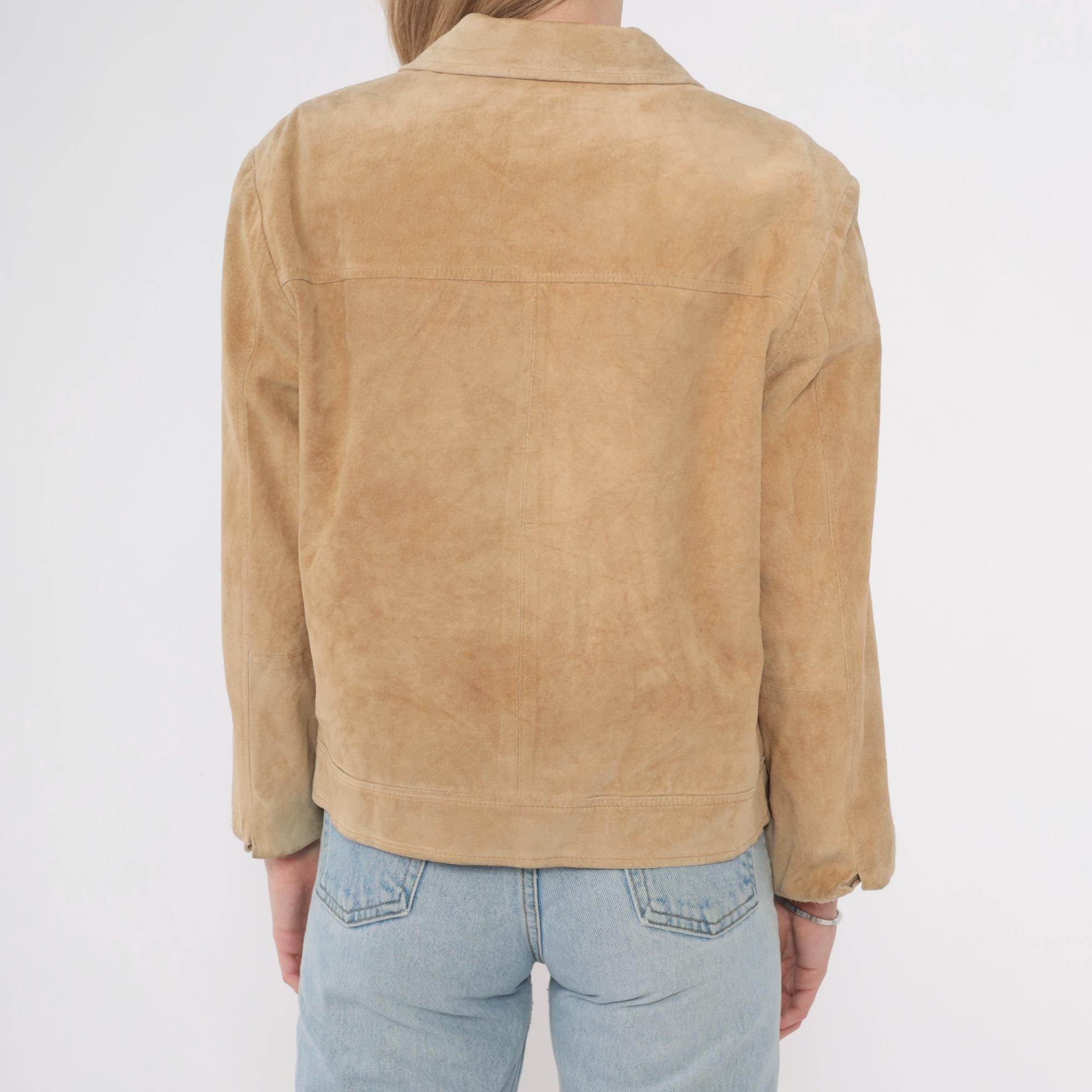 Y2K tan suede jacket from Willi Smith Collection with pointed collar, button front closure, and two chest pockets with flap closures. Cropped length hitting at the hip with a boxy, relaxed fit and long sleeves. Leather. Tagged size Medium.