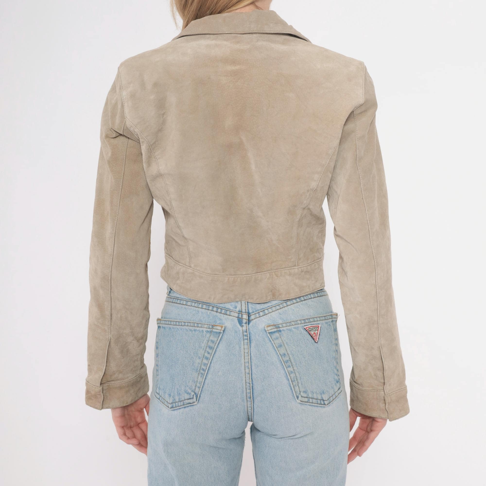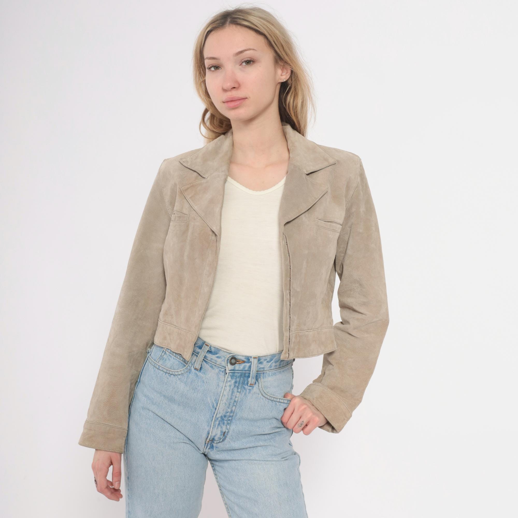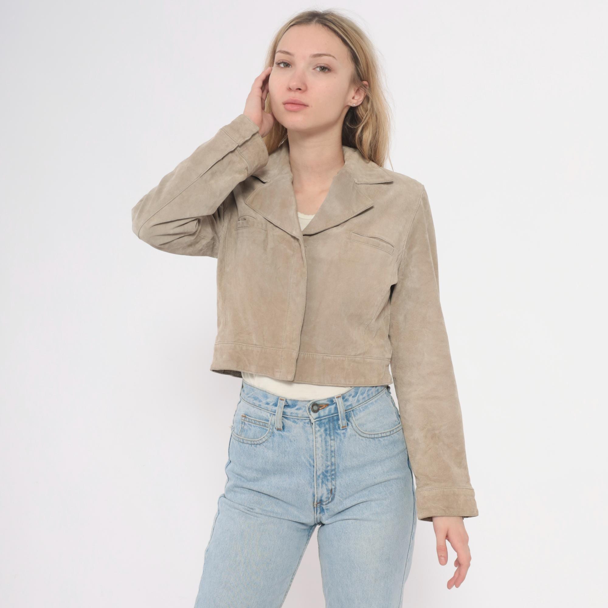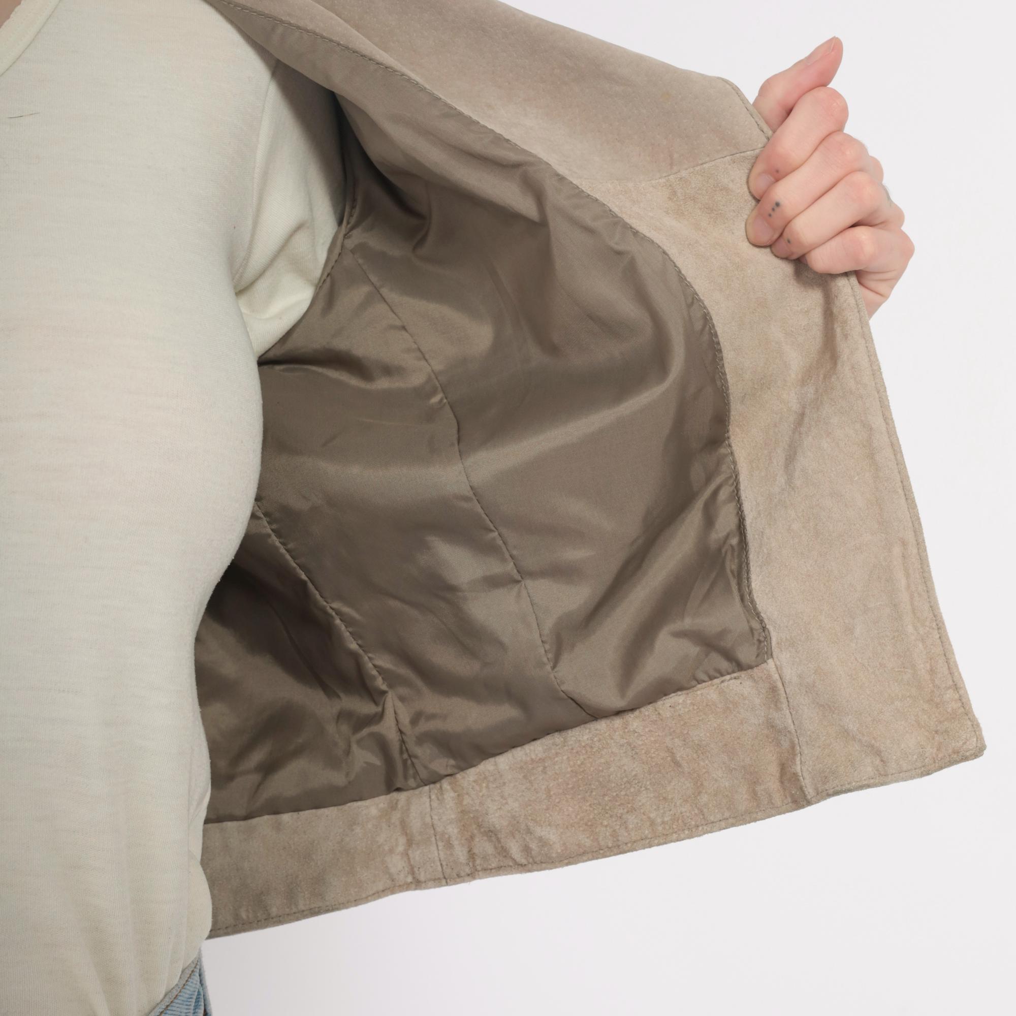 90s beige suede leather jacket from Newport News with notched collar and concealed front closure. Cropped silhouette with long sleeves, chest pockets with flap detail, and interior lining. Tagged size 6.