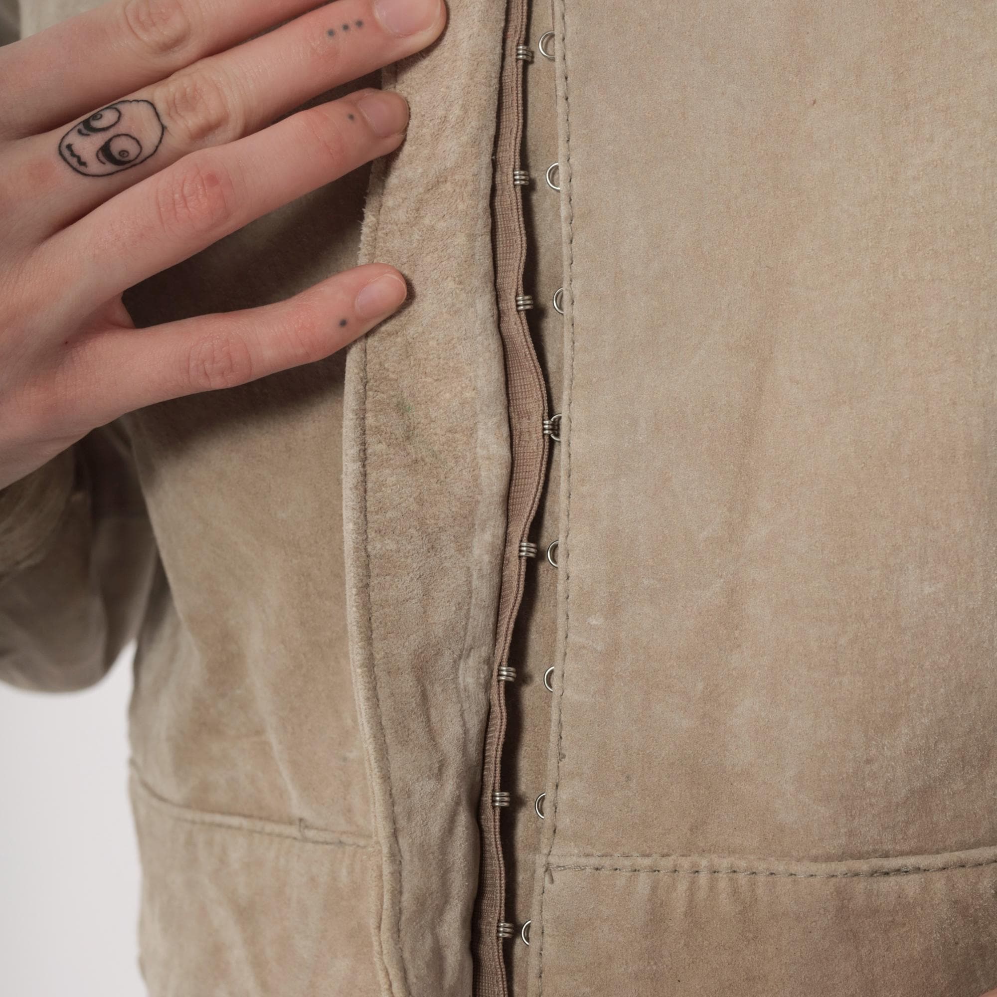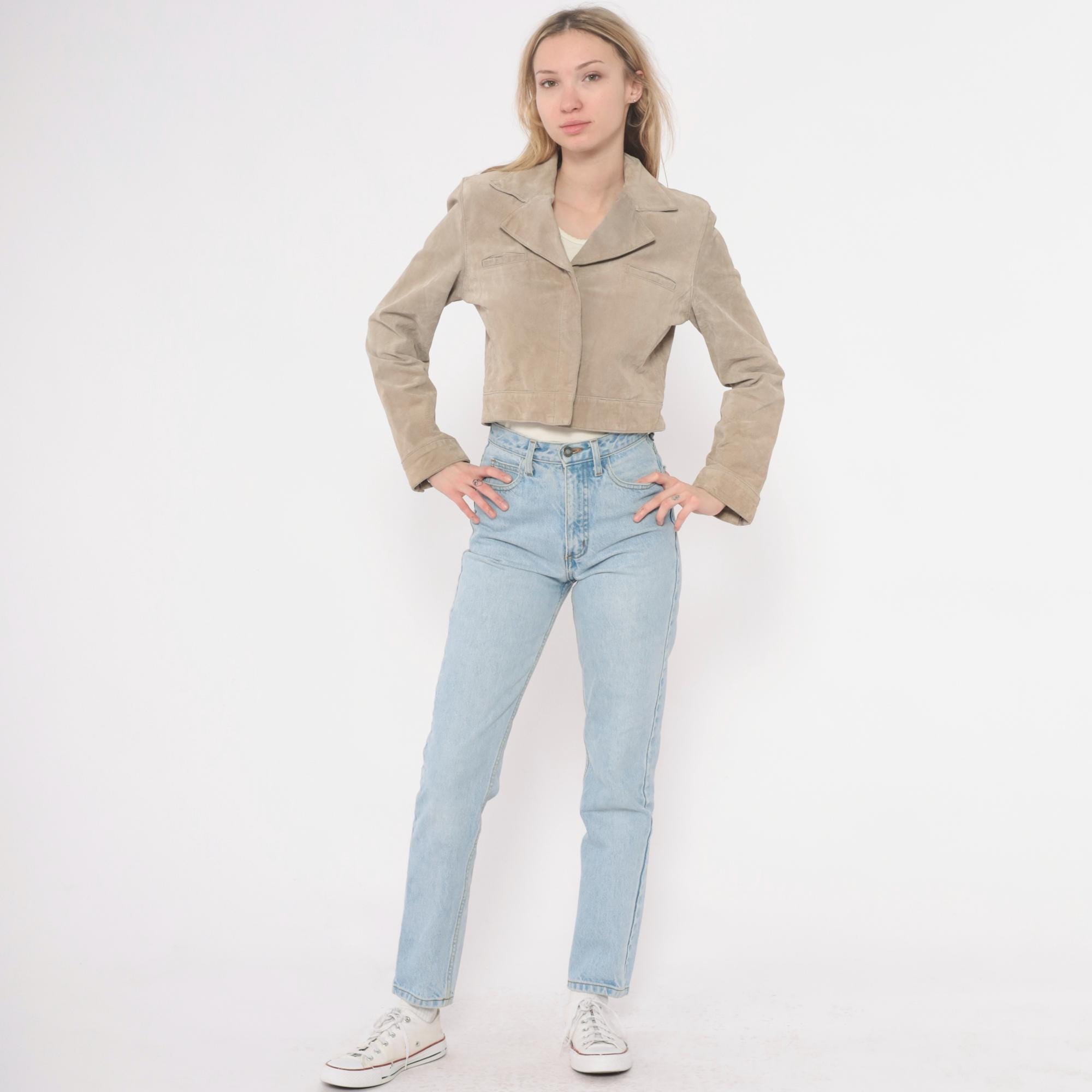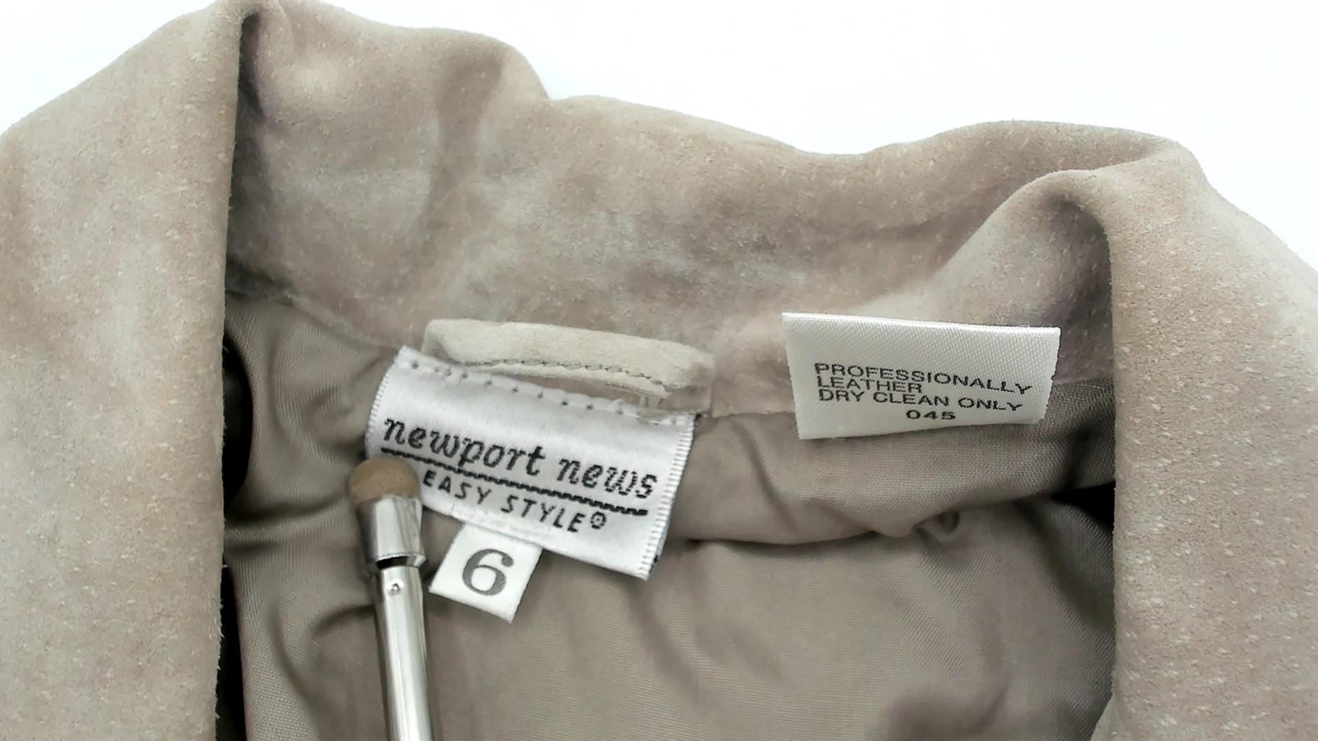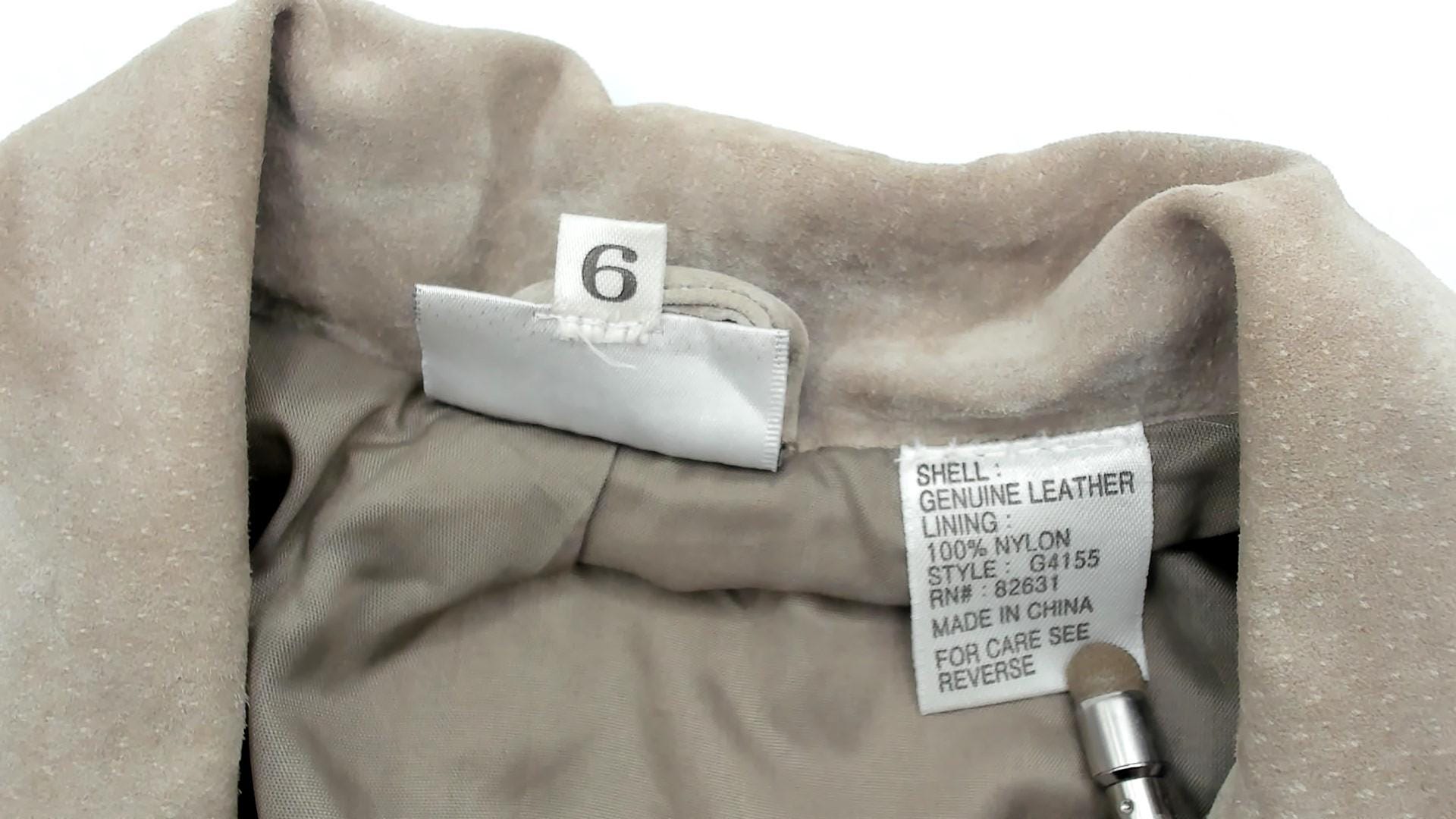 90s beige suede leather jacket from Newport News with notched collar and concealed front closure. Cropped silhouette with long sleeves, chest pockets with flap detail, and interior lining. Tagged size 6.