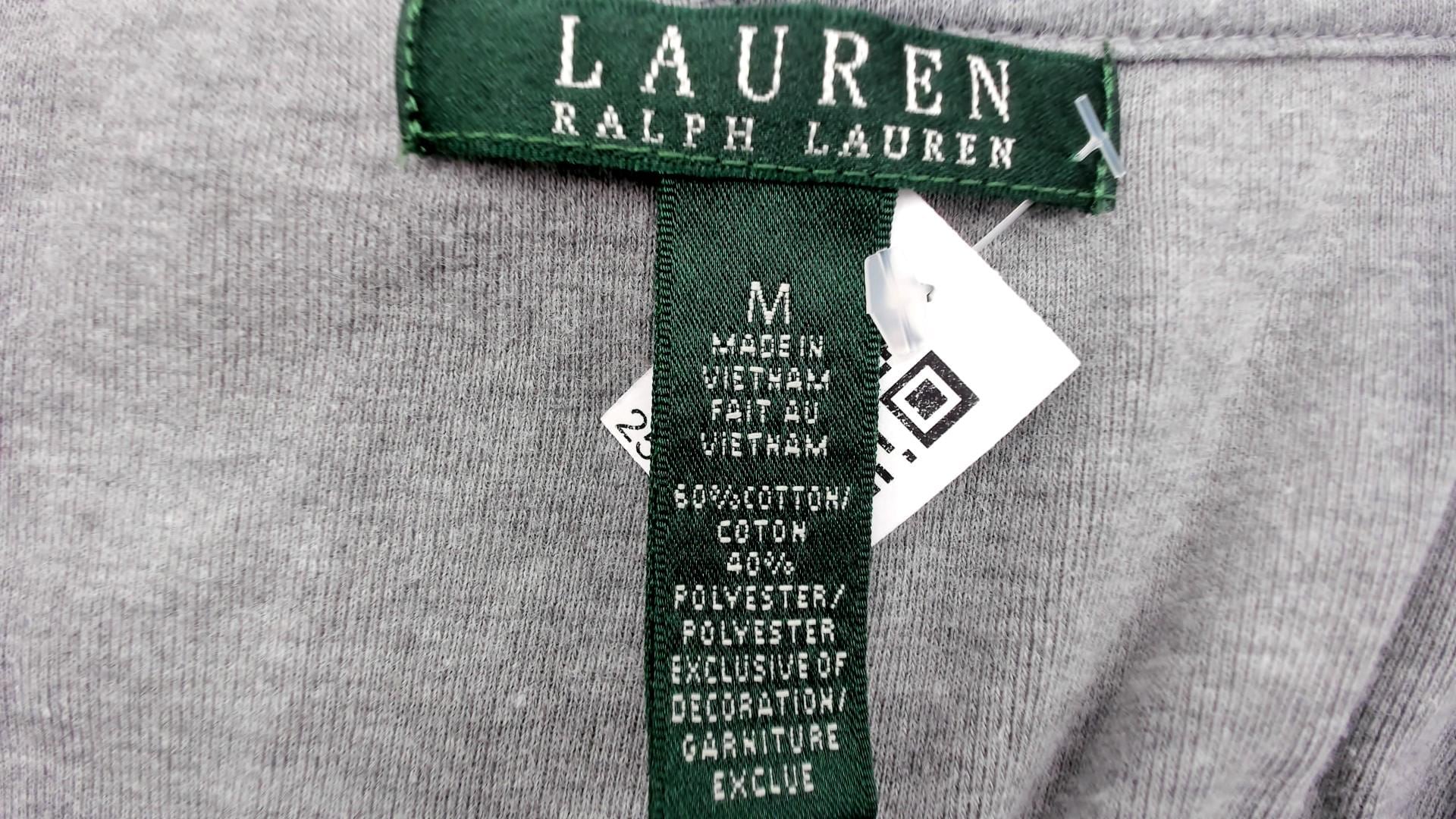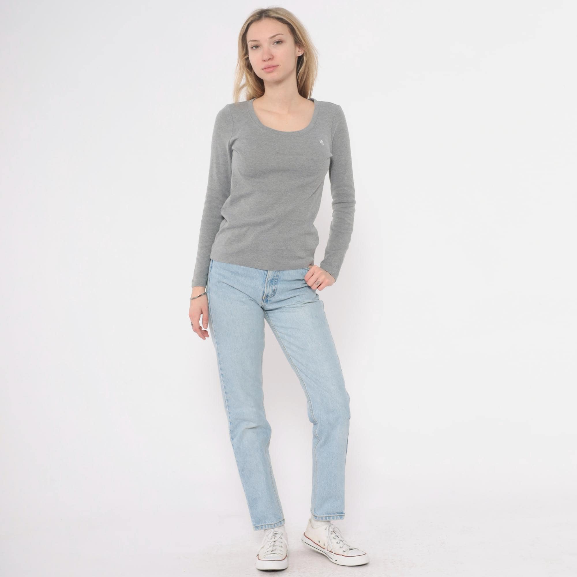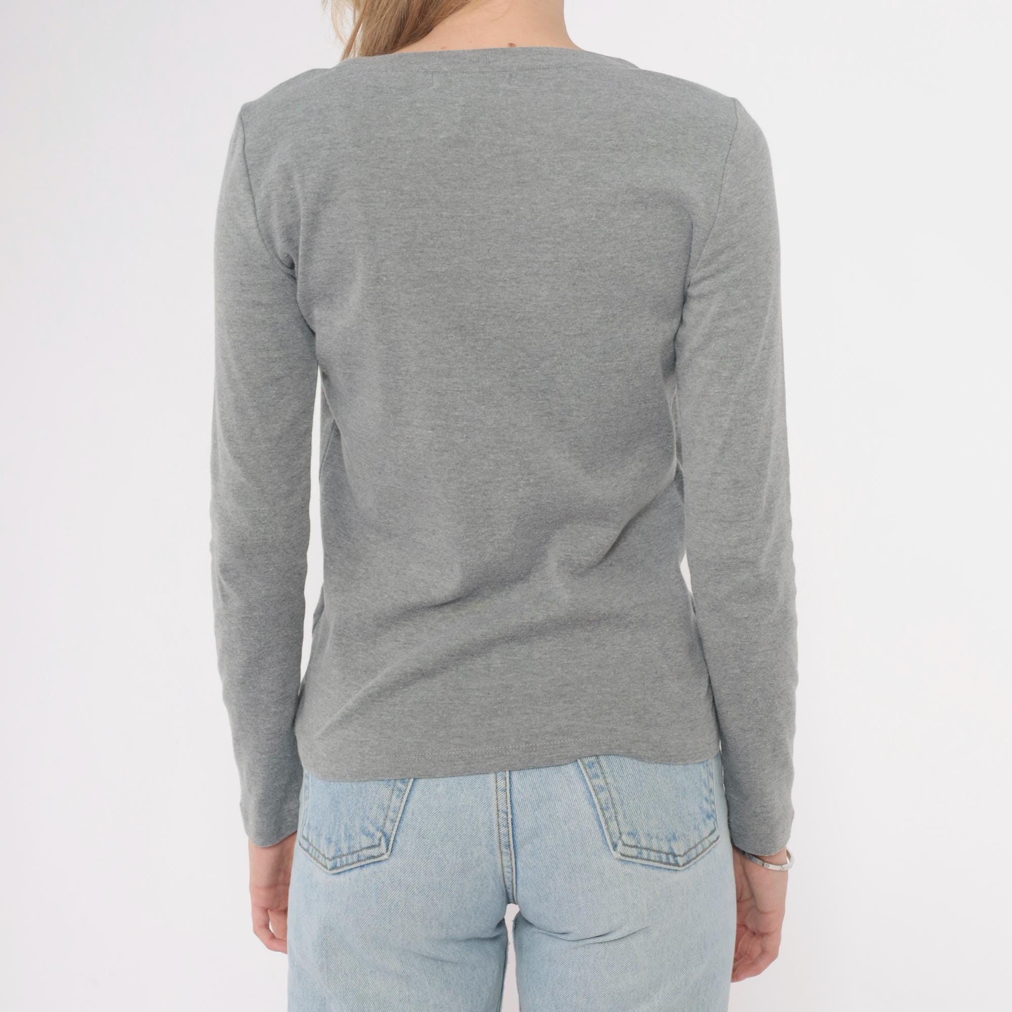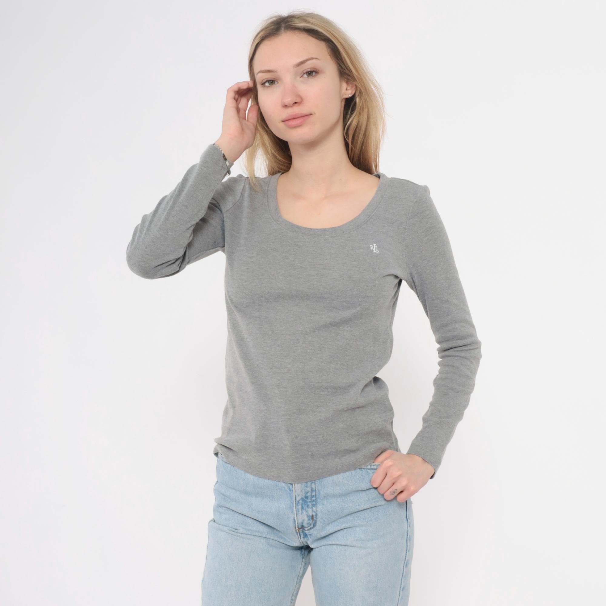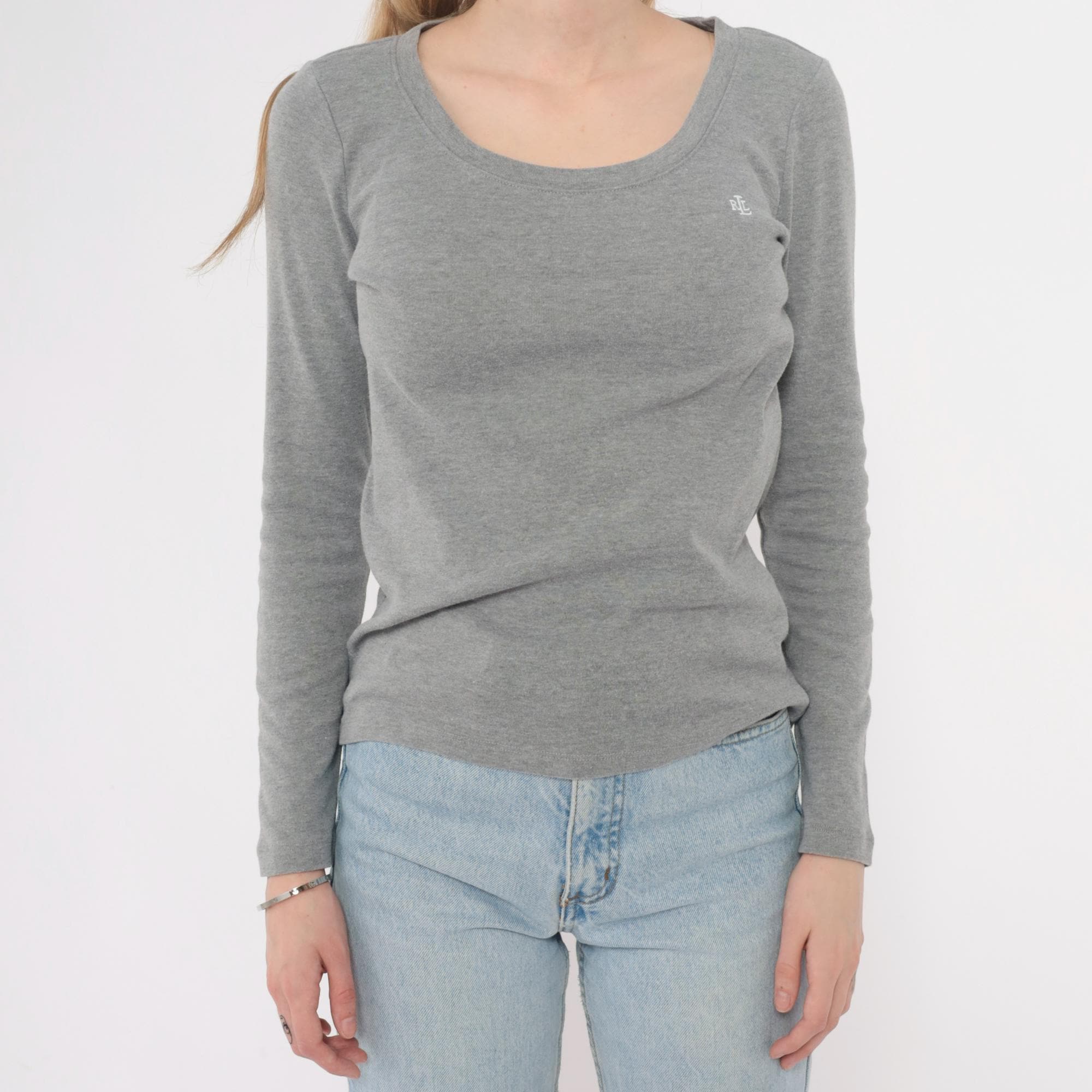 Y2K grey long-sleeve top from Ralph Lauren with scoop neckline and fitted silhouette. Small embroidered RL logo on left chest. Cotton and polyester blend. Tagged size Medium.