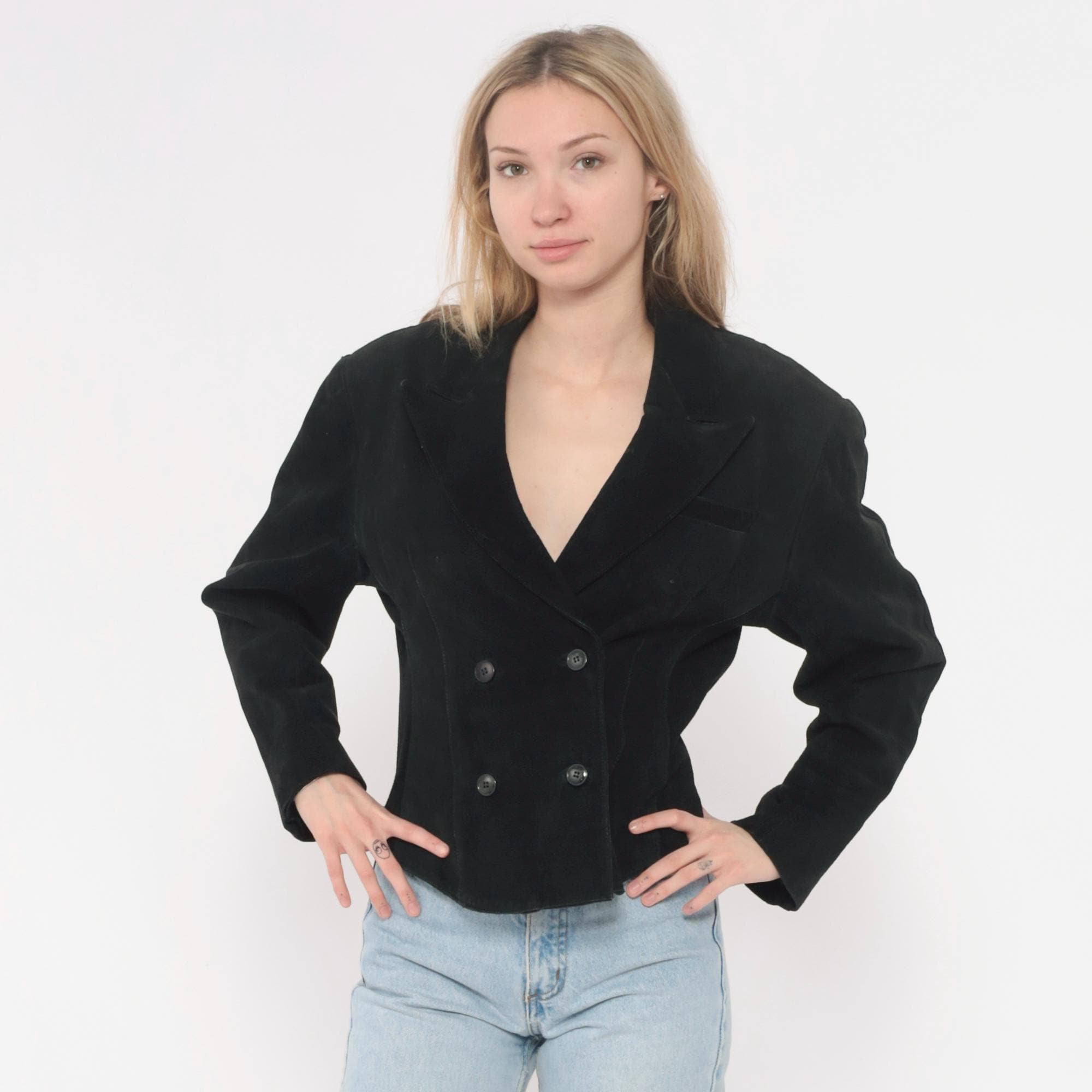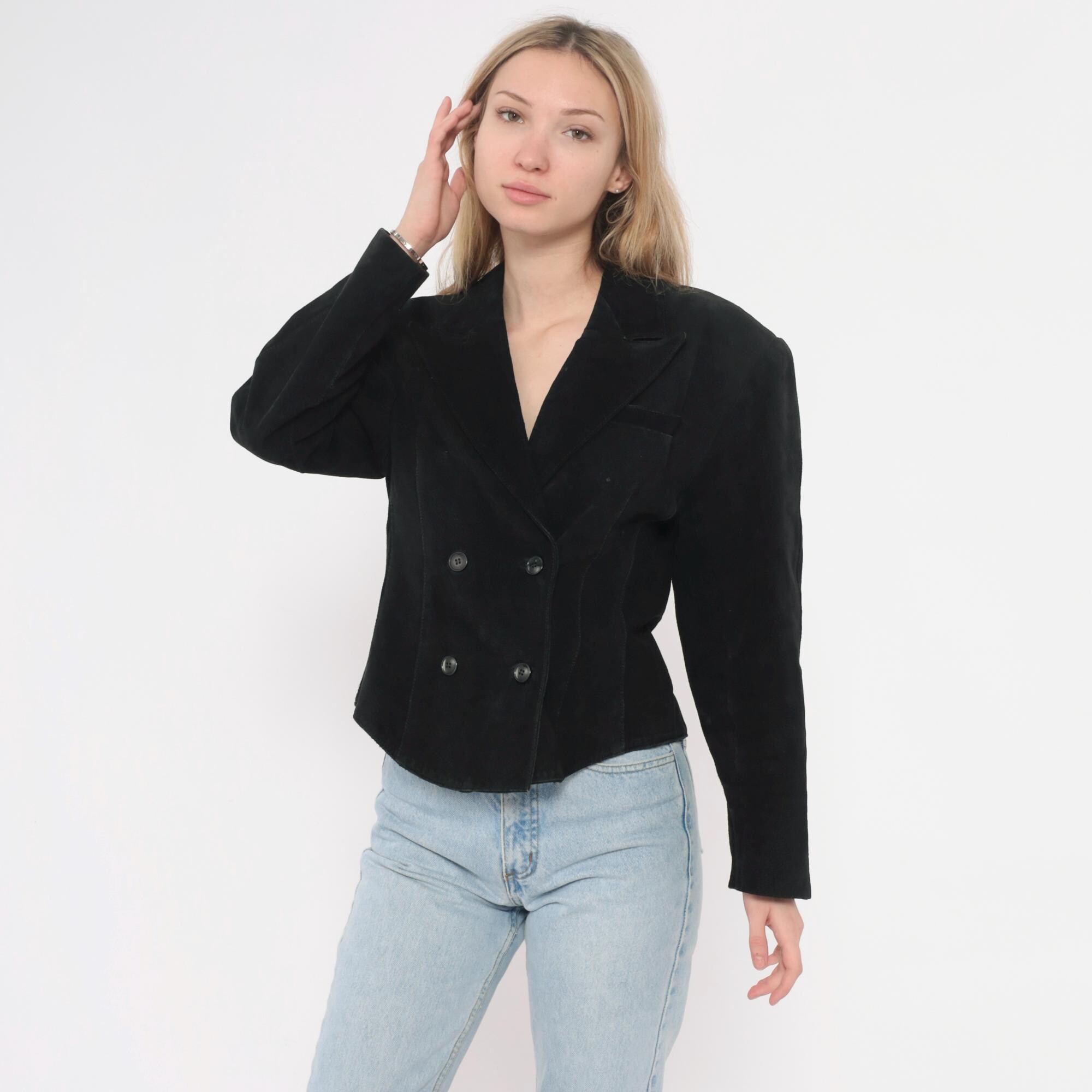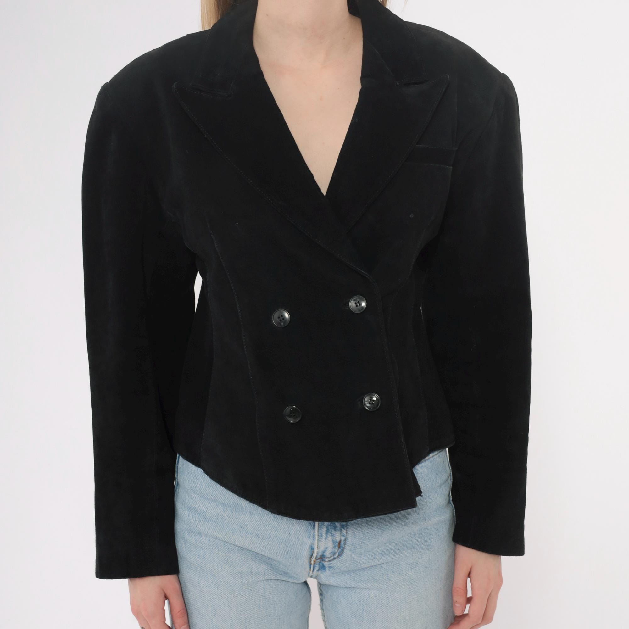 90s black suede double-breasted jacket from Winlit with notched collar and wide lapels. Four-button front closure arranged in two columns, structured shoulders, cropped length ending at hip. Suede throughout. Tagged size Small.