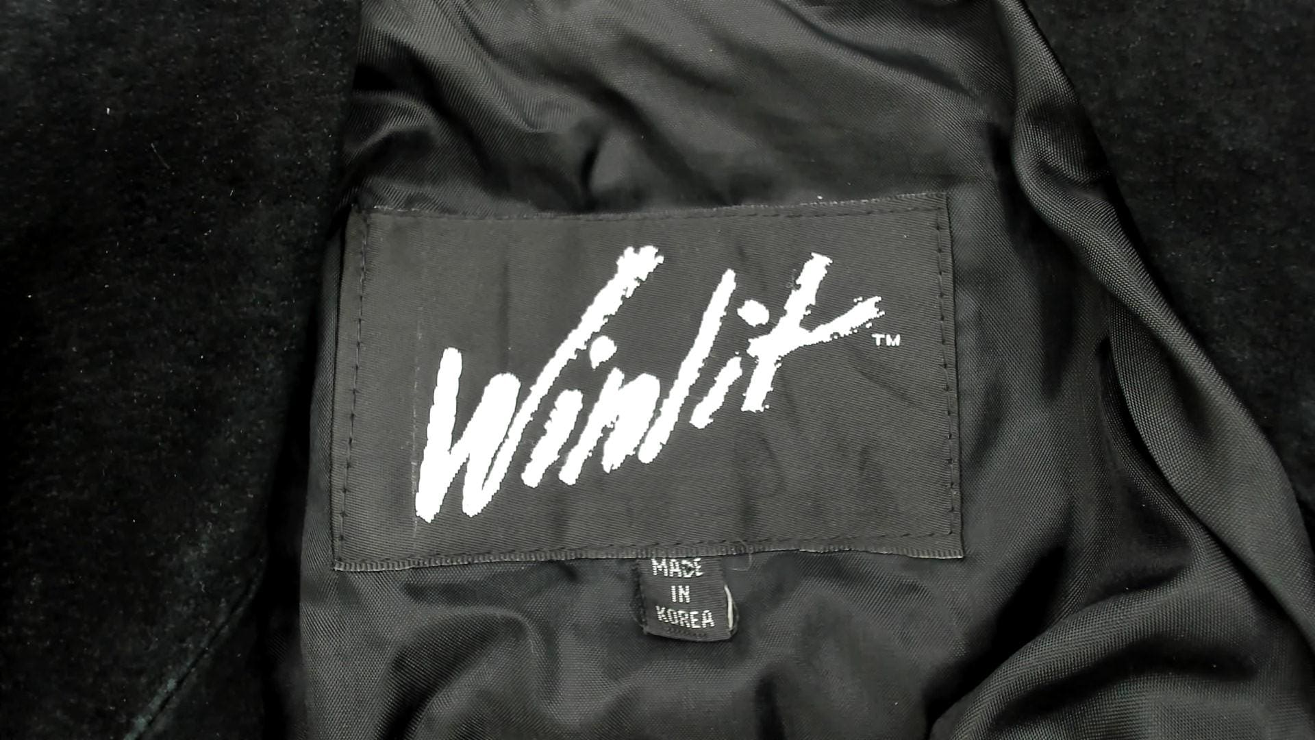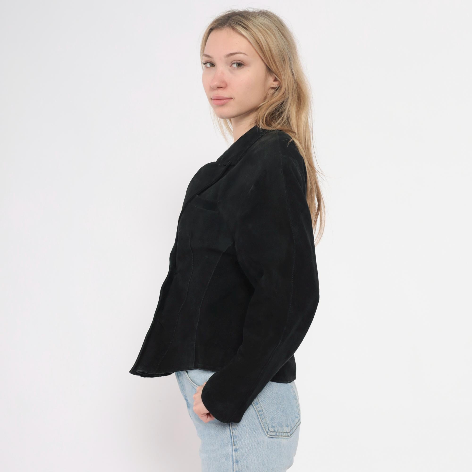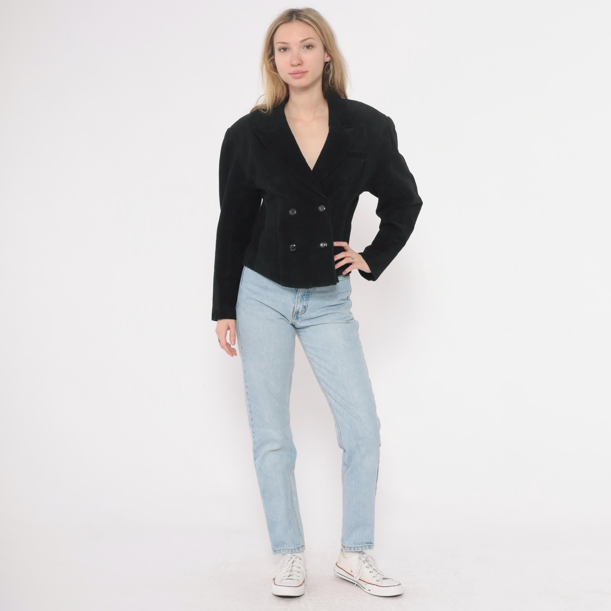 90s black suede double-breasted jacket from Winlit with notched collar and wide lapels. Four-button front closure arranged in two columns, structured shoulders, cropped length ending at hip. Suede throughout. Tagged size Small.