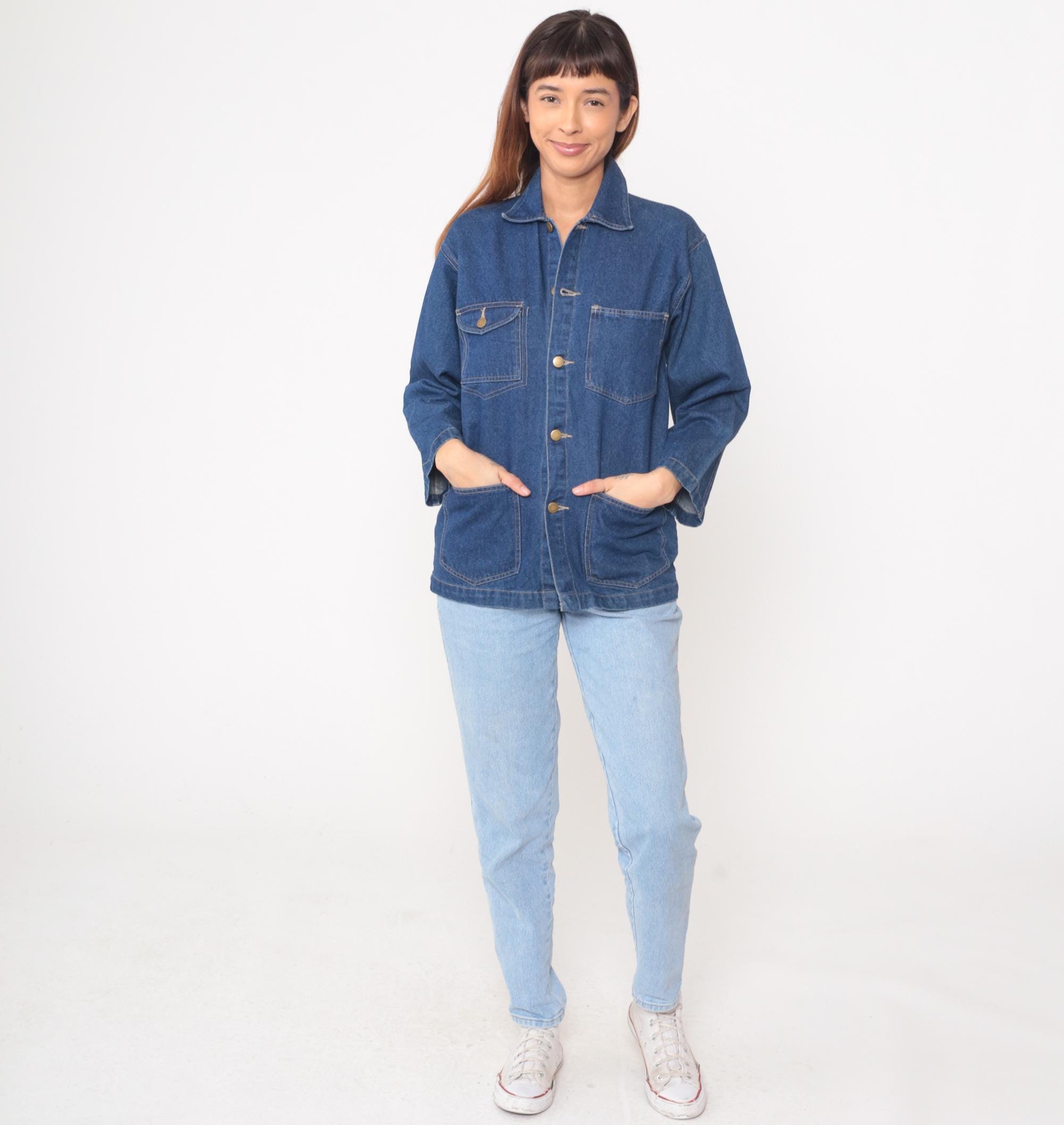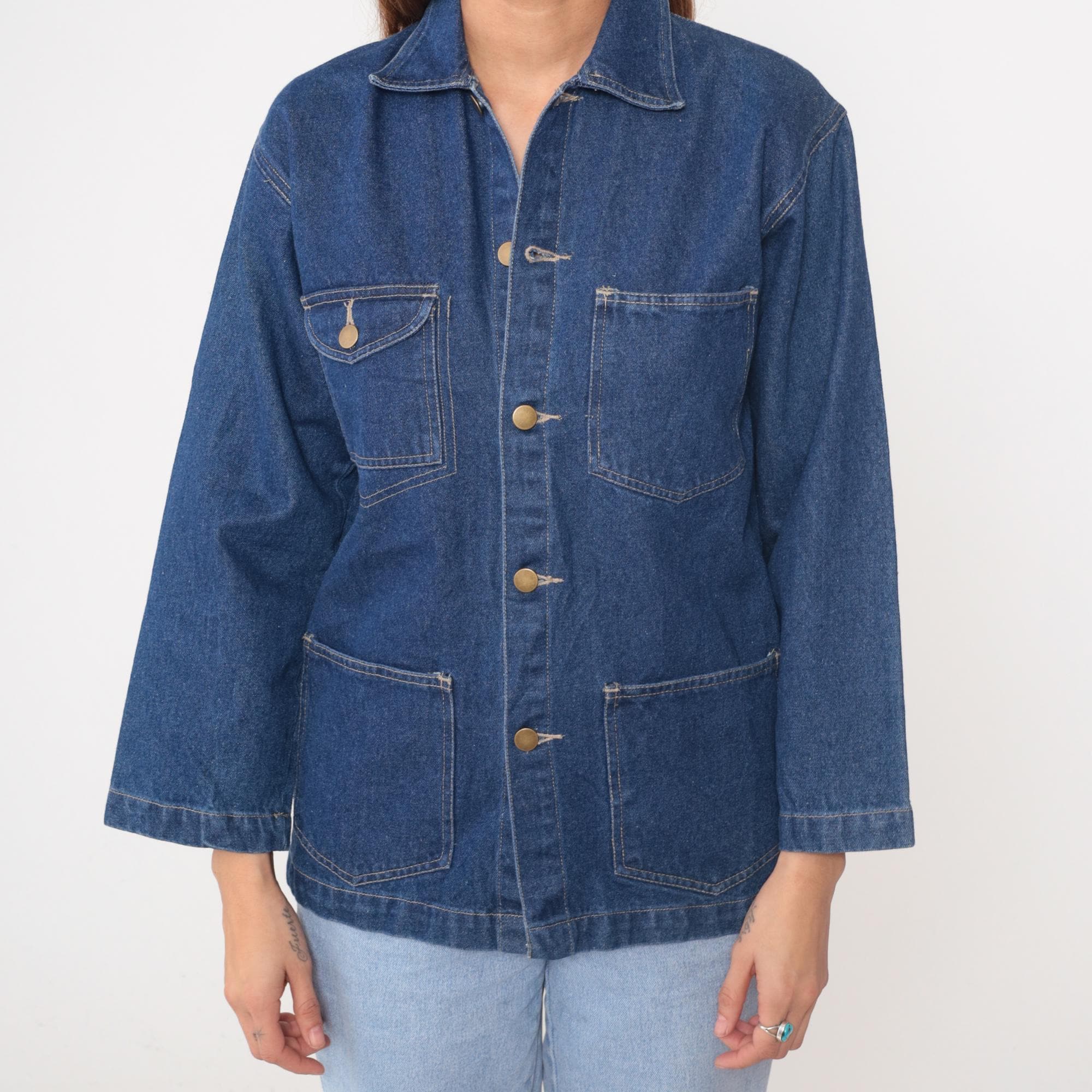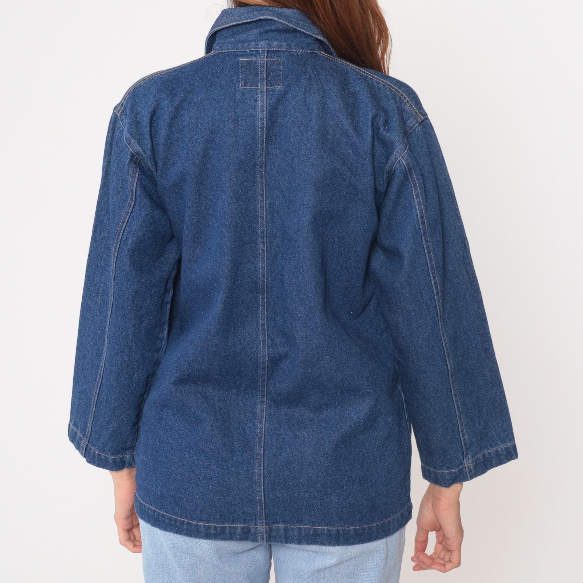 80s medium blue denim chore coat from High Sierra with point collar and metal button front closure. Four front pockets including two chest pockets with button flaps and two lower patch pockets. Contrast stitching throughout.