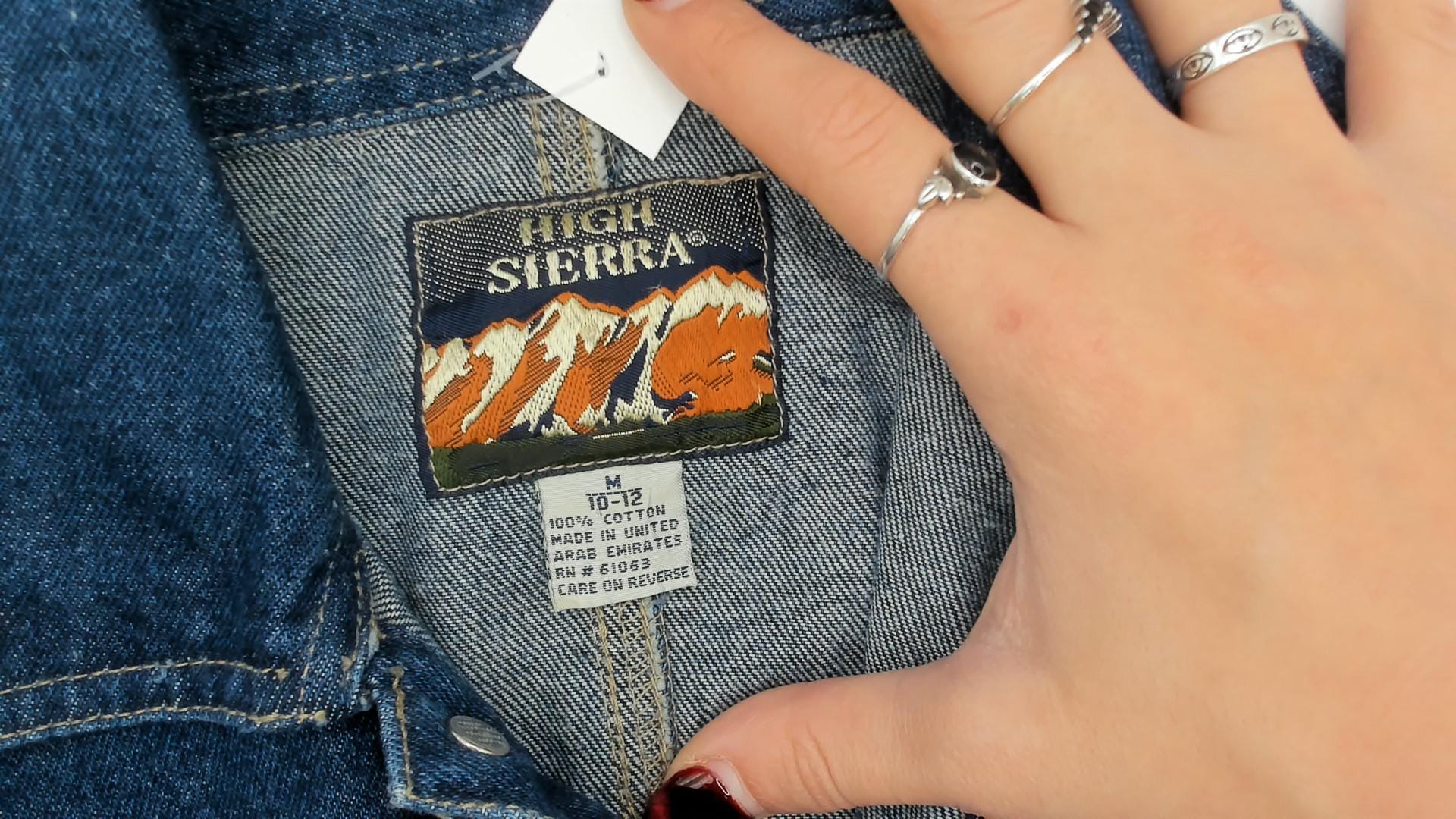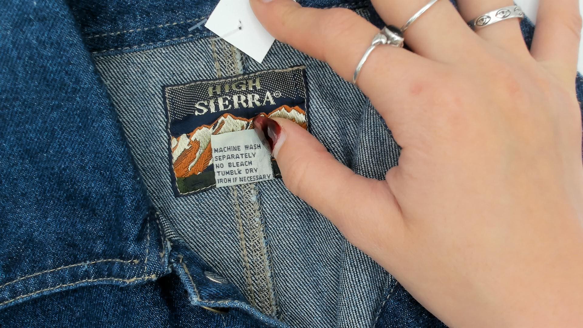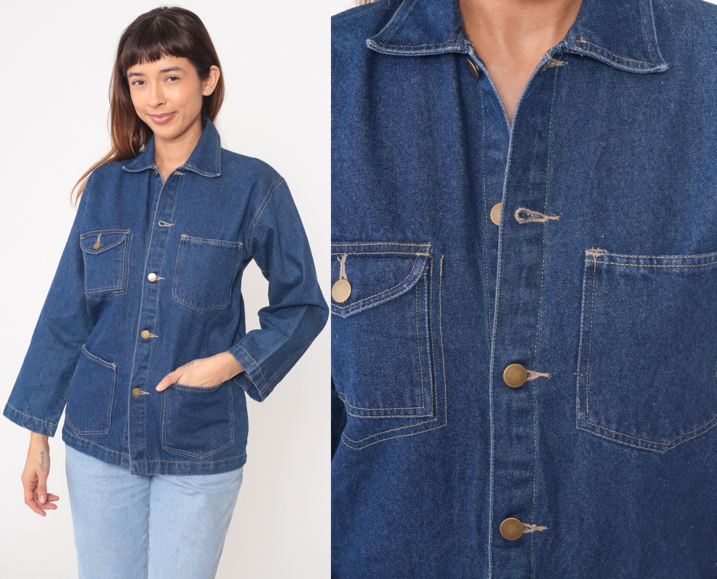 80s medium blue denim chore coat from High Sierra with point collar and metal button front closure. Four front pockets including two chest pockets with button flaps and two lower patch pockets. Contrast stitching throughout.