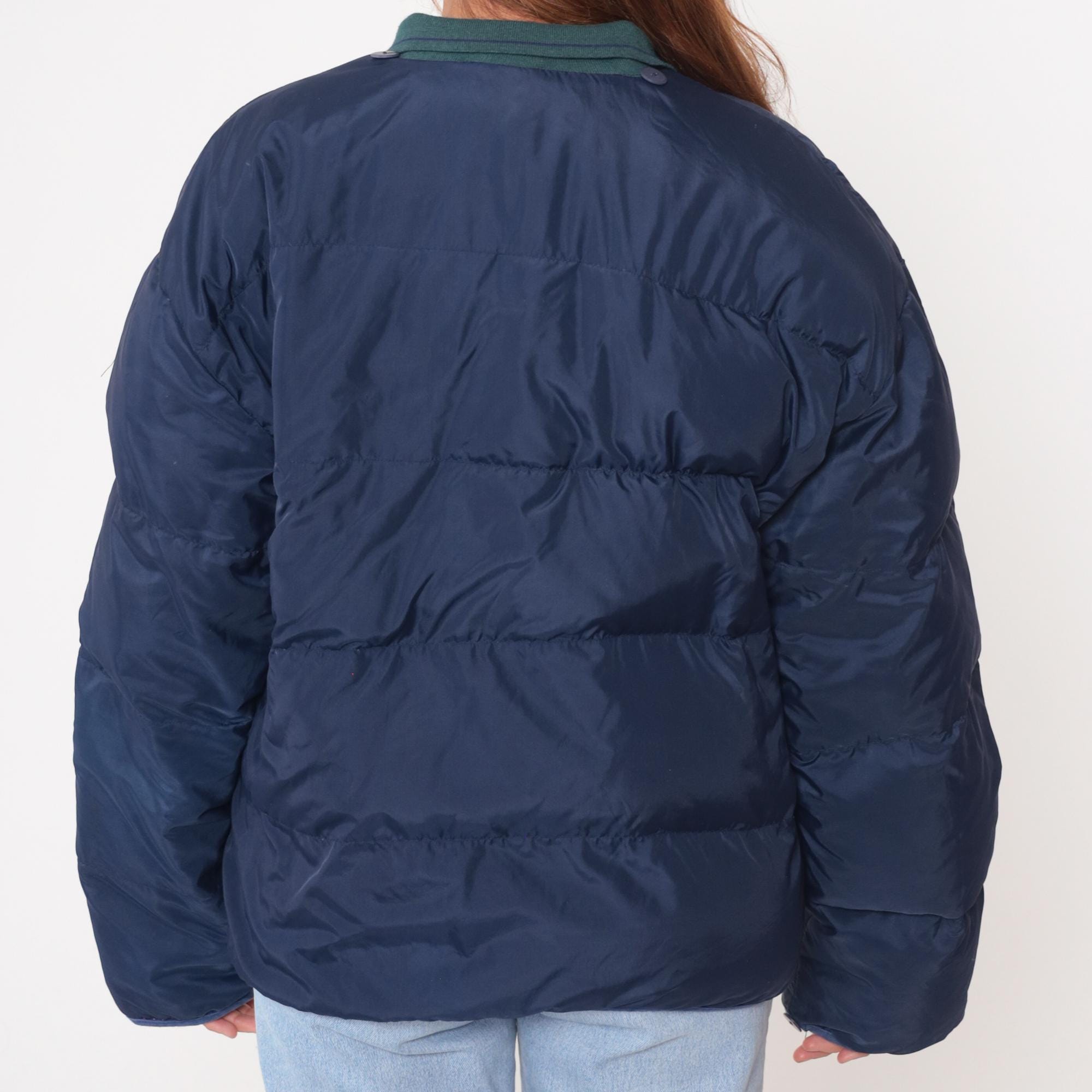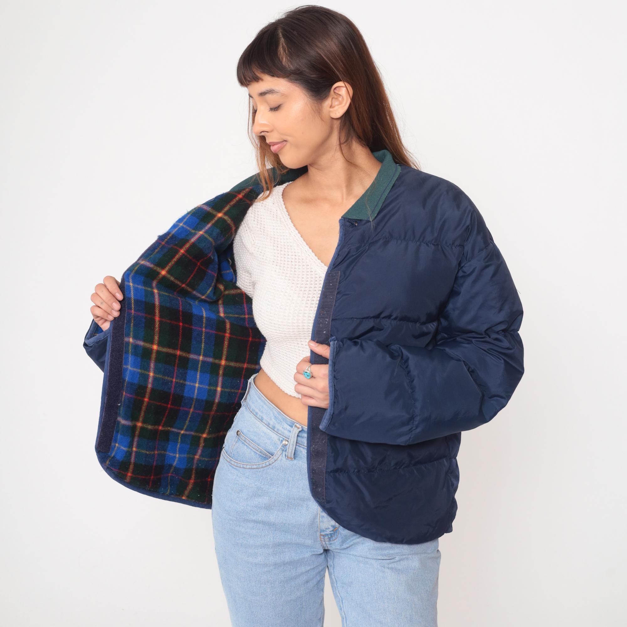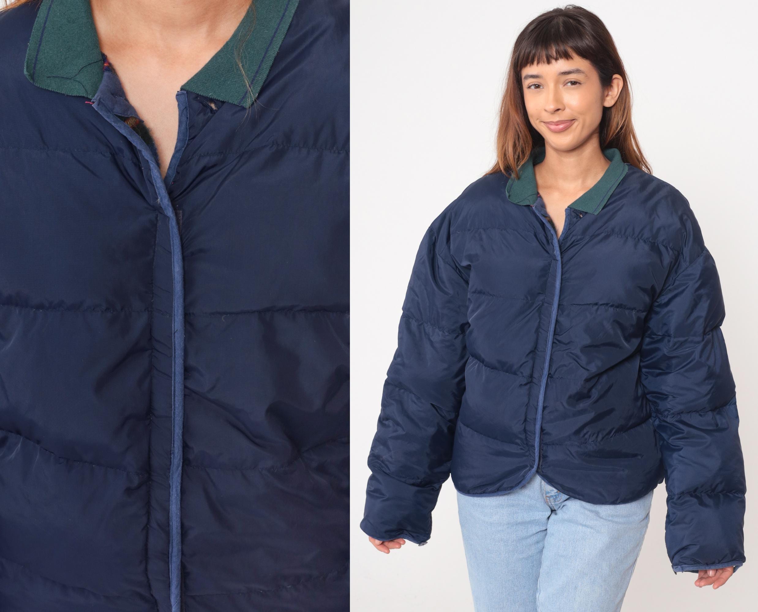 90s navy blue quilted puffer jacket from GM with contrasting teal green collar and hidden velcro closure. Horizontal quilted channels throughout, long sleeves, cropped length ending at waist, plaid flannel interior lining in blue, green, red, and yellow. Might be a liner from another jacket.