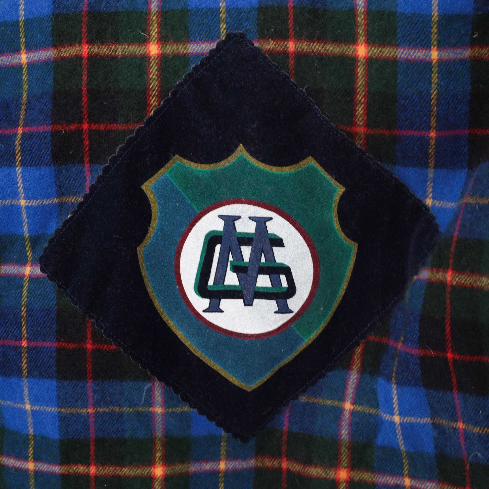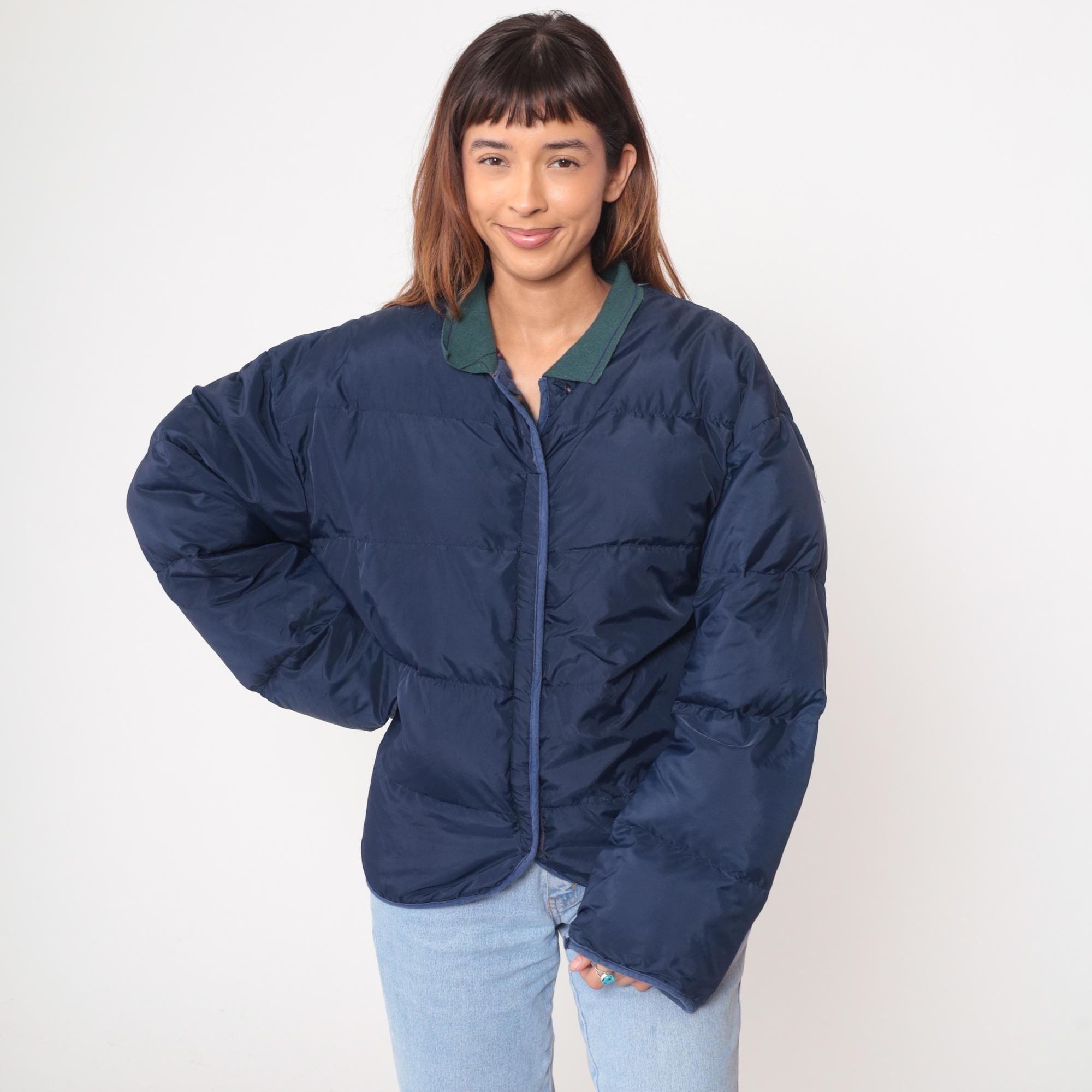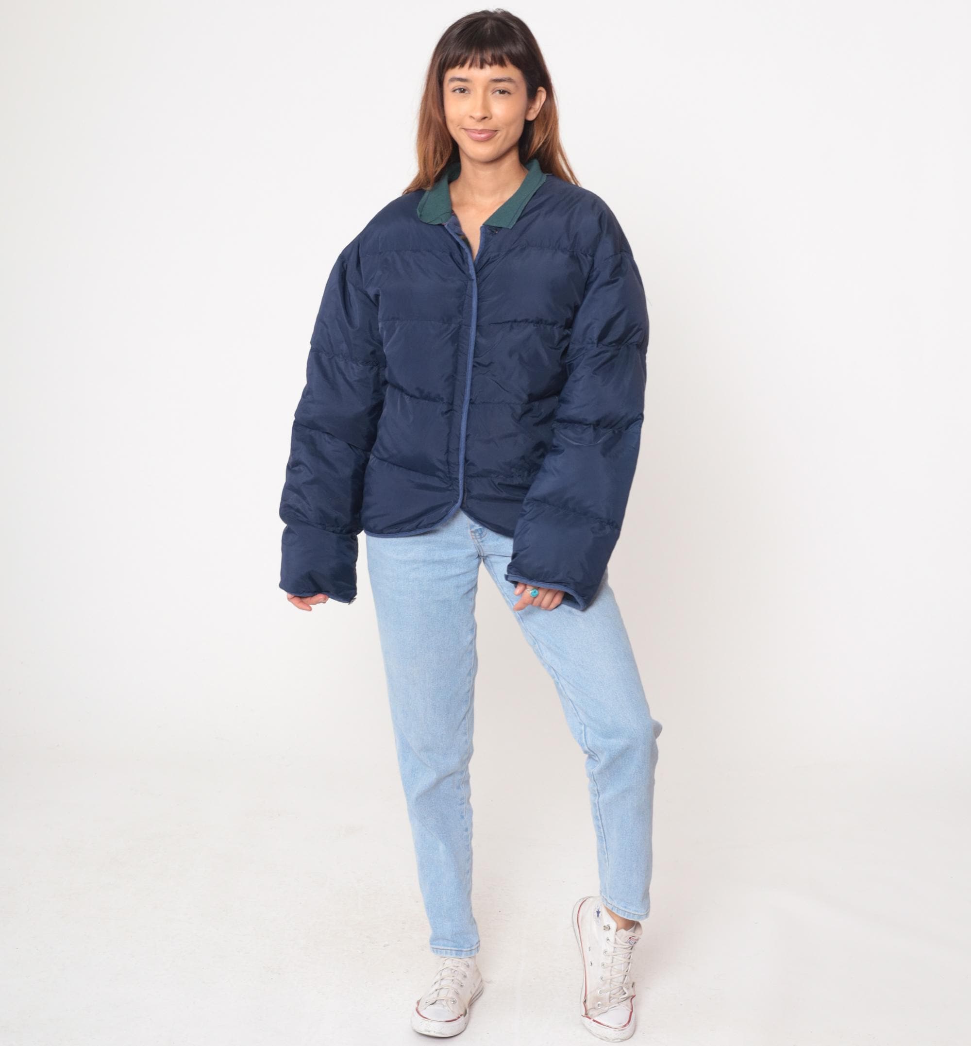90s navy blue quilted puffer jacket from GM with contrasting teal green collar and hidden velcro closure. Horizontal quilted channels throughout, long sleeves, cropped length ending at waist, plaid flannel interior lining in blue, green, red, and yellow. Might be a liner from another jacket.