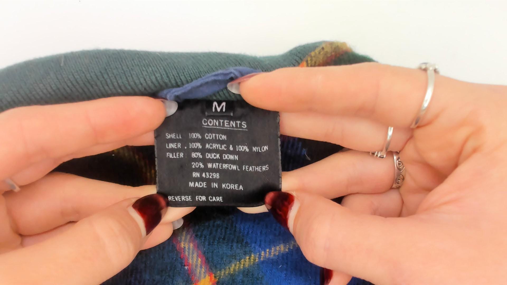 Material: Labelled shell: 100 Cotton liner: 100 Acrylic & 100 Nylon filler: 80 duck down 20 waterfowl feathers