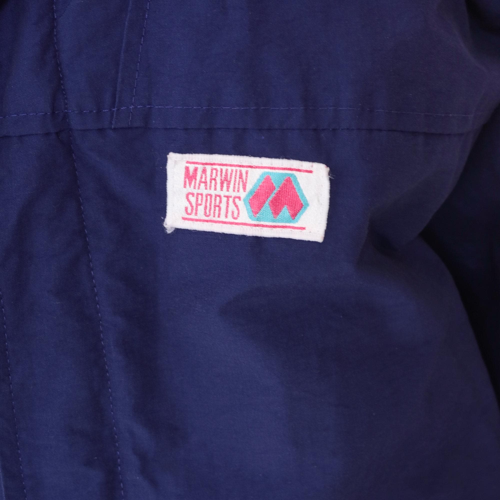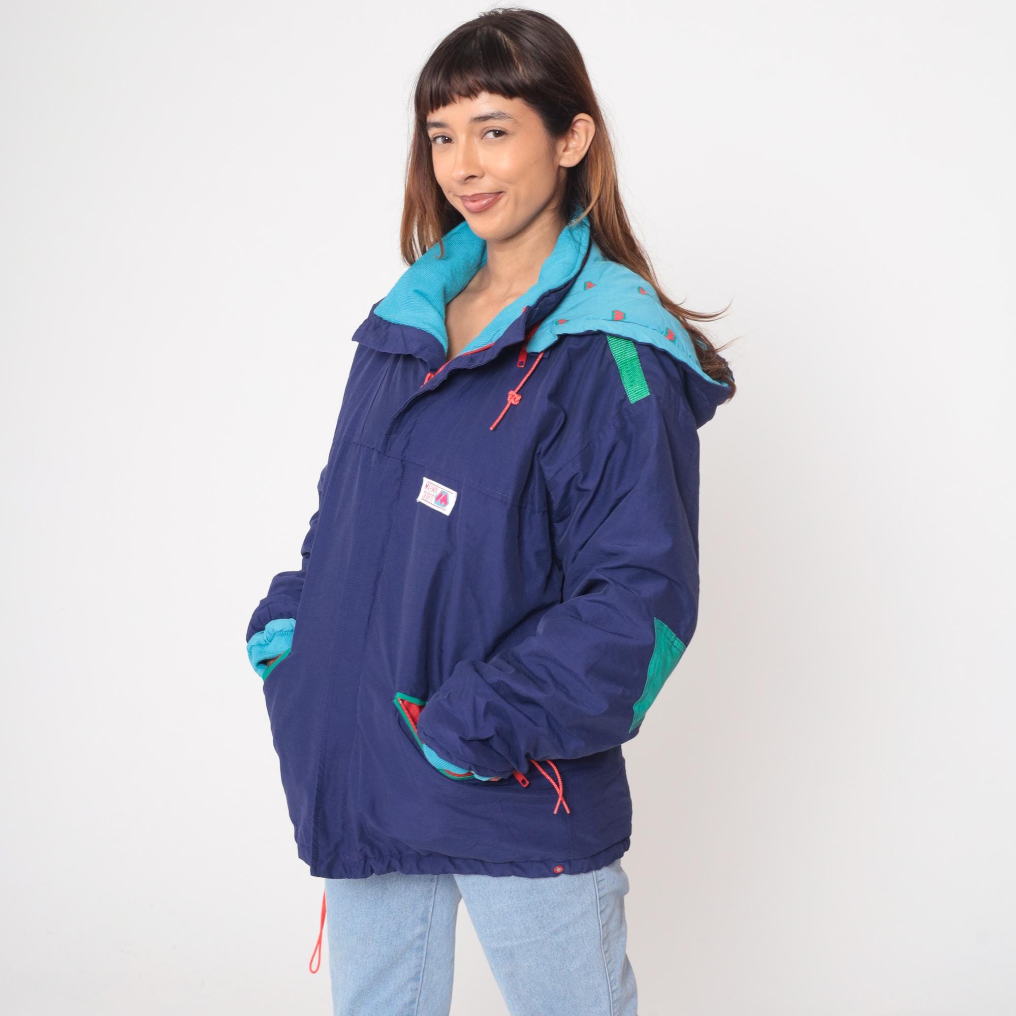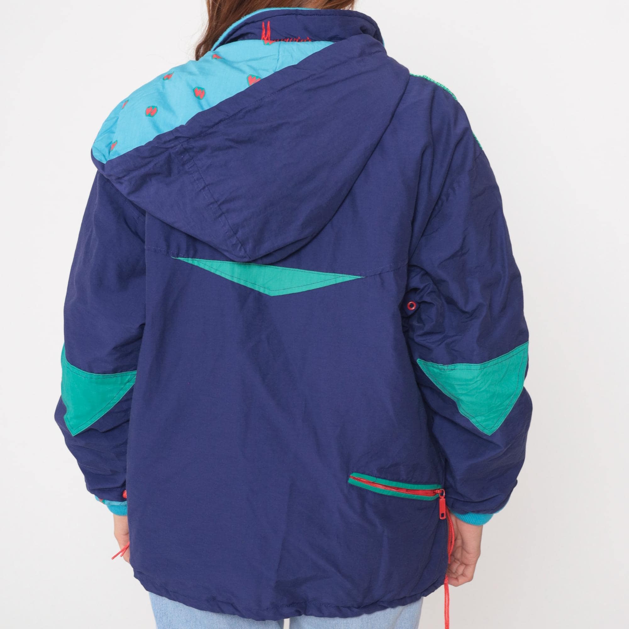 80s navy blue pullover windbreaker from Marwin Sports with turquoise and green geometric colorblocking. Half-zip front with red zipper and drawstring details, attached hood lined in turquoise with printed pattern, elastic cuffs and hem. Front pockets with red and green piping, triangular green panels at back and elbows.