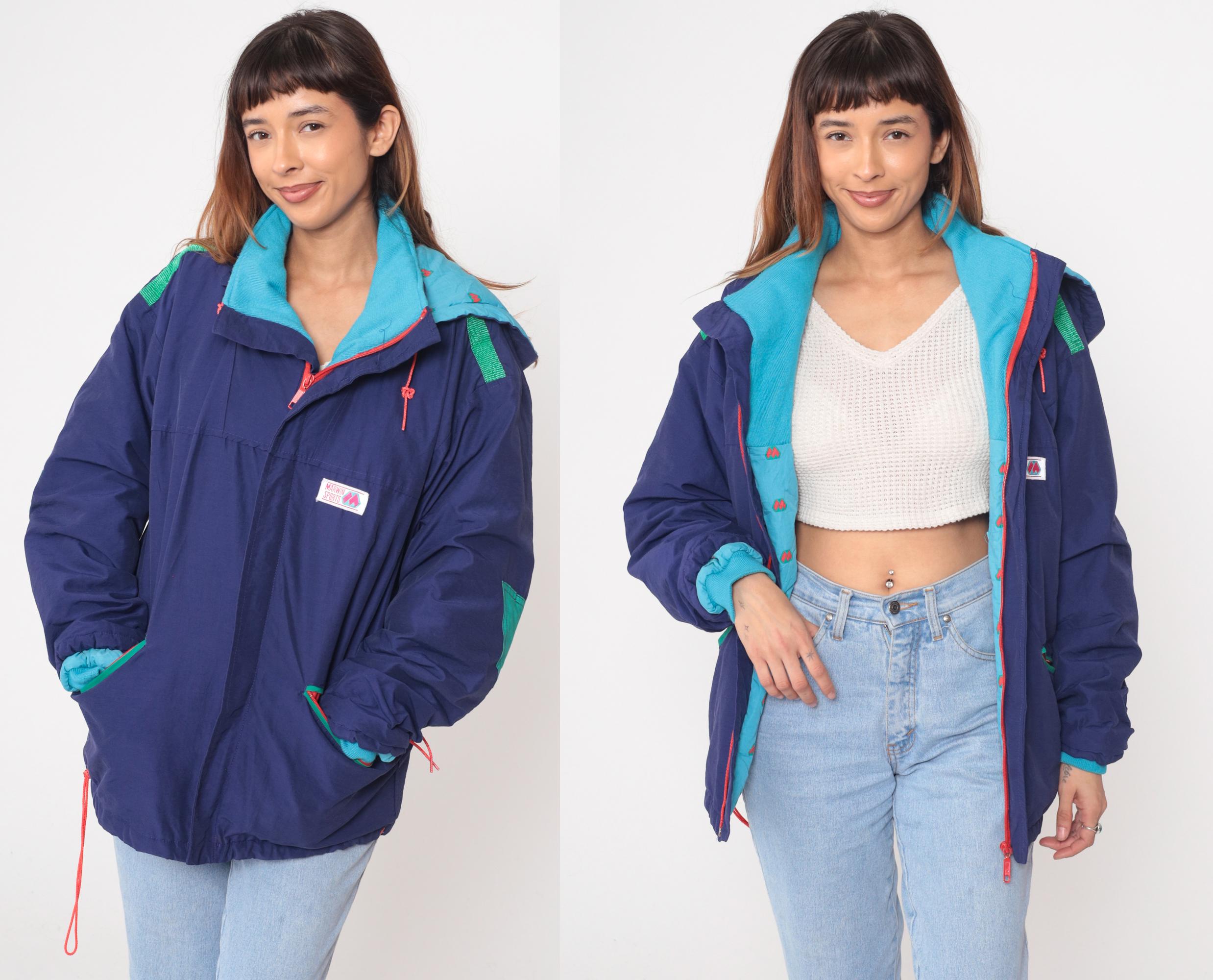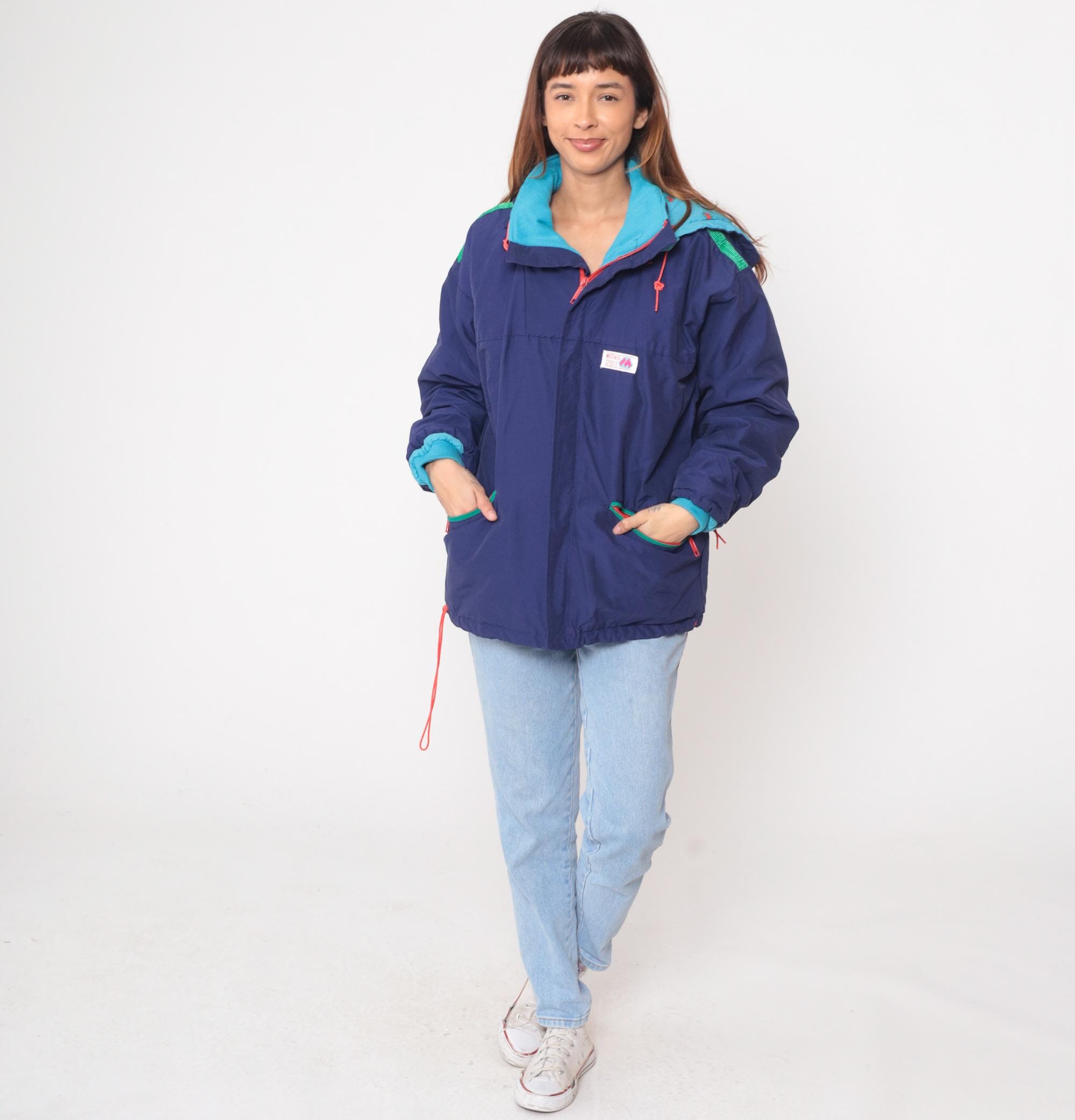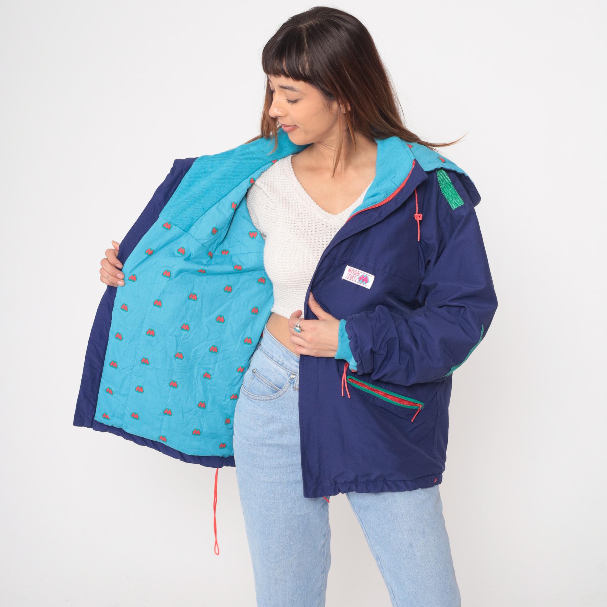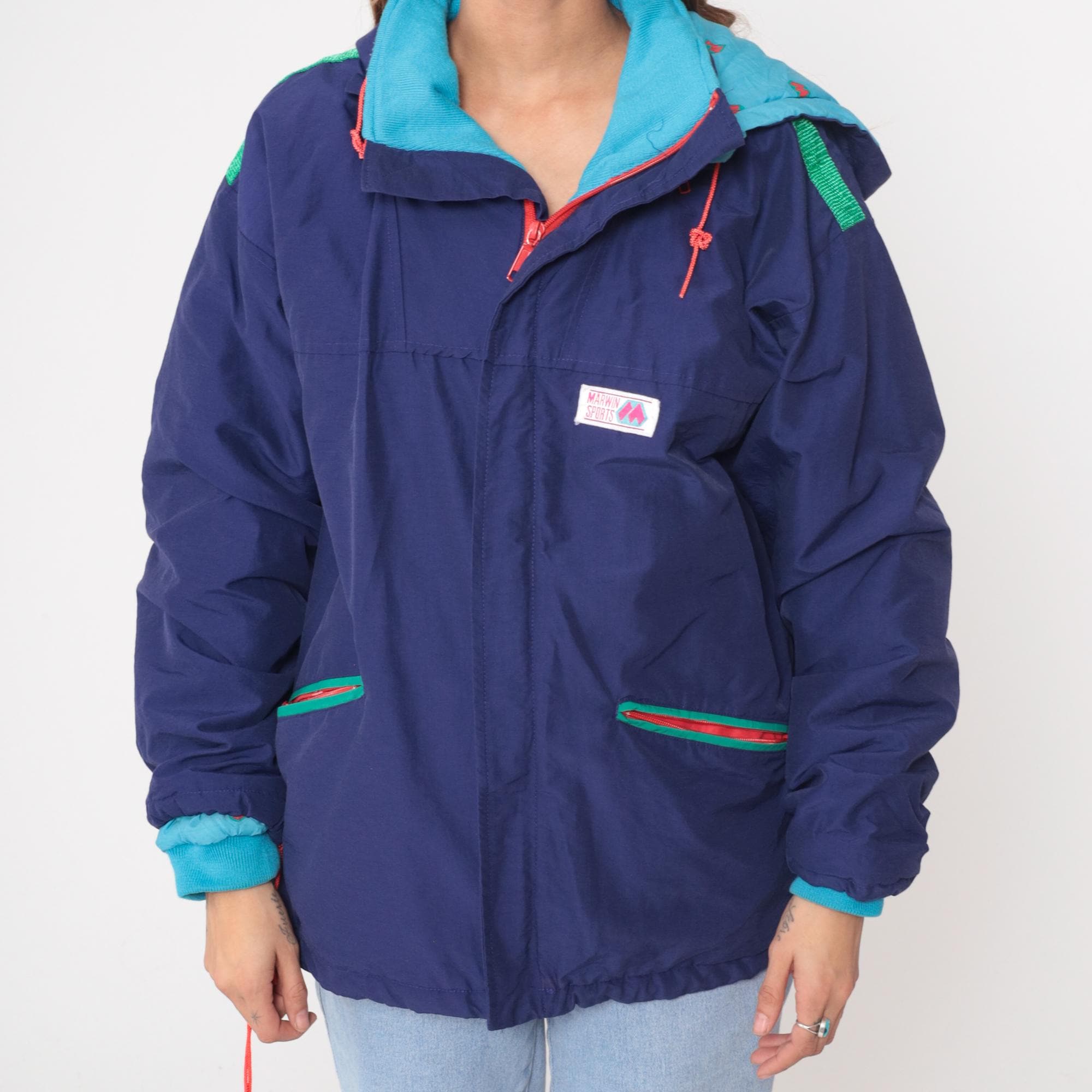 80s navy blue pullover windbreaker from Marwin Sports with turquoise and green geometric colorblocking. Half-zip front with red zipper and drawstring details, attached hood lined in turquoise with printed pattern, elastic cuffs and hem. Front pockets with red and green piping, triangular green panels at back and elbows.