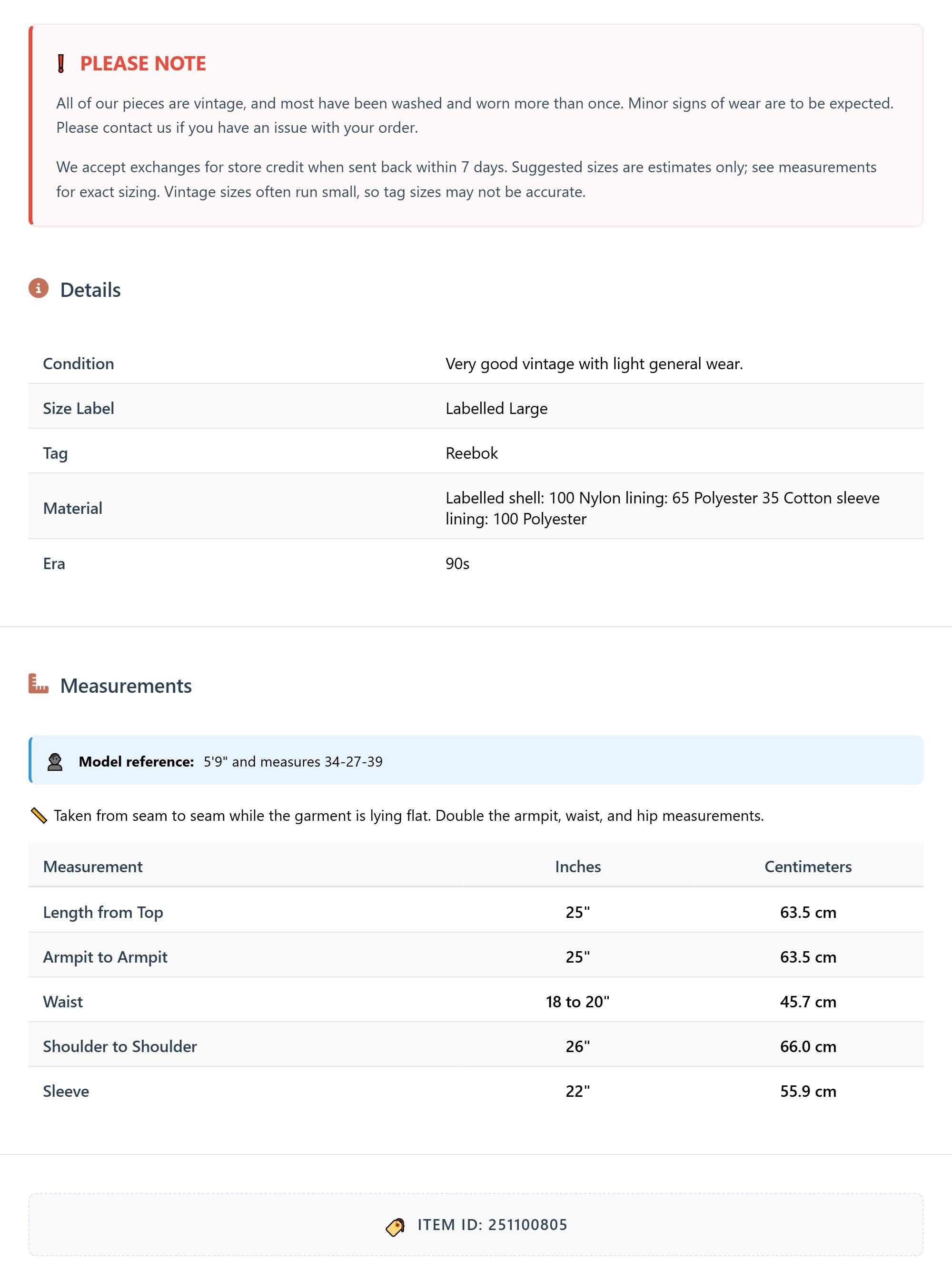 All of our pieces are vintage, and most have been washed and worn more than once. Minor signs of wear are to be expected. Please contact us if you have an issue with your order. We accept exchanges for store credit when sent back within 7 days.