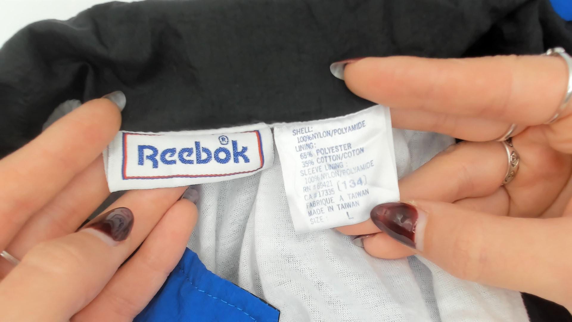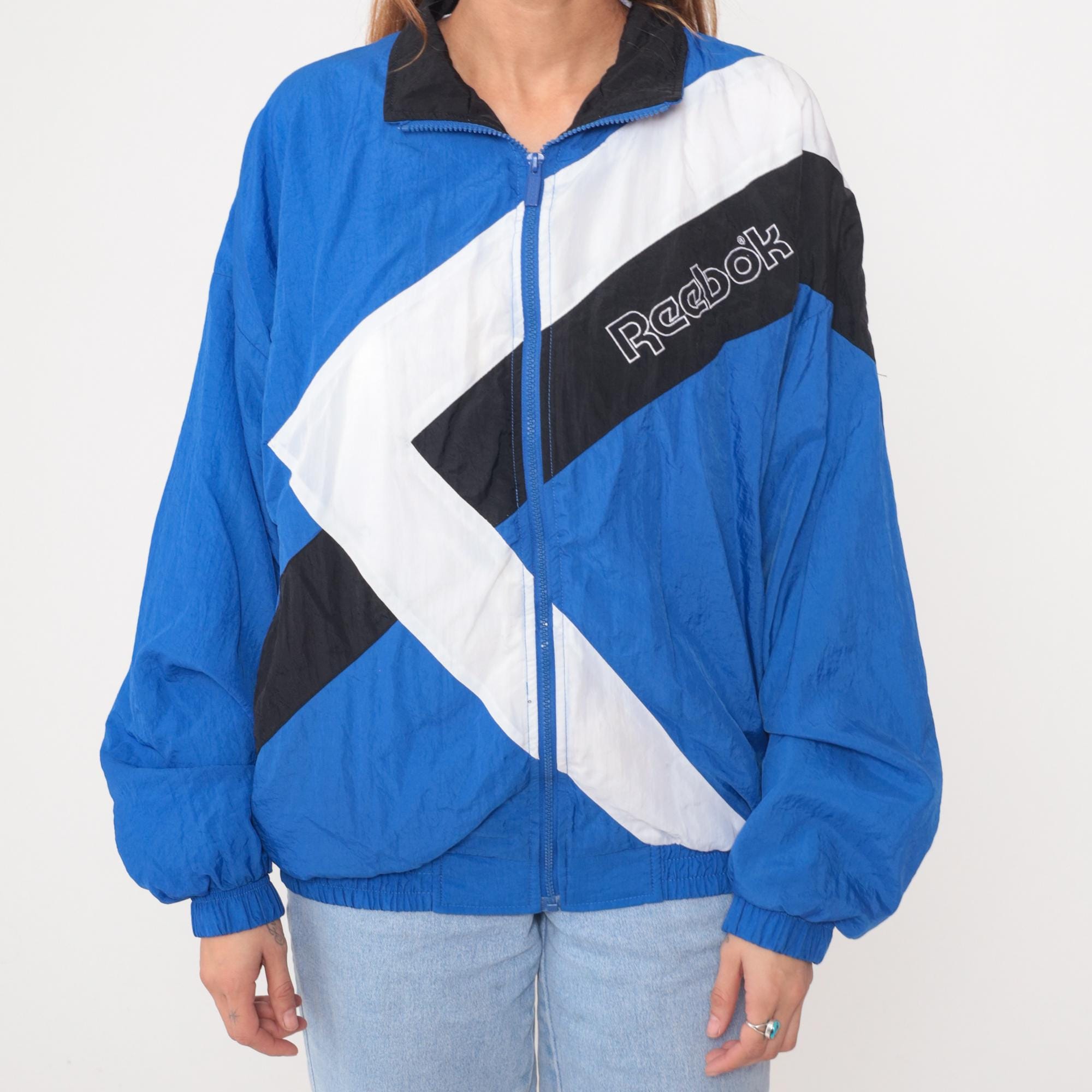 90s Reebok windbreaker in blue, white, and black color-blocked panels with diagonal geometric design across the chest and back. Full front zipper closure with stand collar, elastic cuffs and hem, and embroidered Reebok logo on the chest.