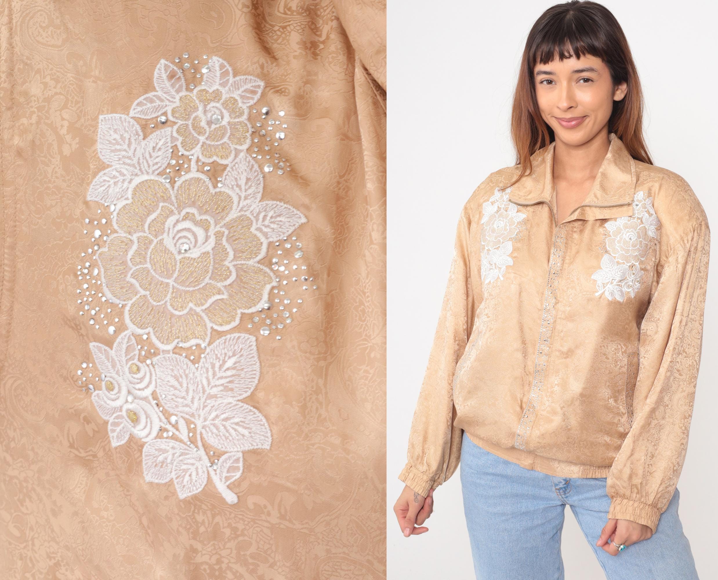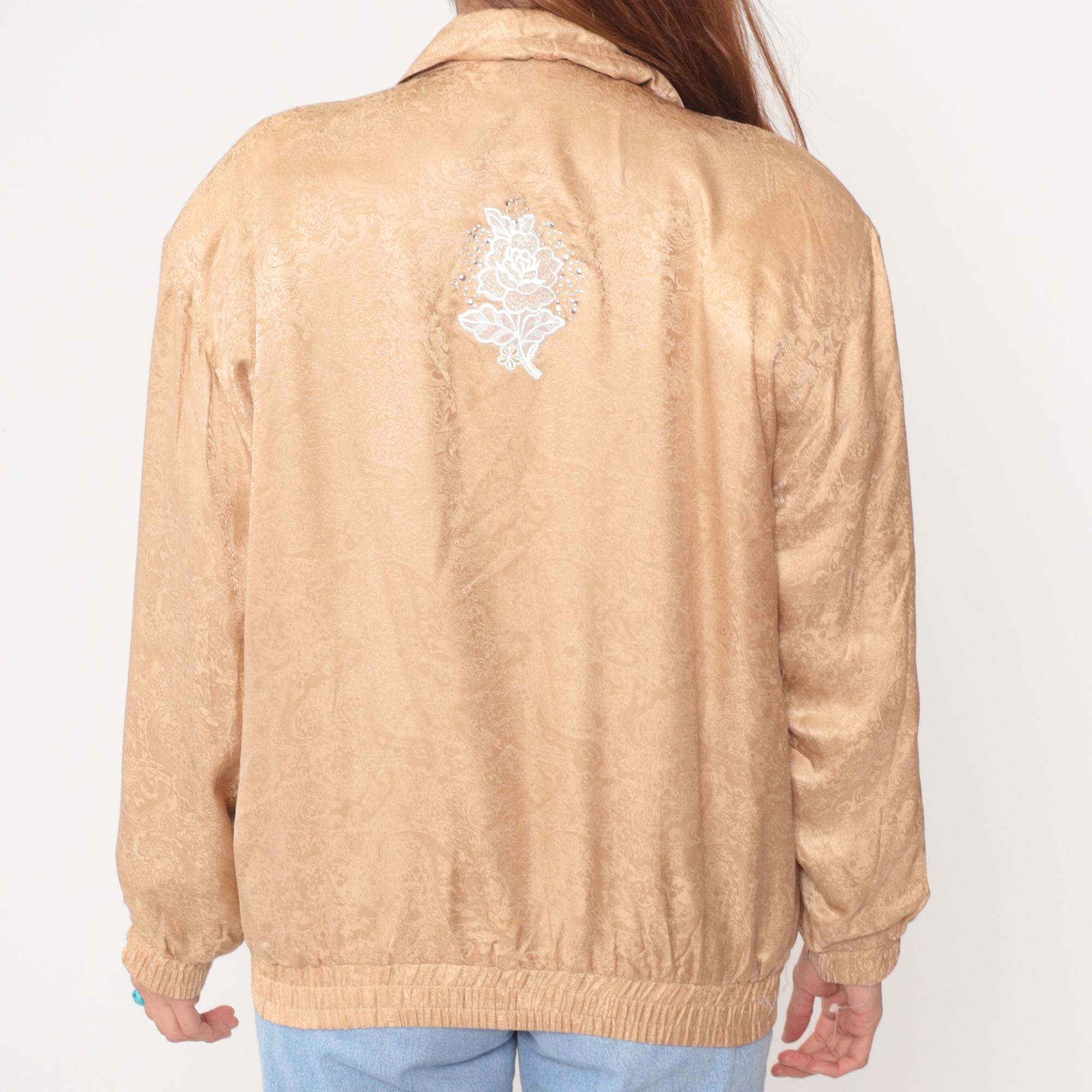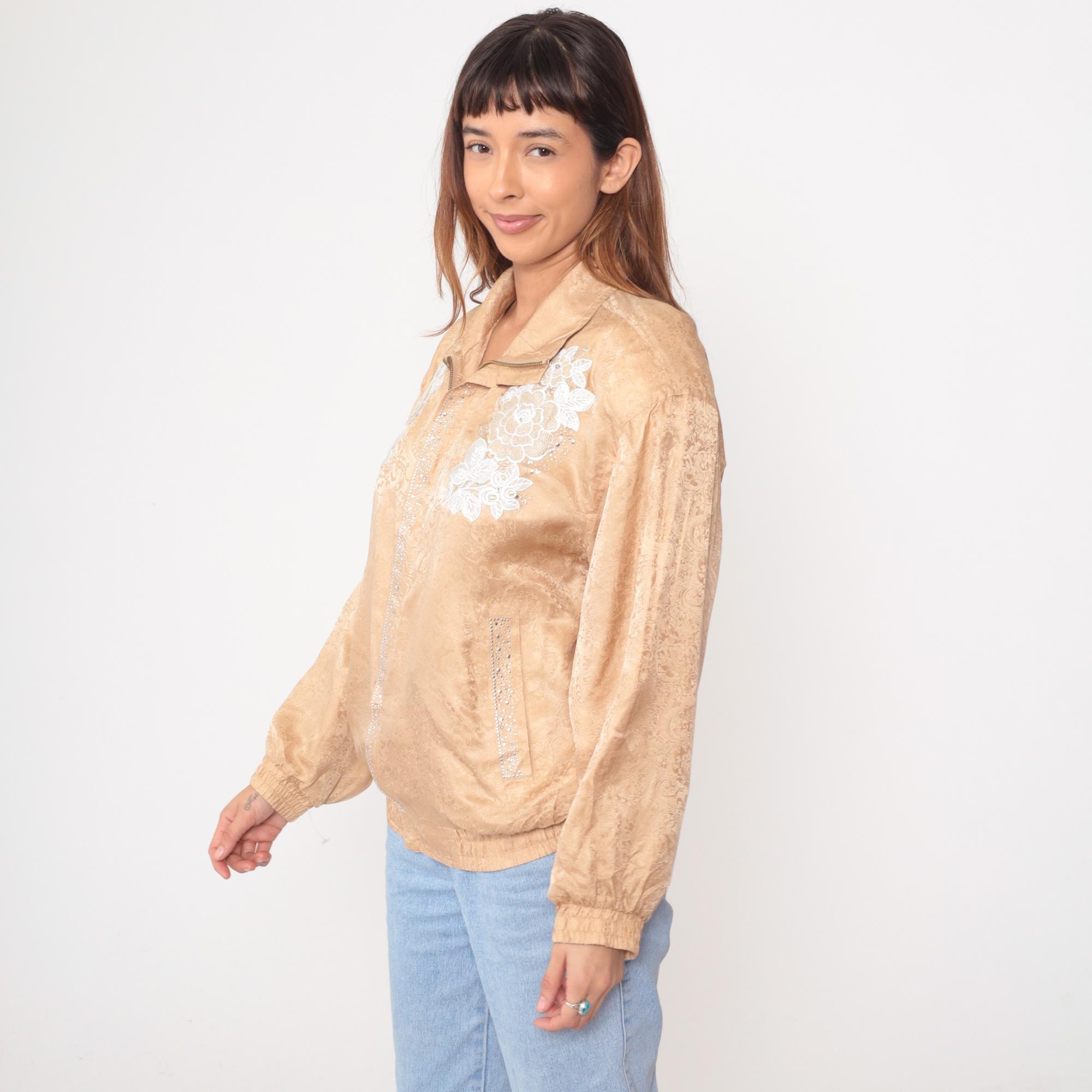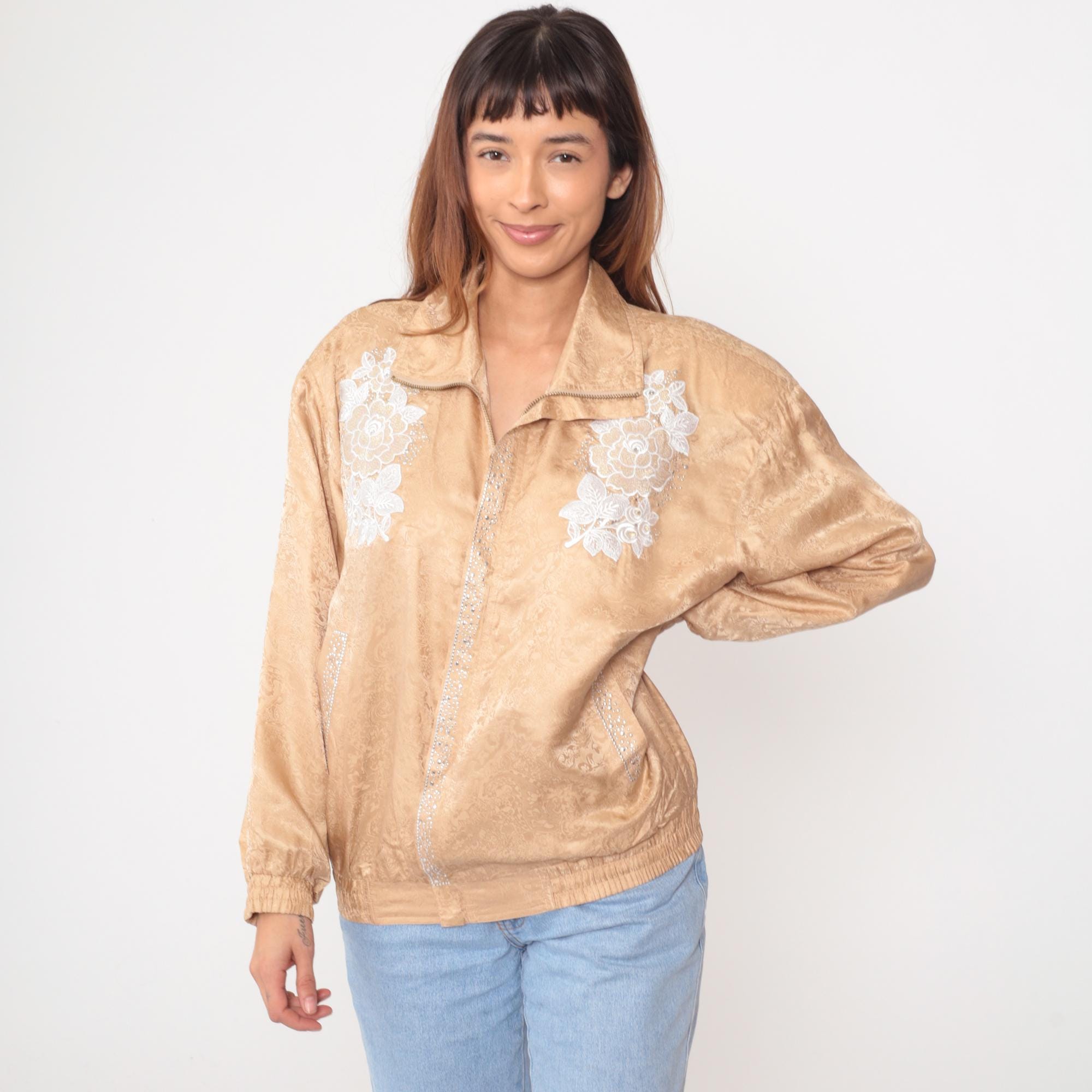 90s champagne gold bomber jacket with allover brocade pattern and white embroidered floral appliques on chest and back. Zip front closure, ribbed collar, cuffs, and hem.