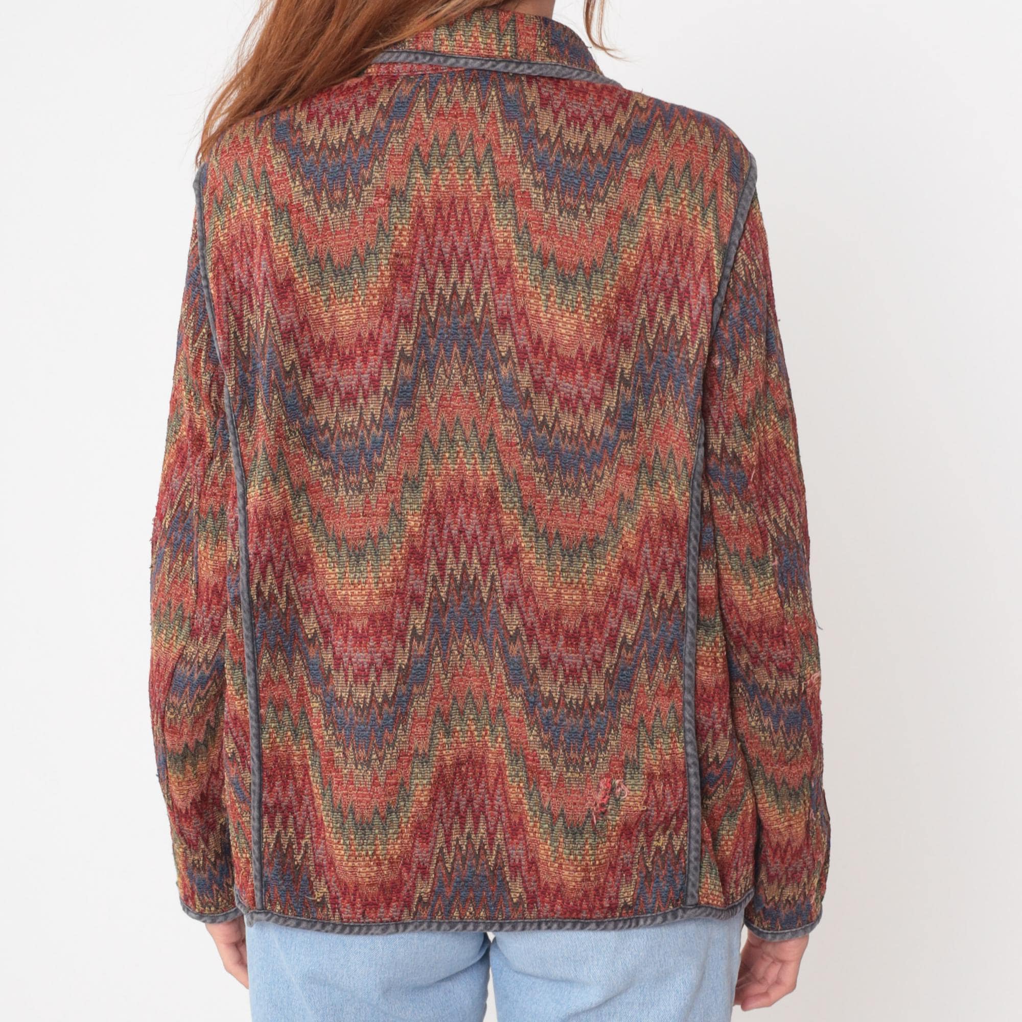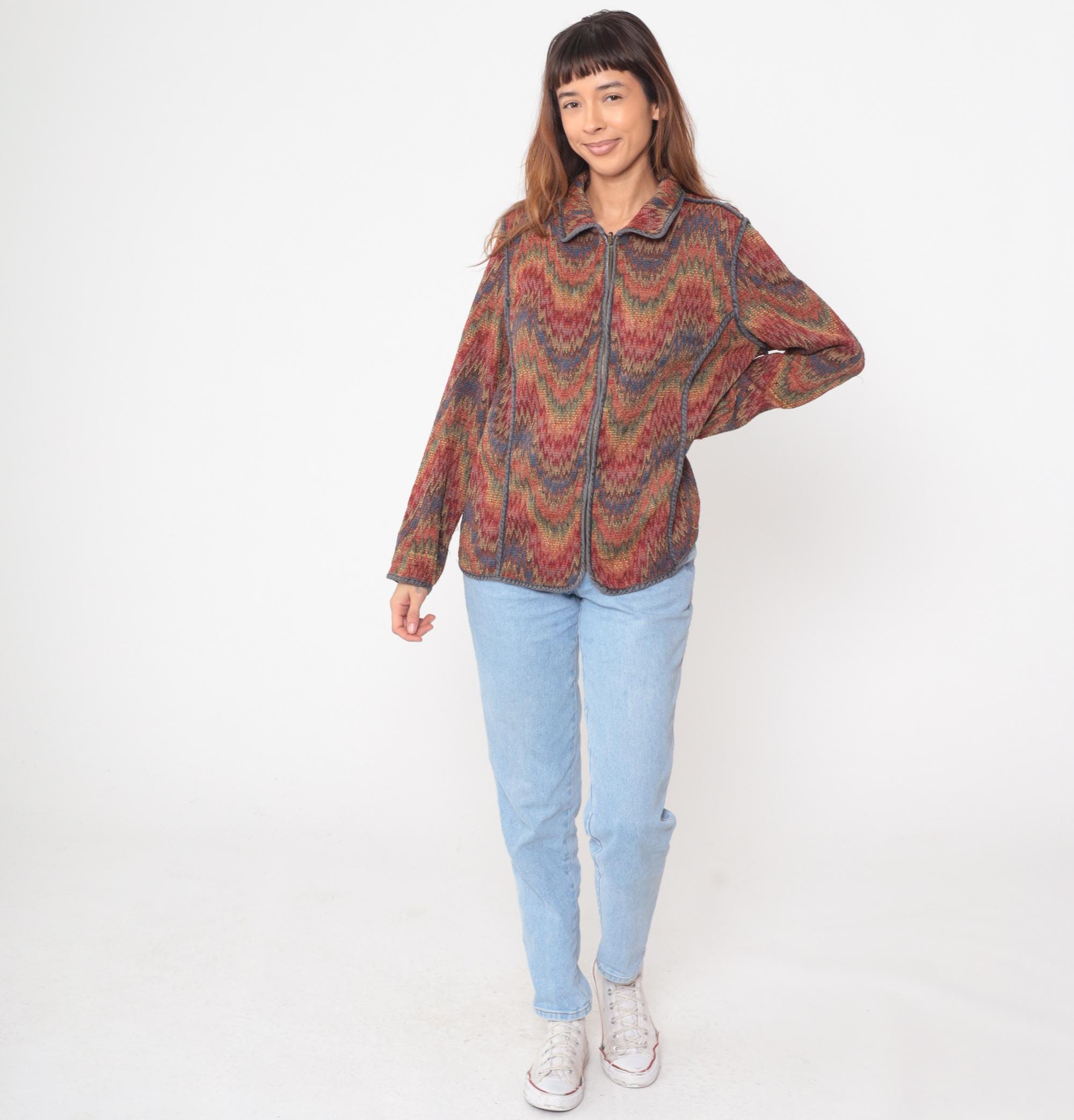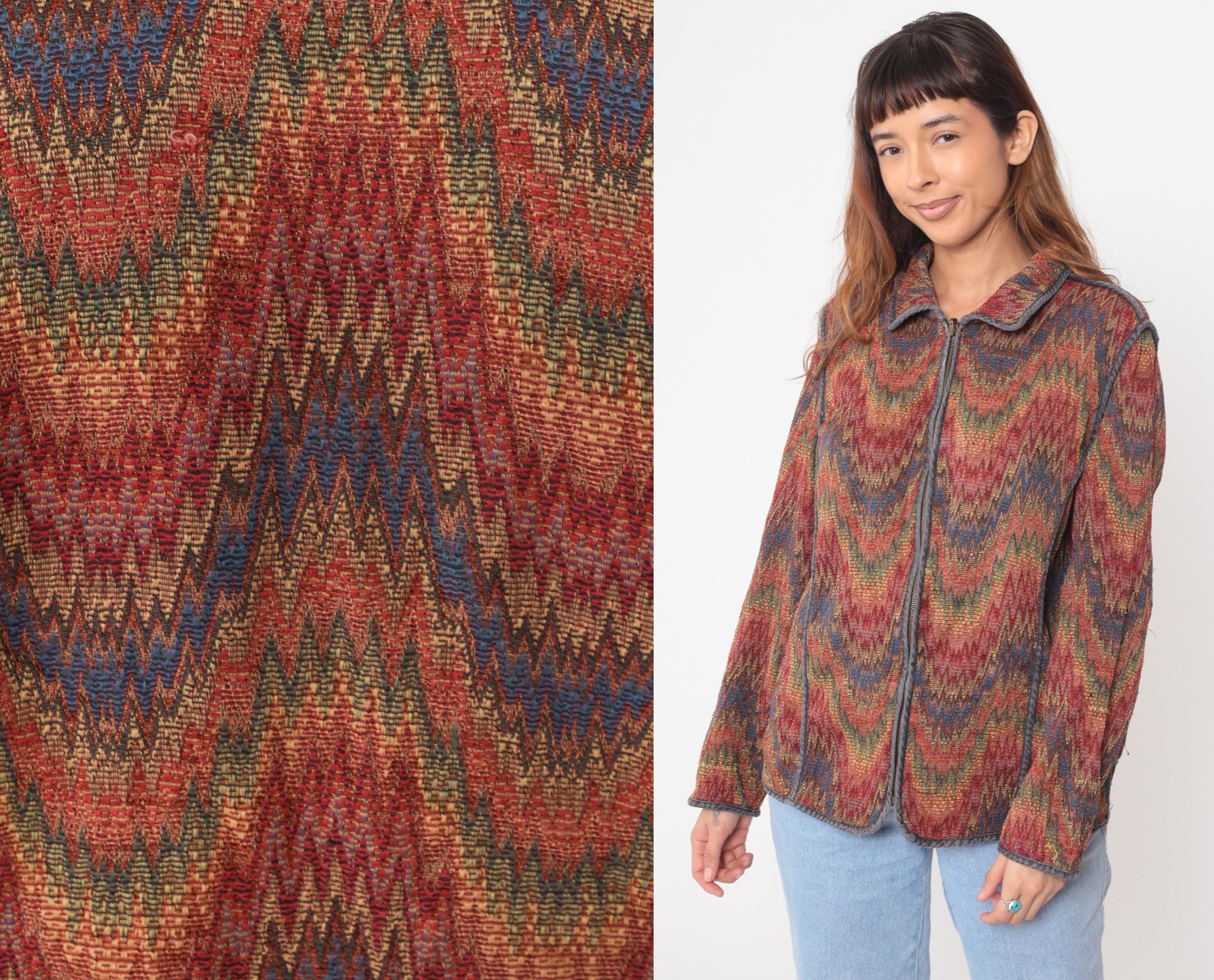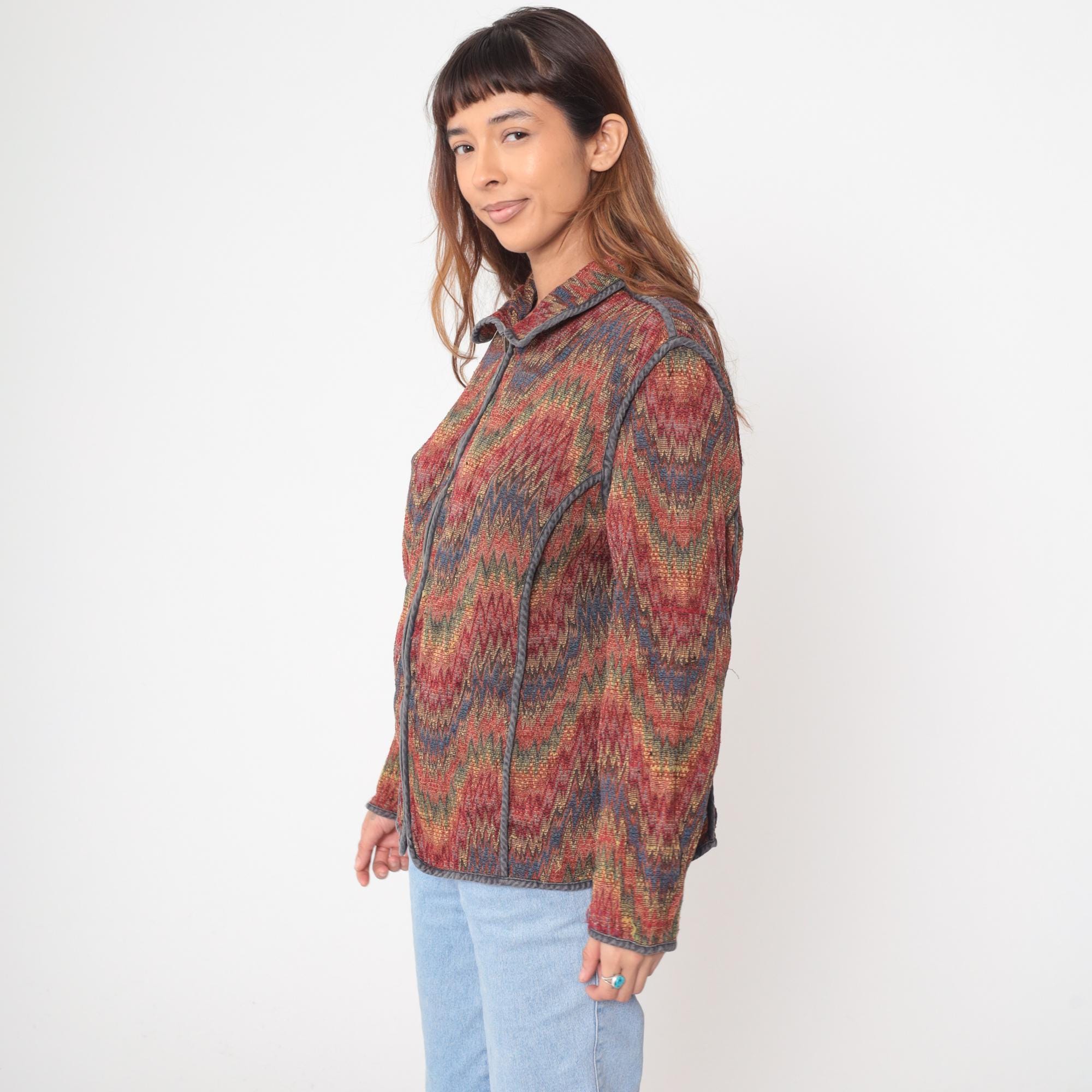 Y2K colorful chevron patterned jacket with full zip front closure and collared neckline. Burgundy, rust, blue, tan, and olive zigzag pattern across the fabric with charcoal gray contrast trim at collar, cuffs, hem, and along the zipper.