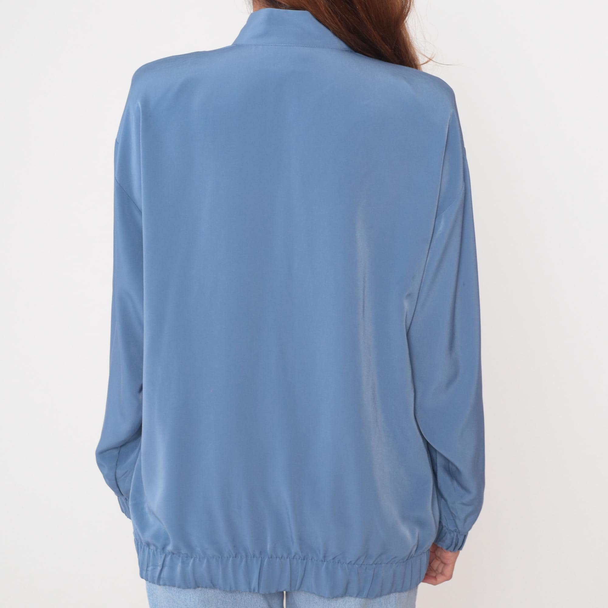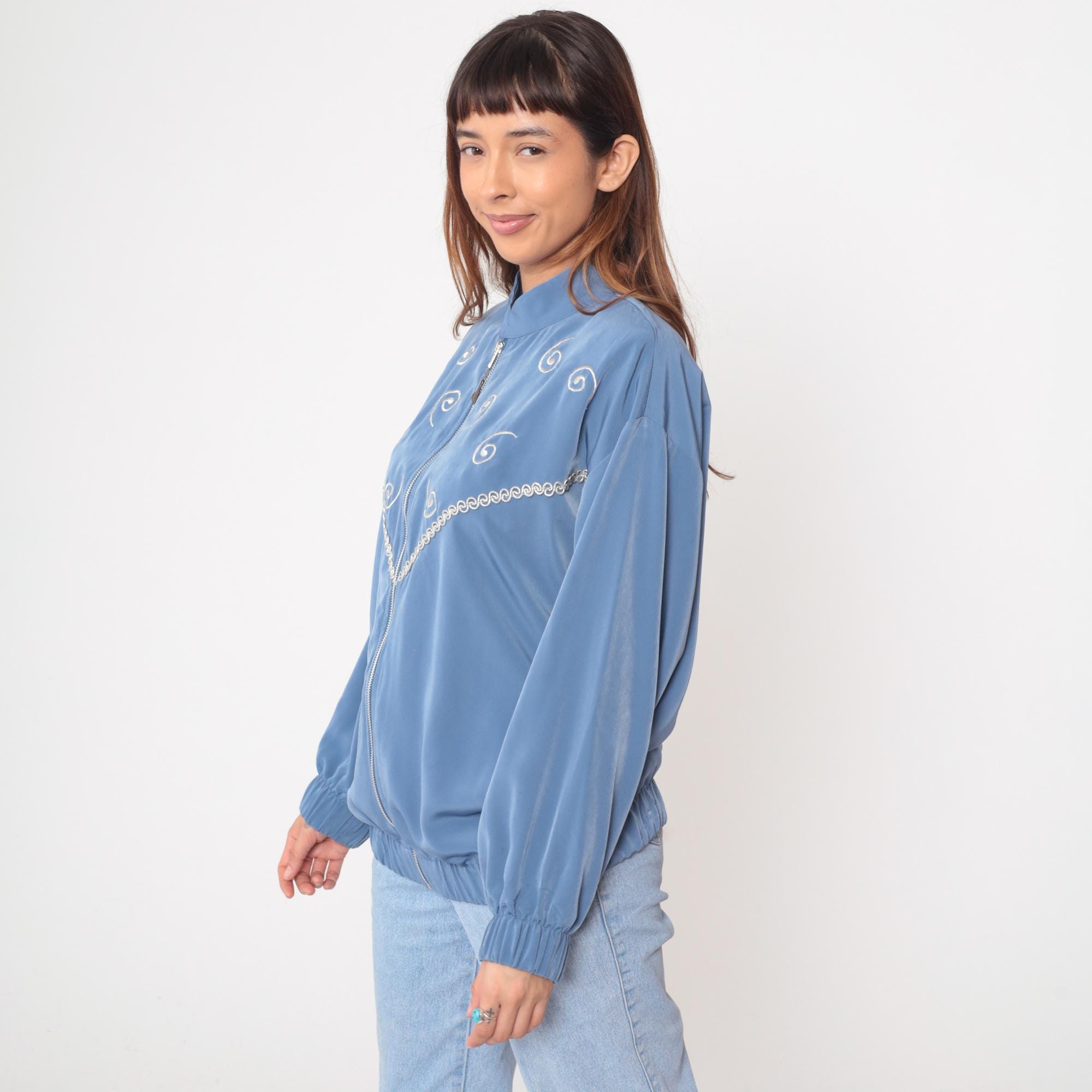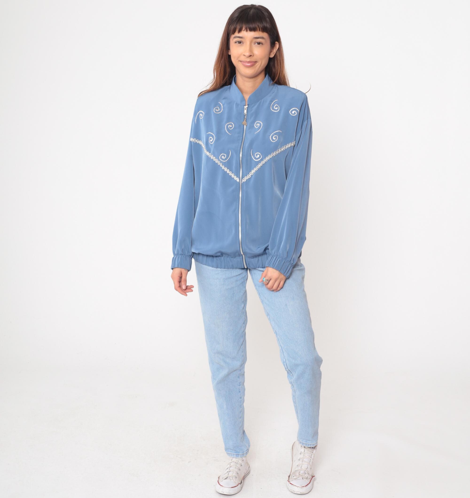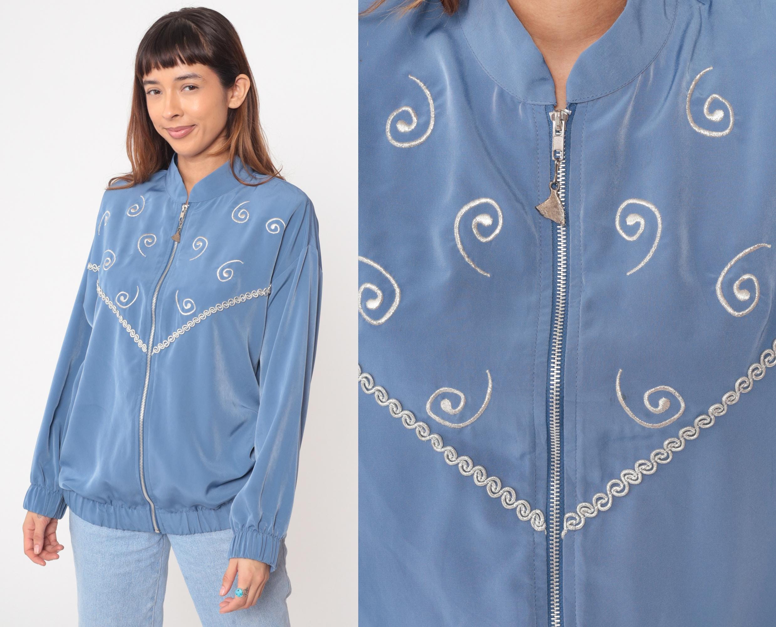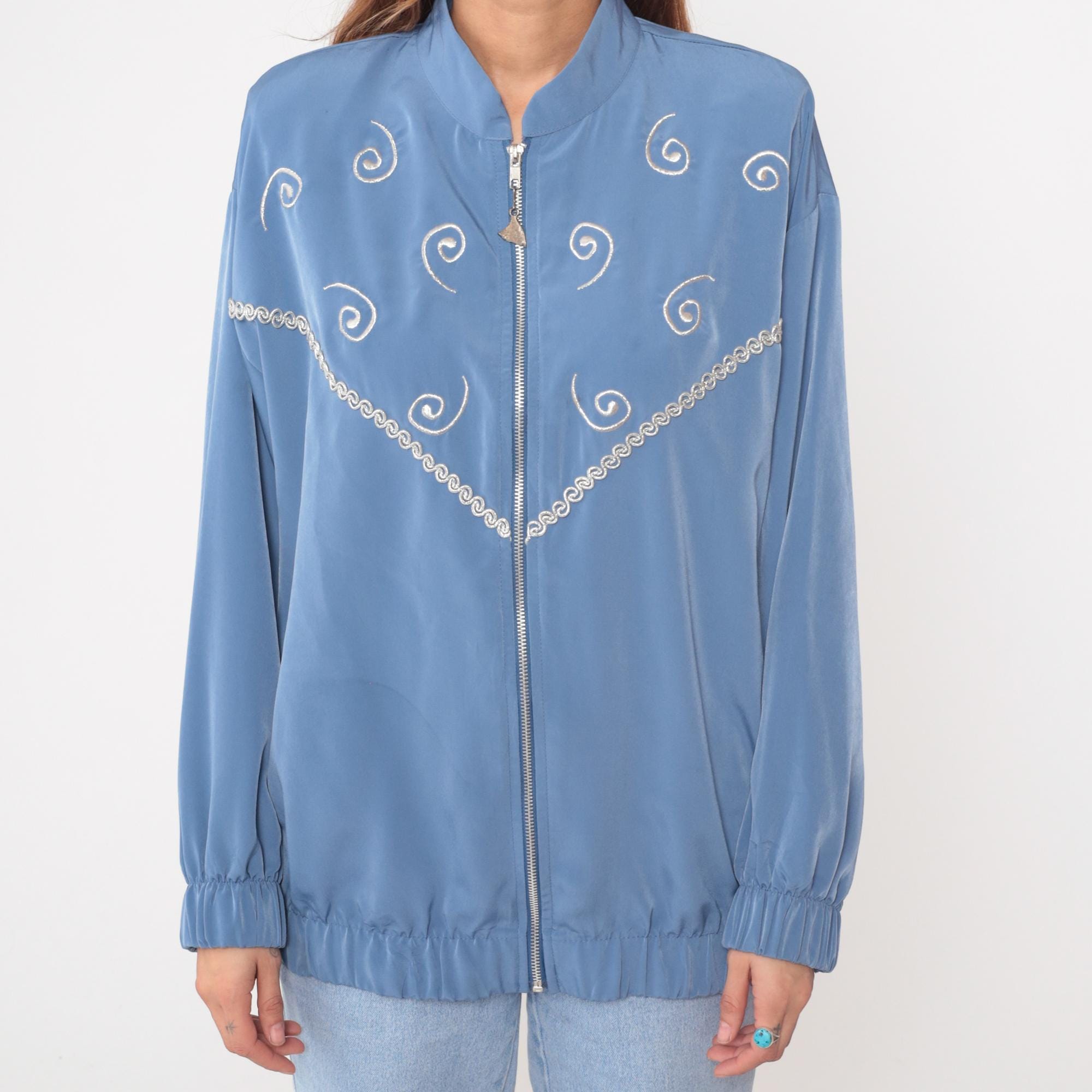 90s powder blue bomber jacket from Silver Threads with white spiral embroidery across the fabric and scalloped embroidered trim detail along the chest. Full front zipper closure with stand collar, long sleeves with elastic cuffs, and elastic hem at waist.
