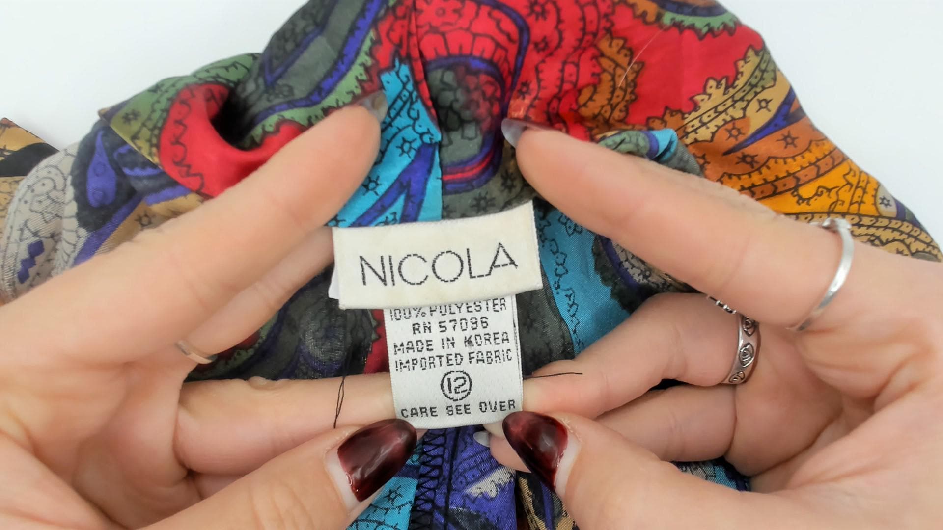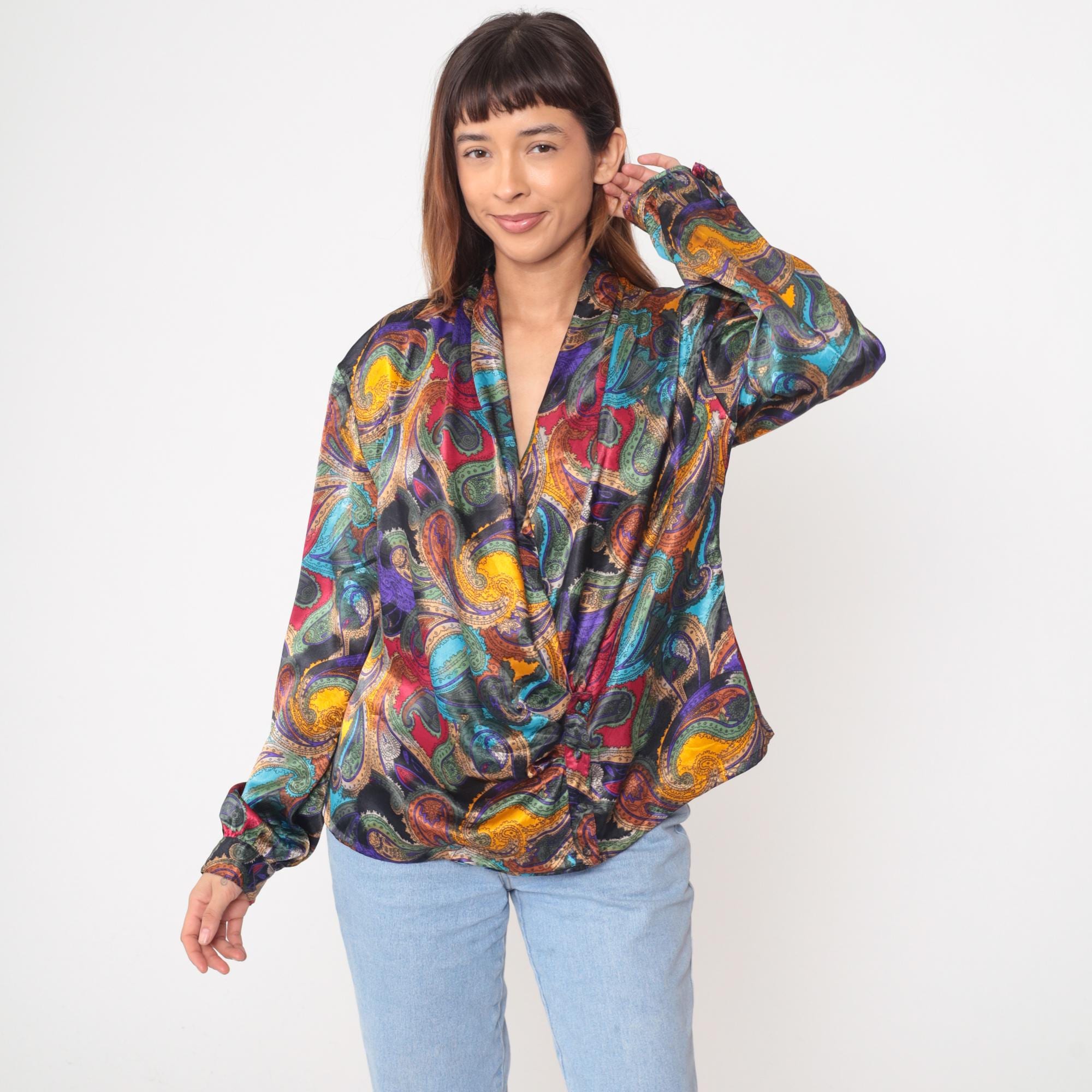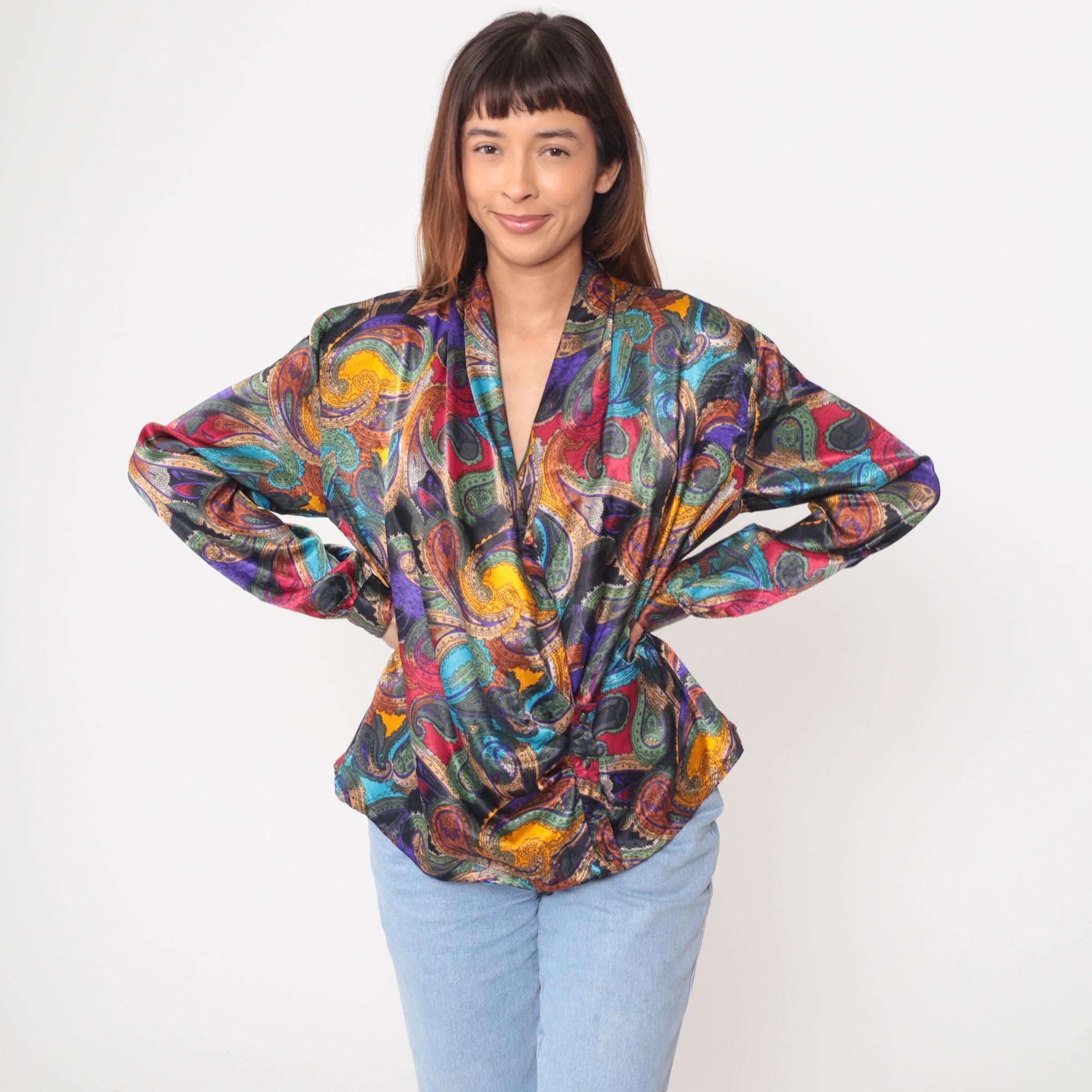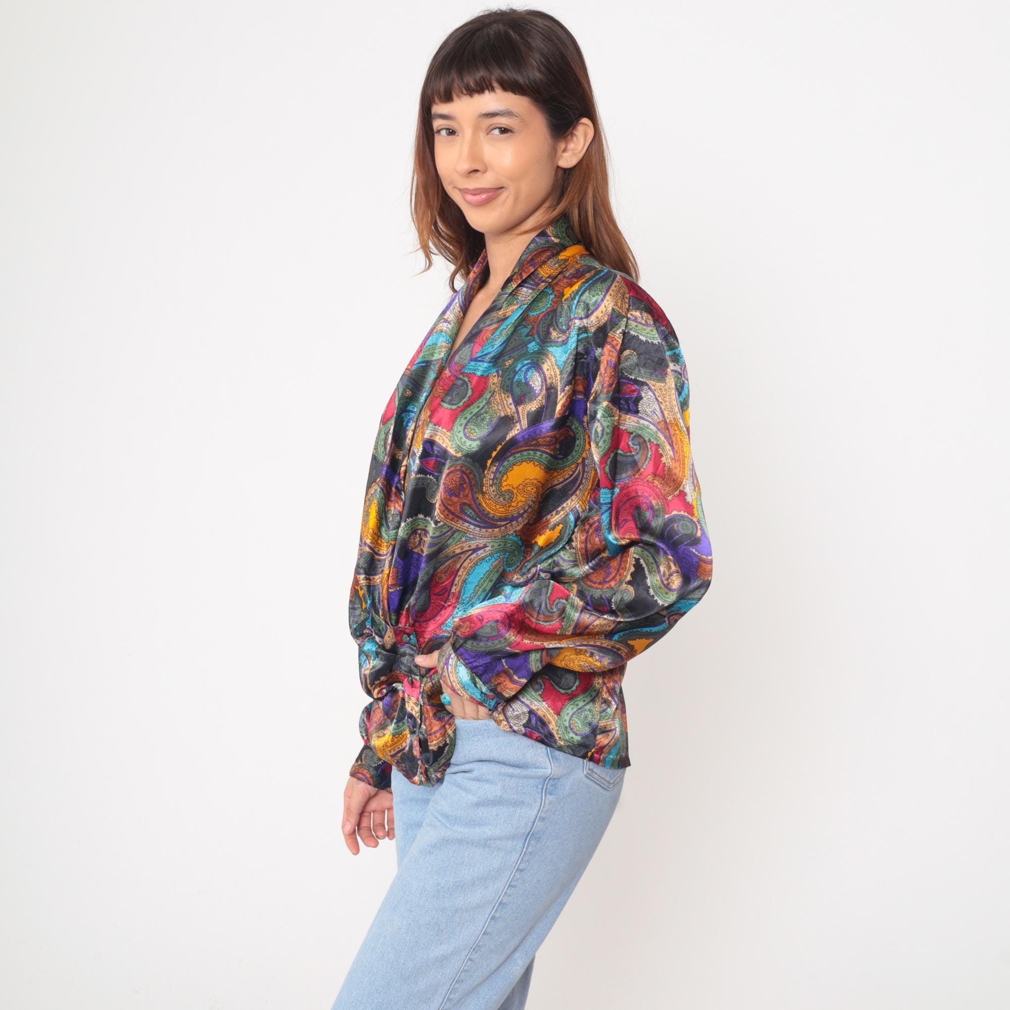 90s paisley blouse from Nicola with deep V-neck wrap front and long sleeves with button cuffs. Multicolored swirling paisley pattern in purple, turquoise, red, orange, yellow, and green on black background.