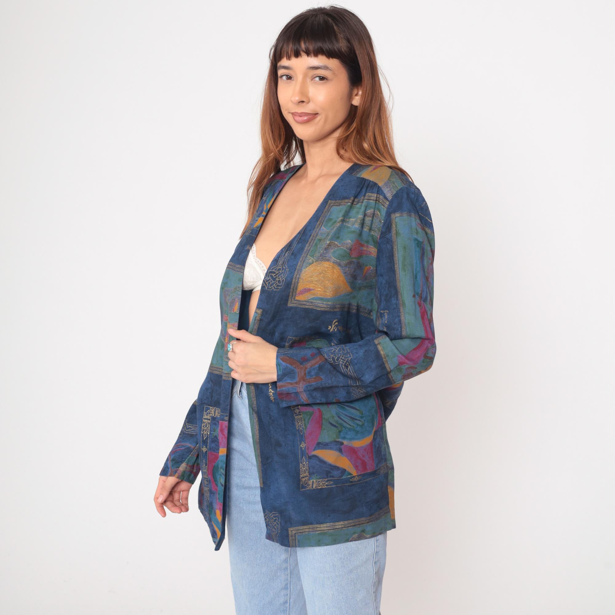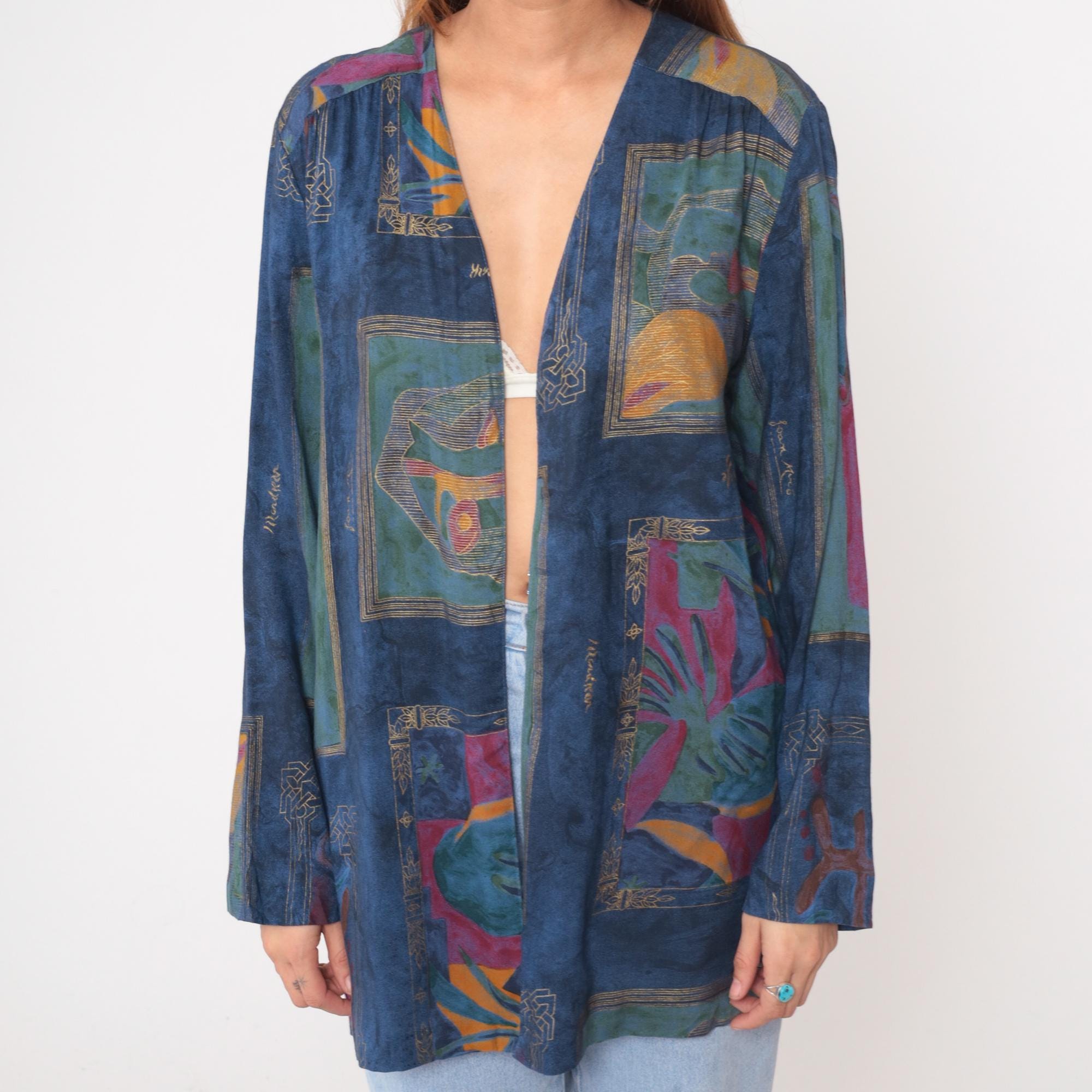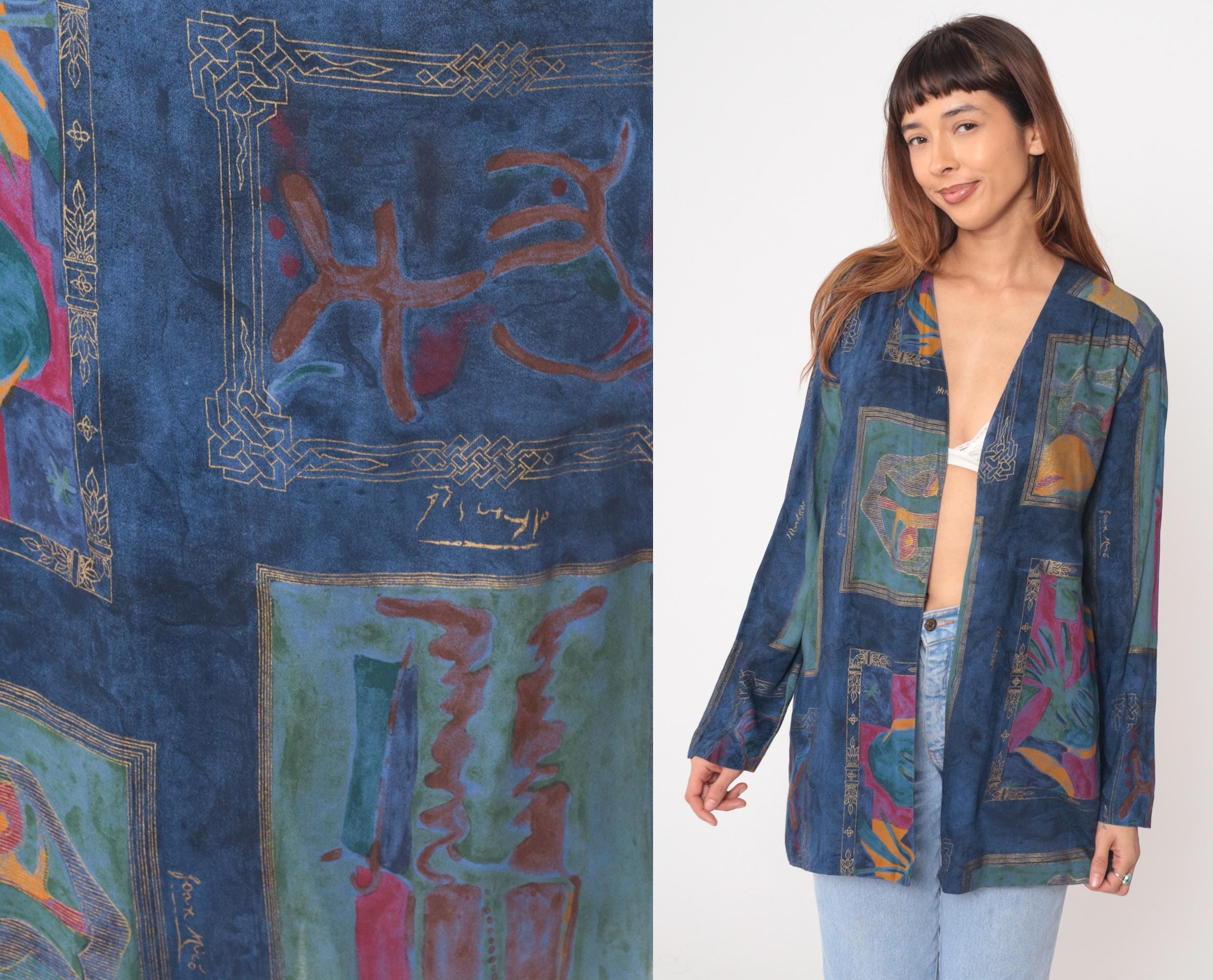 90s blue kimono jacket from Sequel with abstract geometric pattern and framed artistic designs throughout. Multi-colored print in teal, green, orange, and pink with gold embroidered borders around each frame motif.