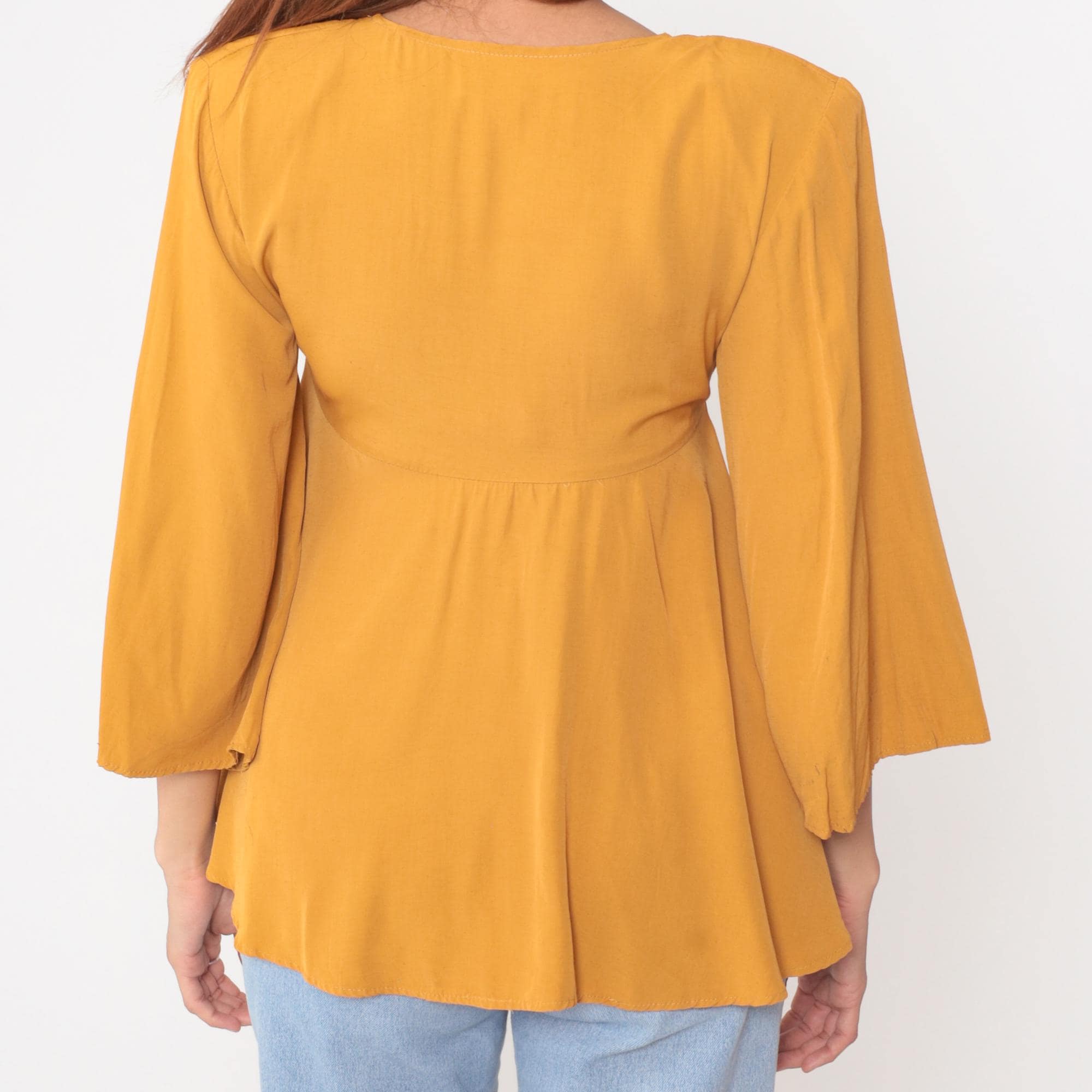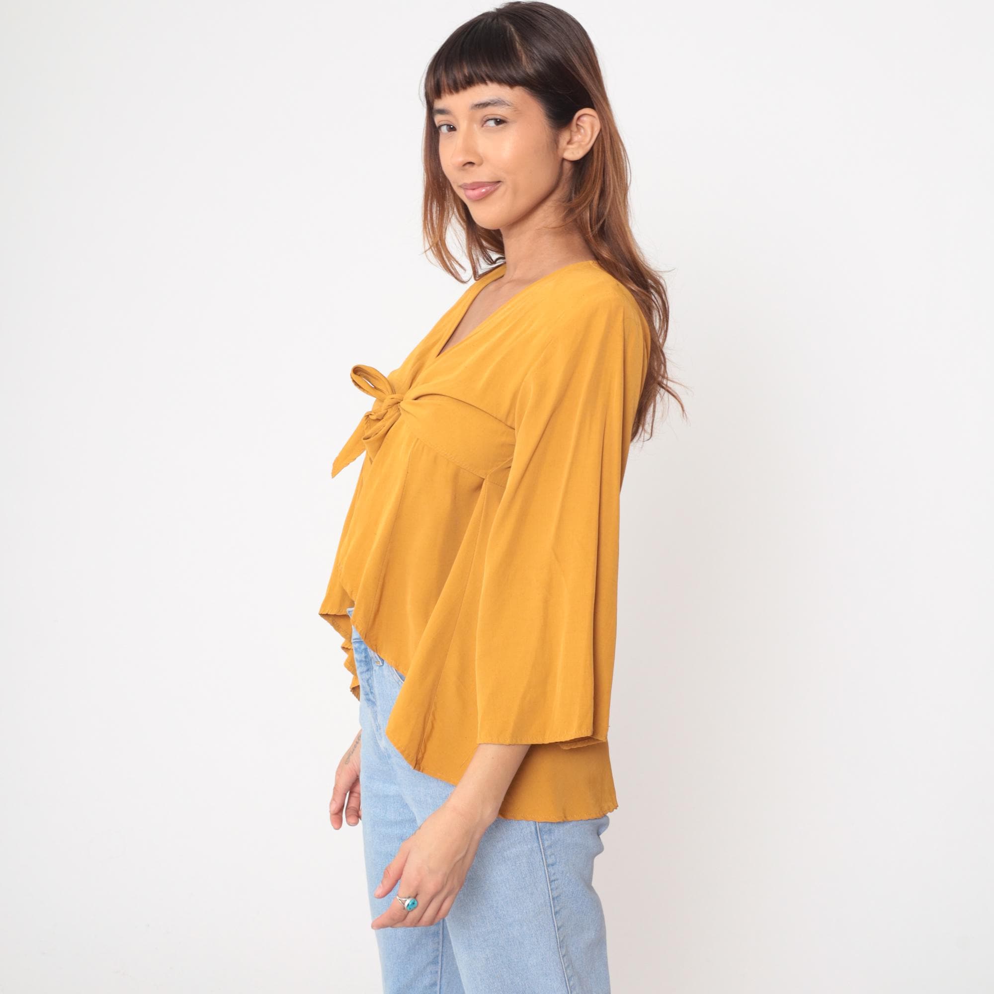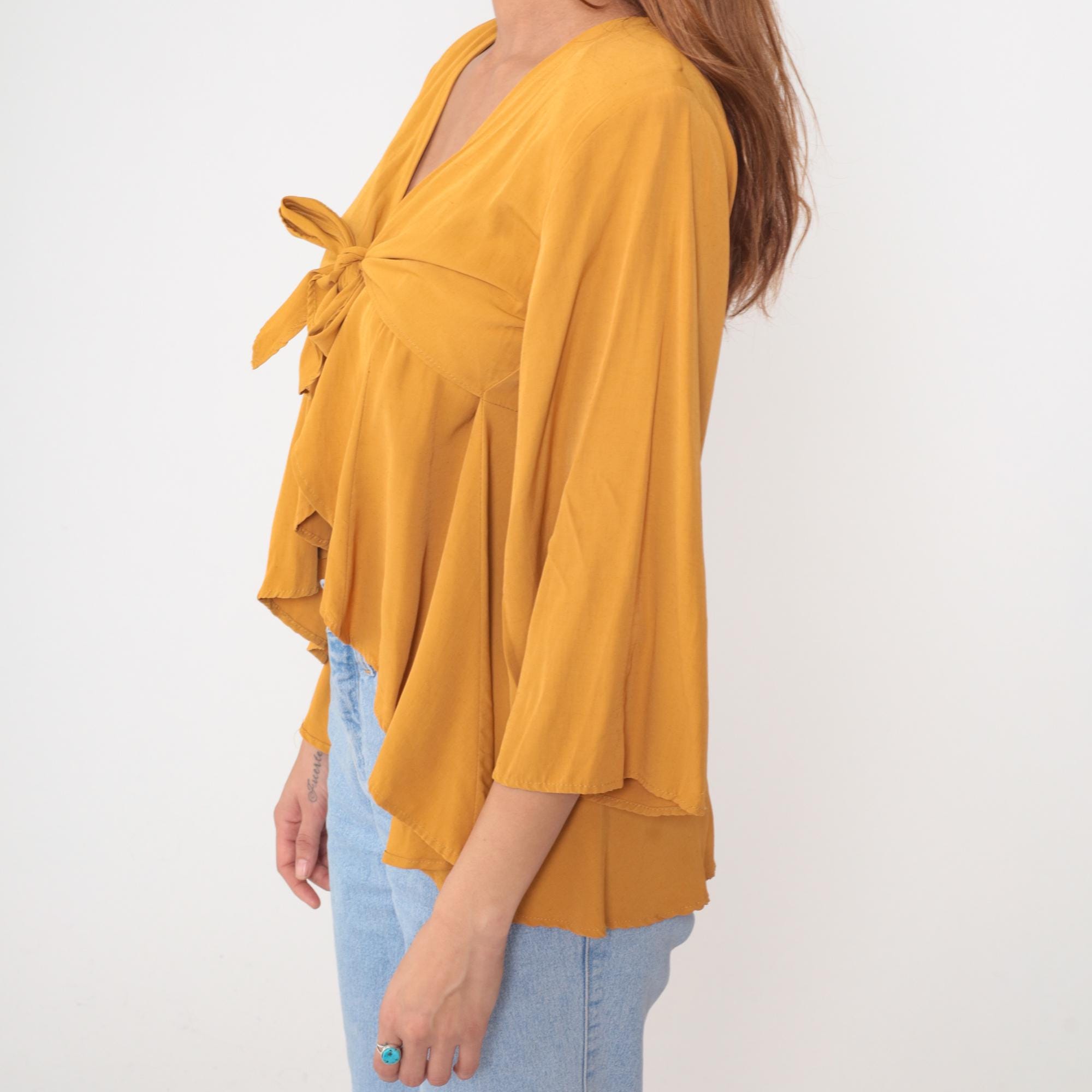 90s mustard yellow cropped top from Rondo with deep V-neckline and front tie closure at bust. Long sleeves and flared peplum hem with gathered detail below the tie.