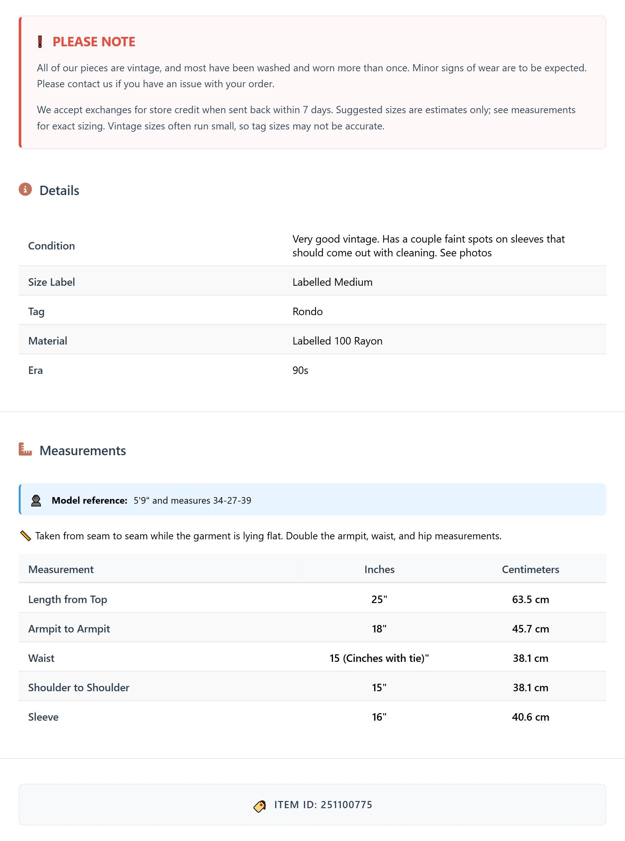 Suggested sizes are estimates only; see measurements for exact sizing. Vintage sizes often run small, so tag sizes may not be accurate.