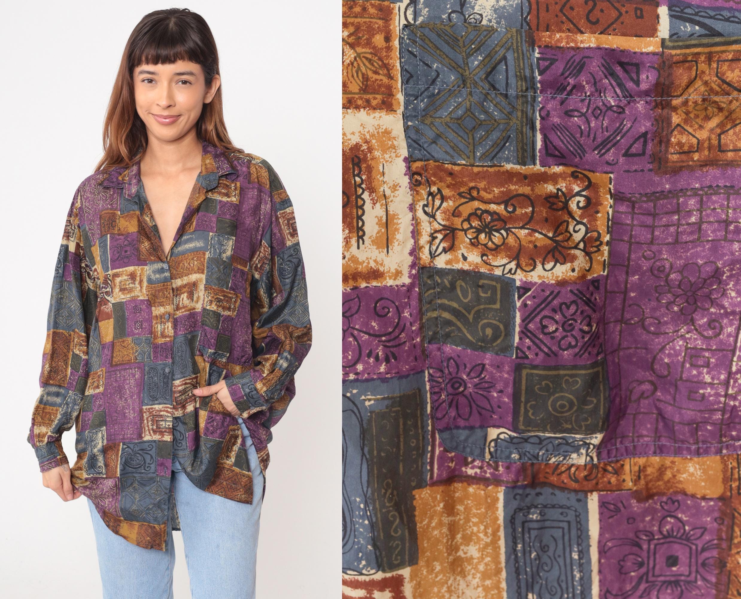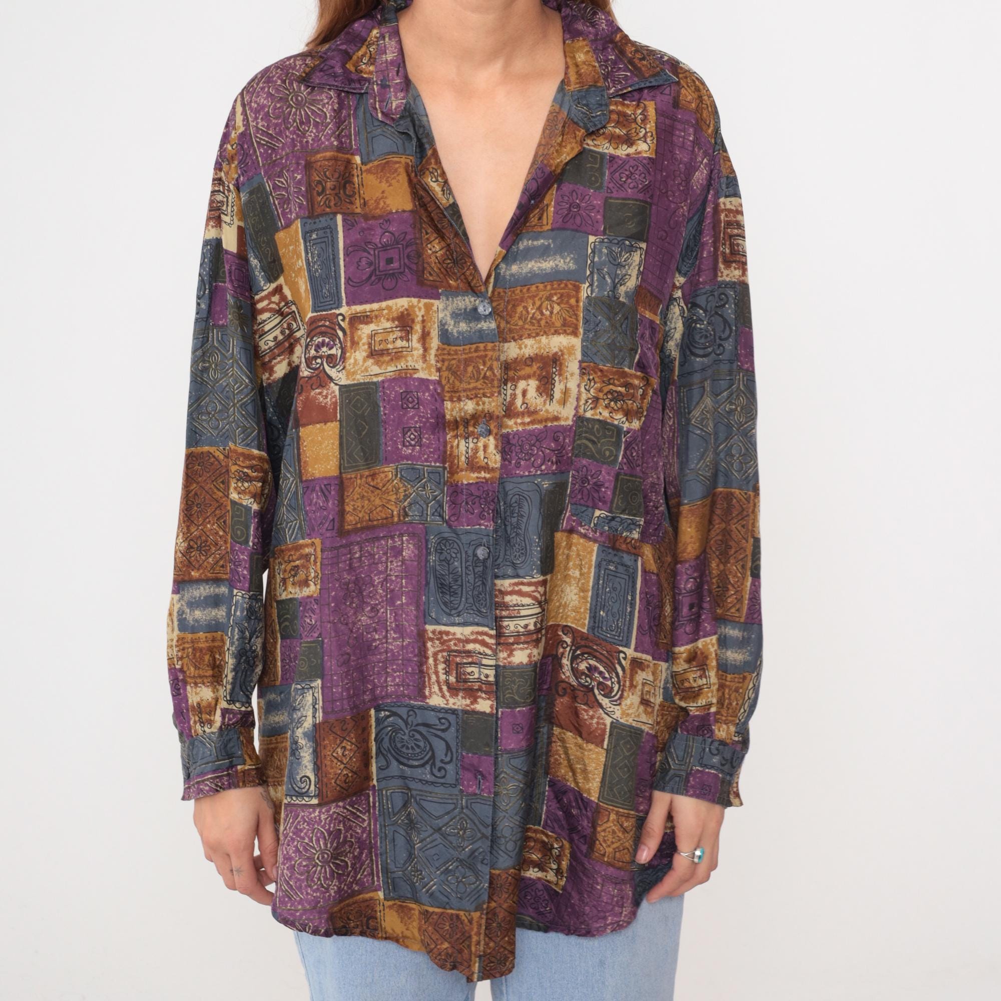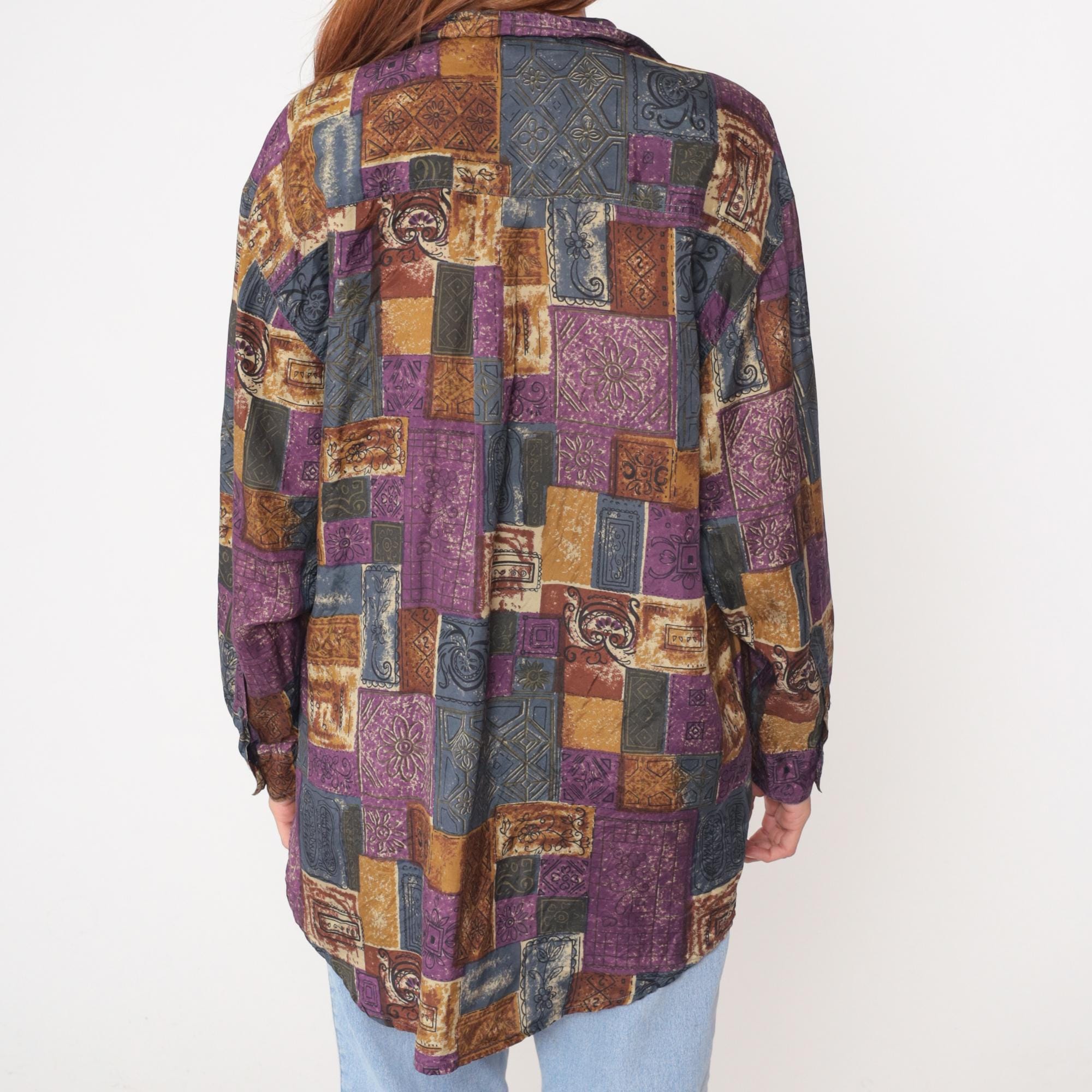 90s oversized silk shirt from Jane Ashley Woman with allover patchwork tile print in purple, gold, blue-gray, and brown tones. Each tile features different decorative motifs including scrollwork, geometric patterns, and ornamental designs. Long sleeves with button cuffs, collared neckline, button front closure.