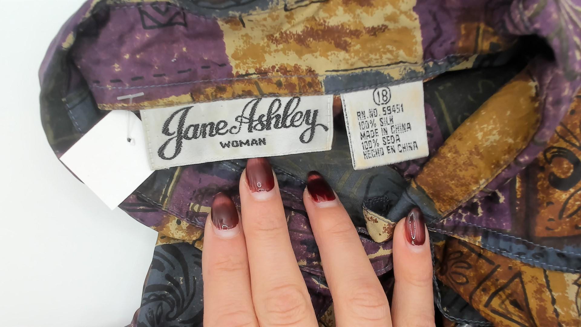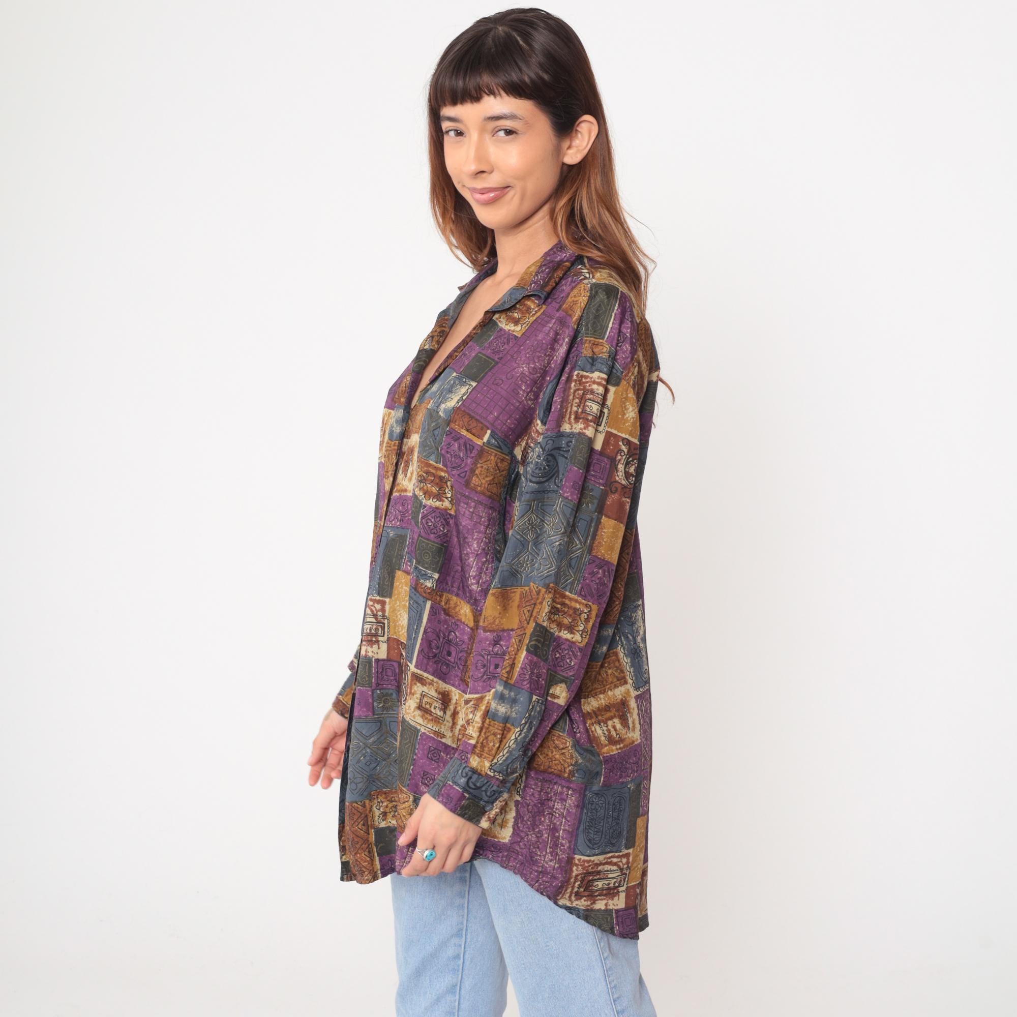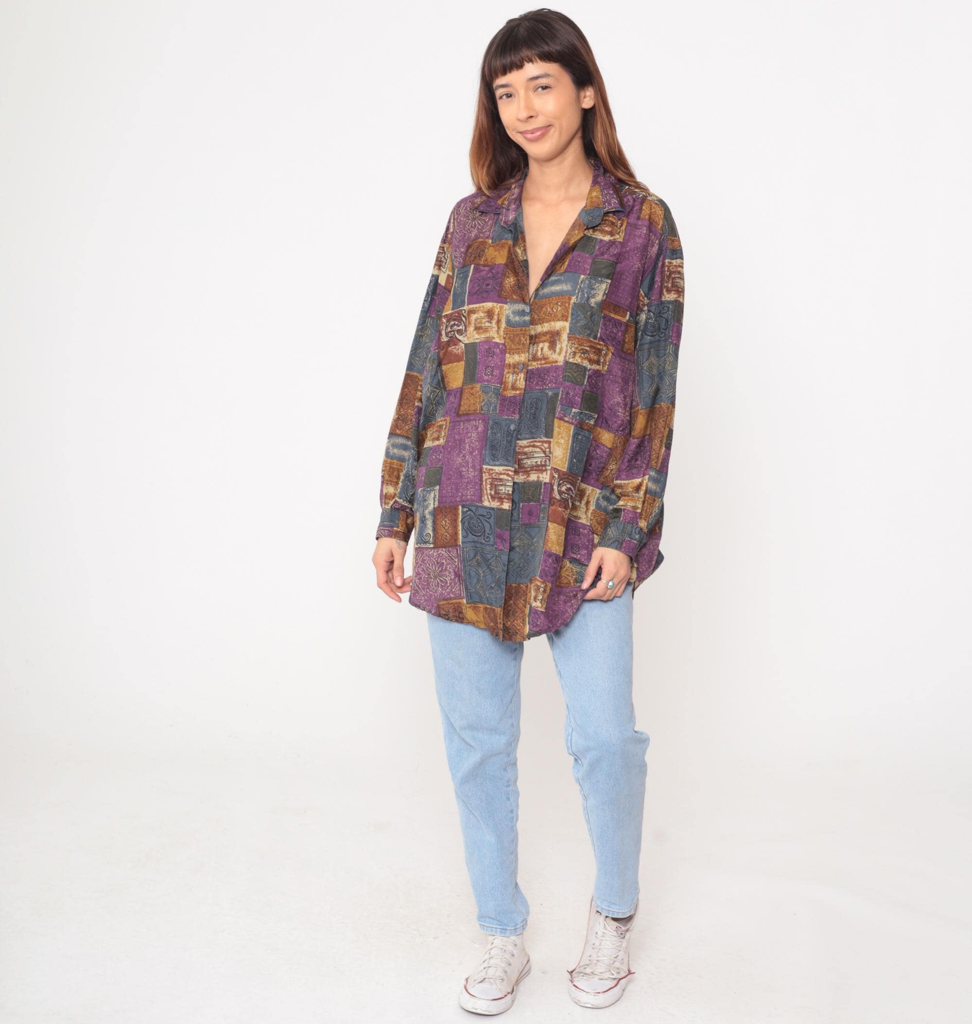 90s oversized silk shirt from Jane Ashley Woman with allover patchwork tile print in purple, gold, blue-gray, and brown tones. Each tile features different decorative motifs including scrollwork, geometric patterns, and ornamental designs. Long sleeves with button cuffs, collared neckline, button front closure.