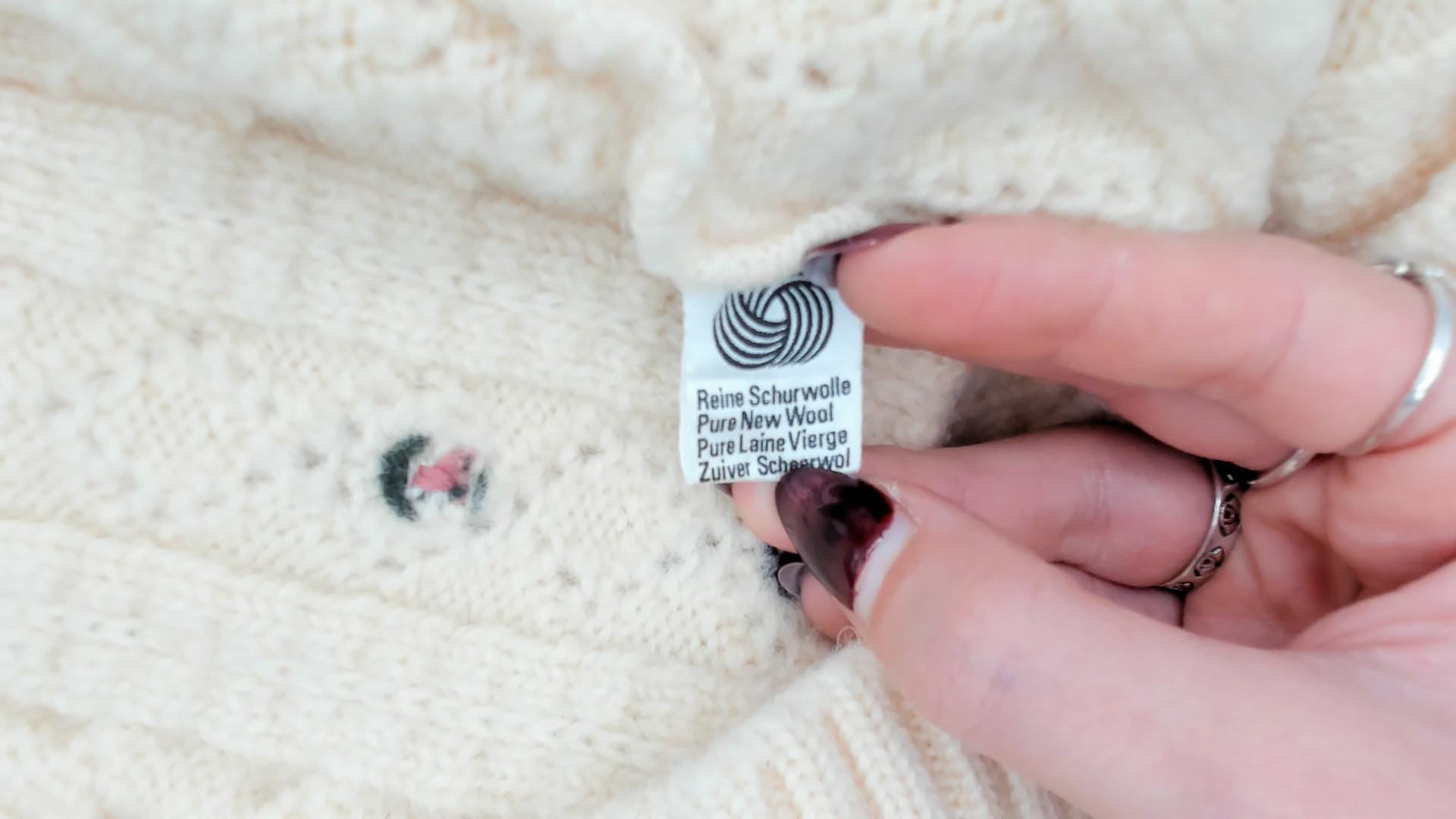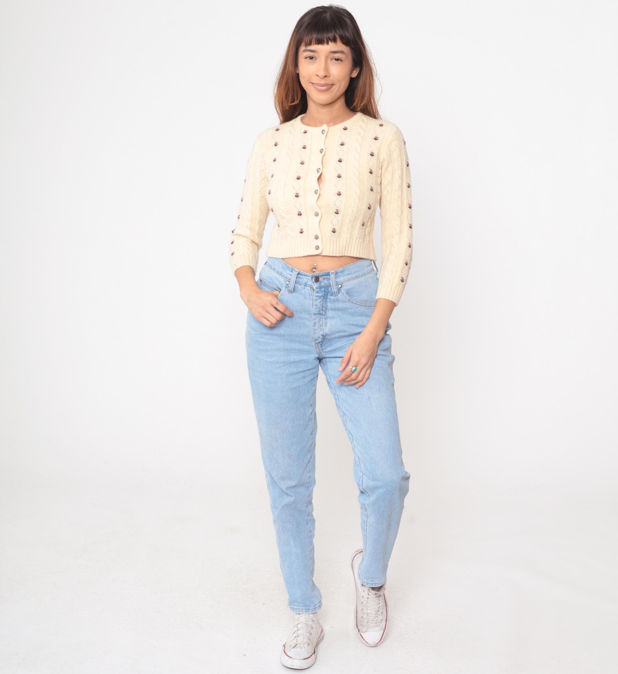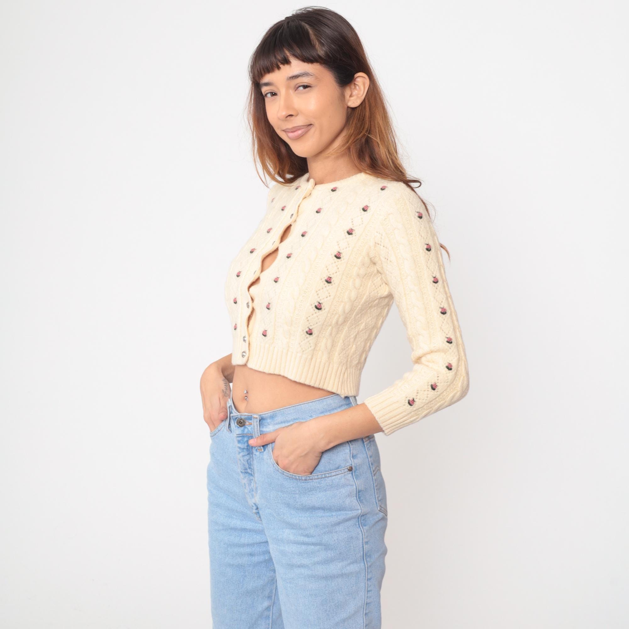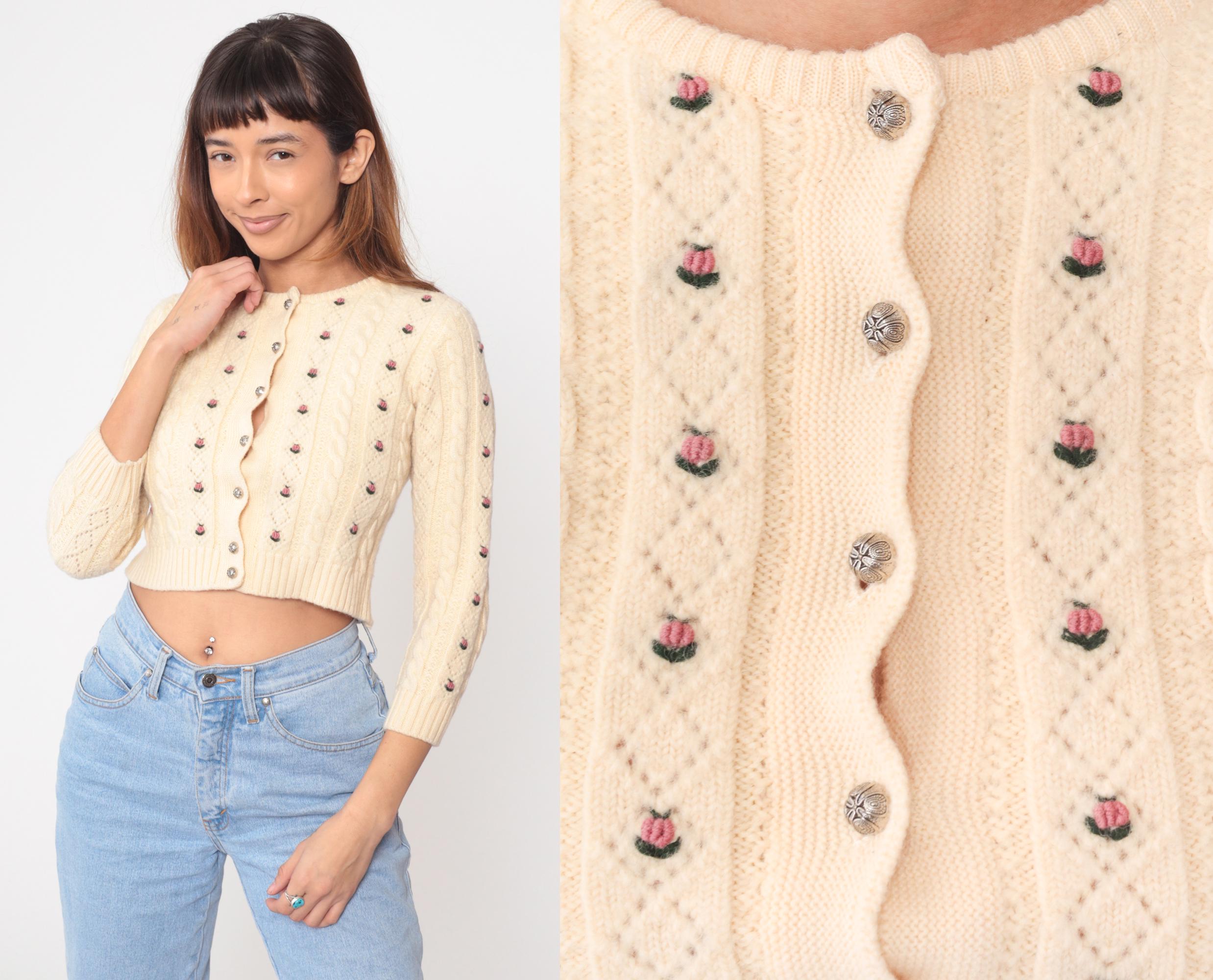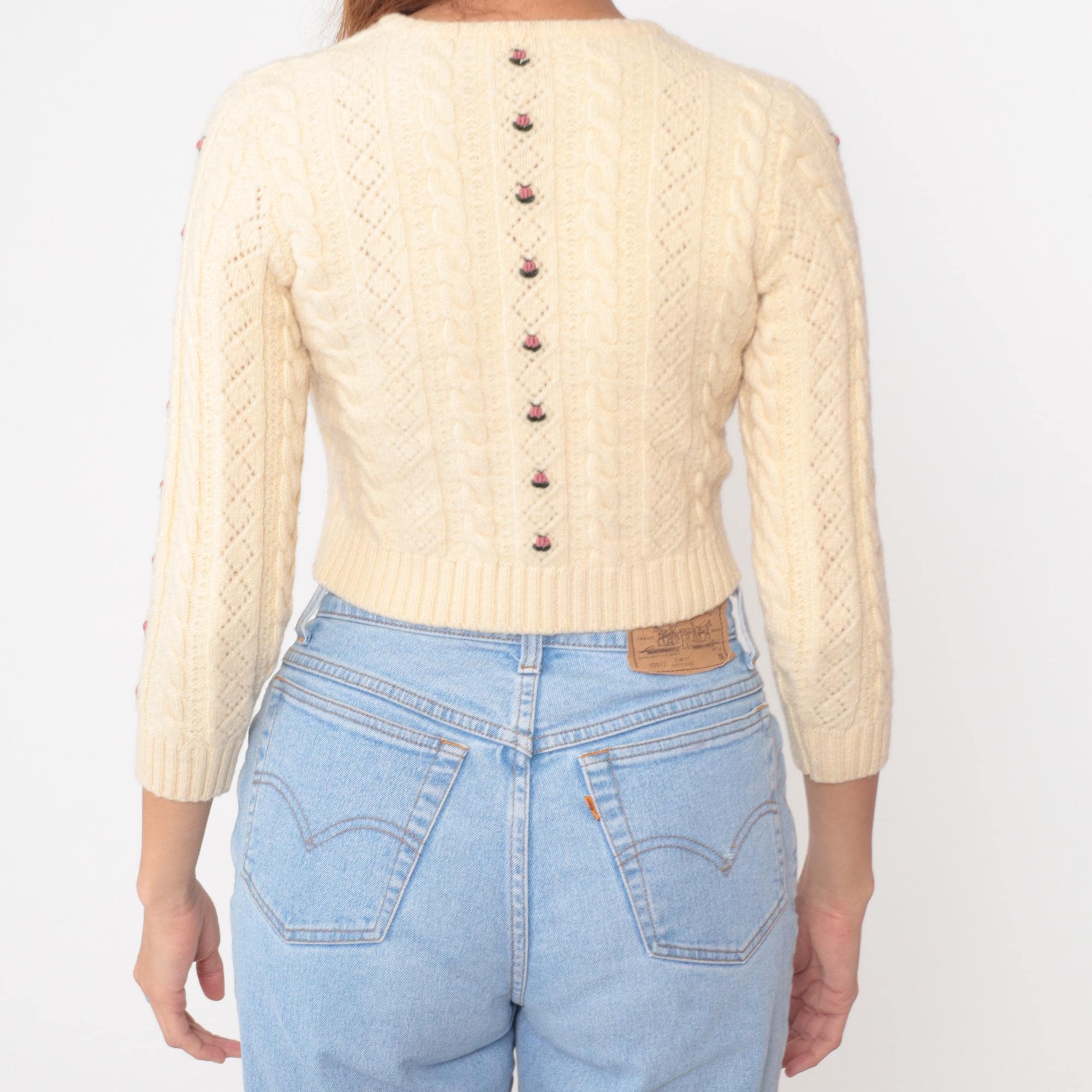 80s cream cable knit cardigan with embroidered pink flowers and green leaves scattered across the front and sleeves. Round neckline, long sleeves, metal button front closure. Cropped length ending at natural waist.
