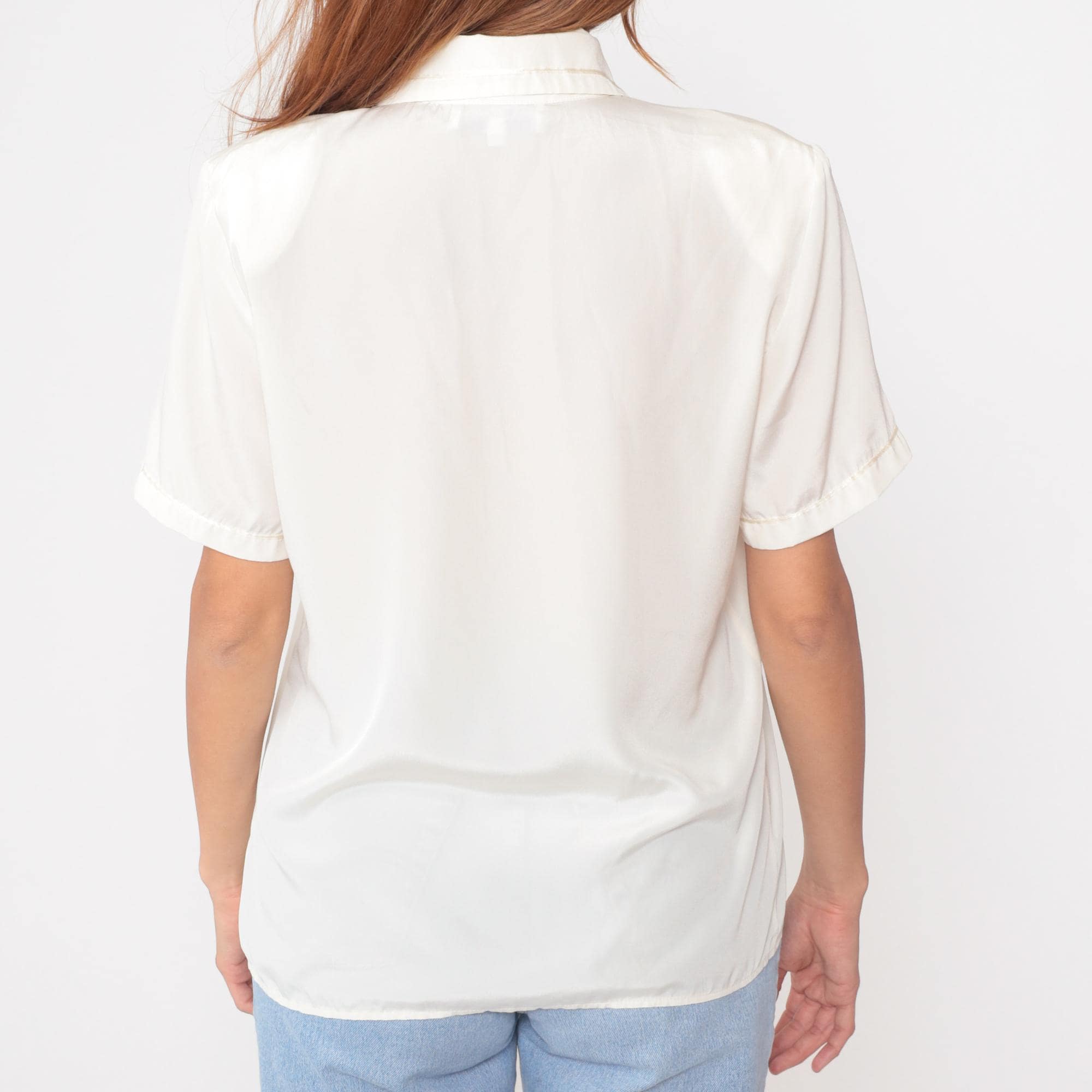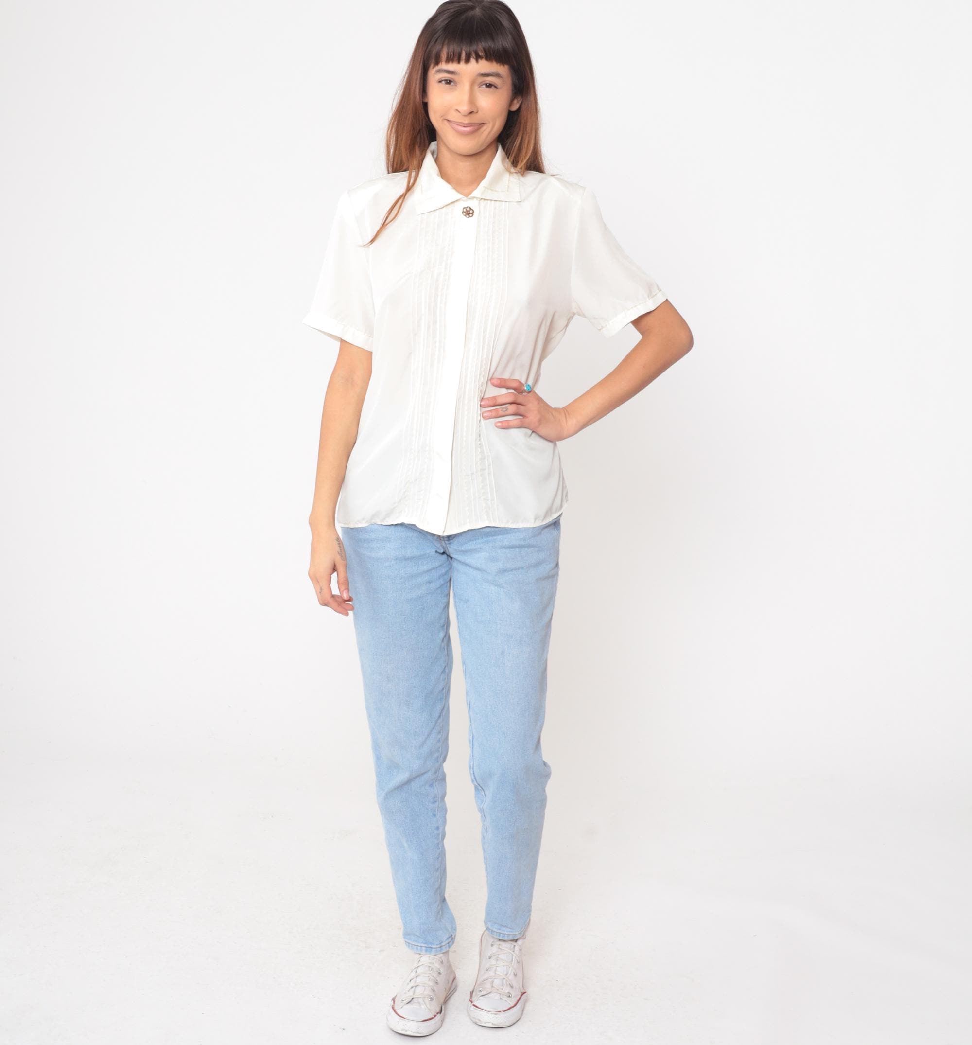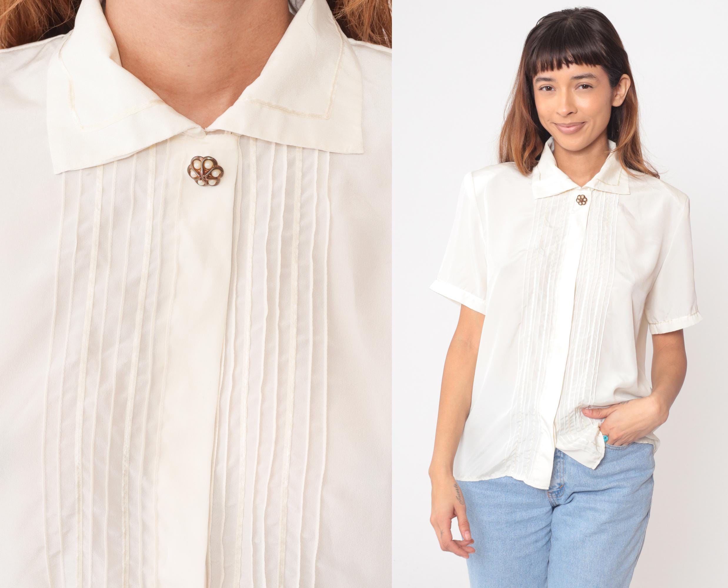 90s cream blouse from Casual Corner with pointed collar and pintuck pleated front panel. Short sleeves with turned cuffs, decorative gold button accent at neckline.