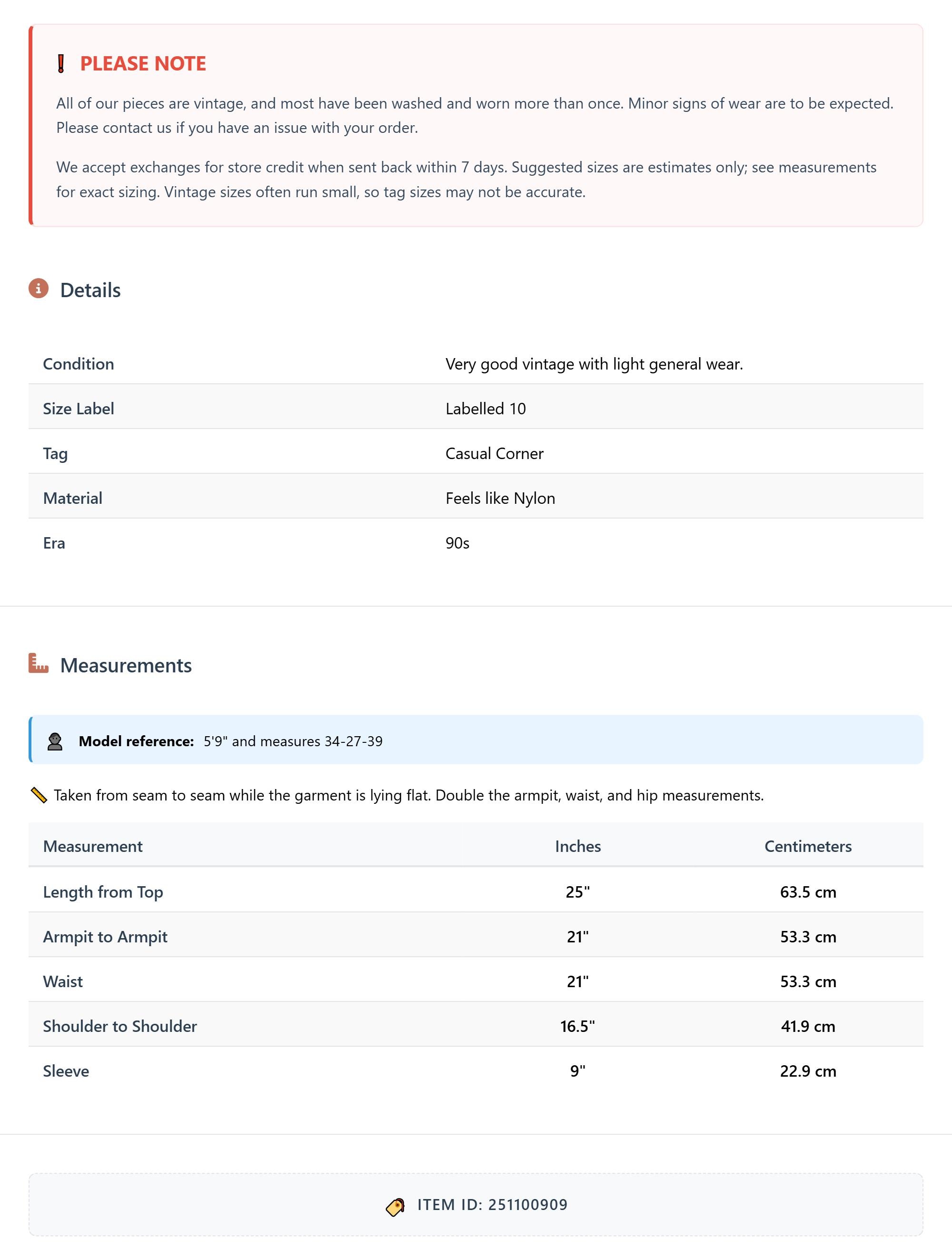 All of our pieces are vintage, and most have been washed and worn more than once. Minor signs of wear are to be expected. Please contact us if you have an issue with your order. We accept exchanges for store credit when sent back within 7 days.