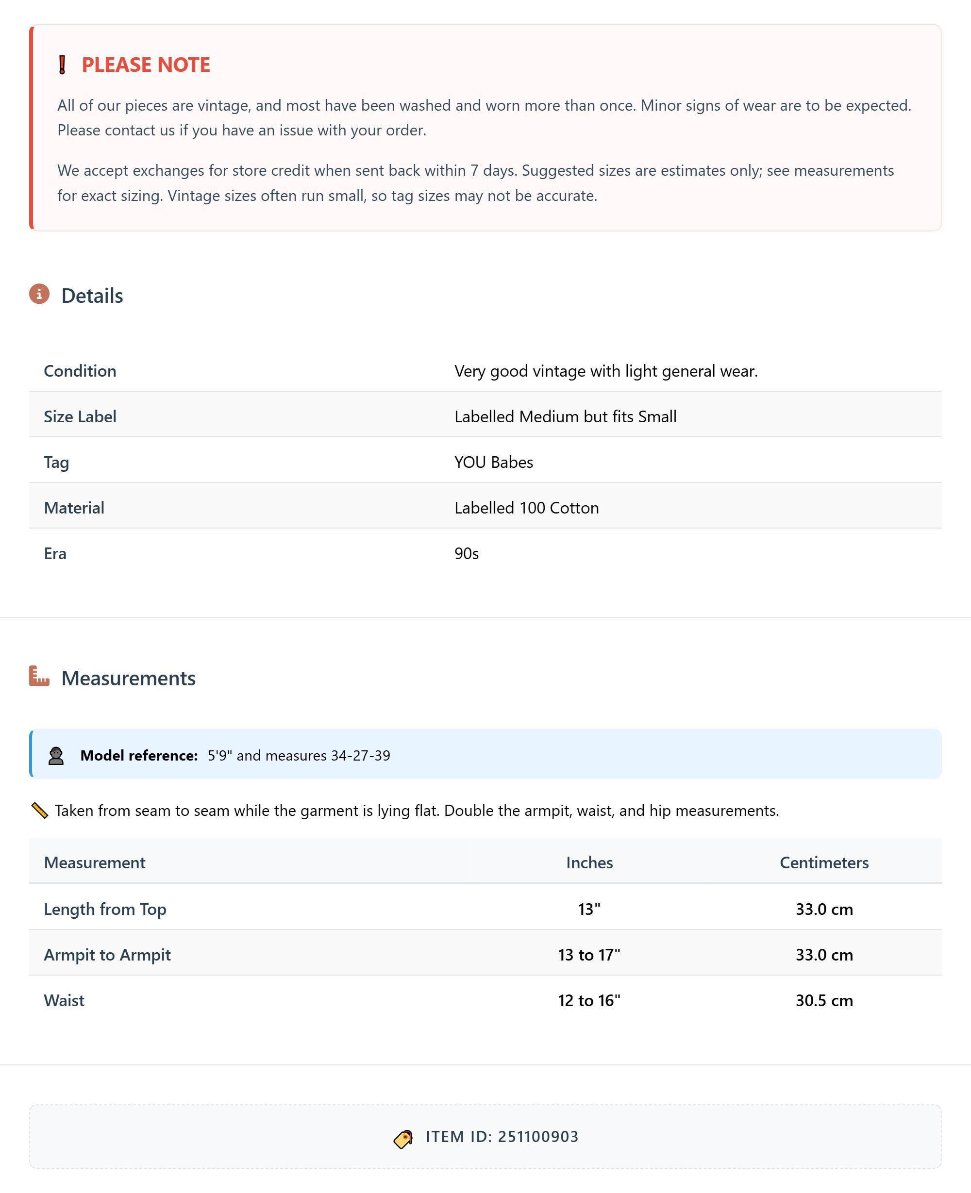 All of our pieces are vintage, and most have been washed and worn more than once. Minor signs of wear are to be expected. Please contact us if you have an issue with your order. We accept exchanges for store credit when sent back within 7 days.