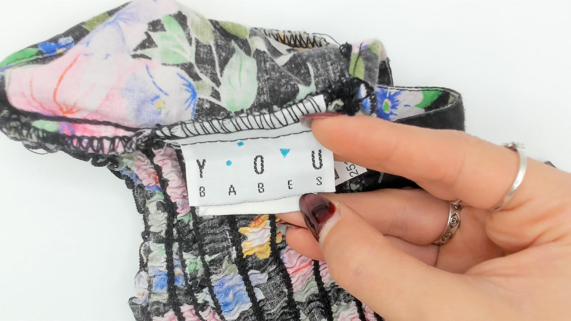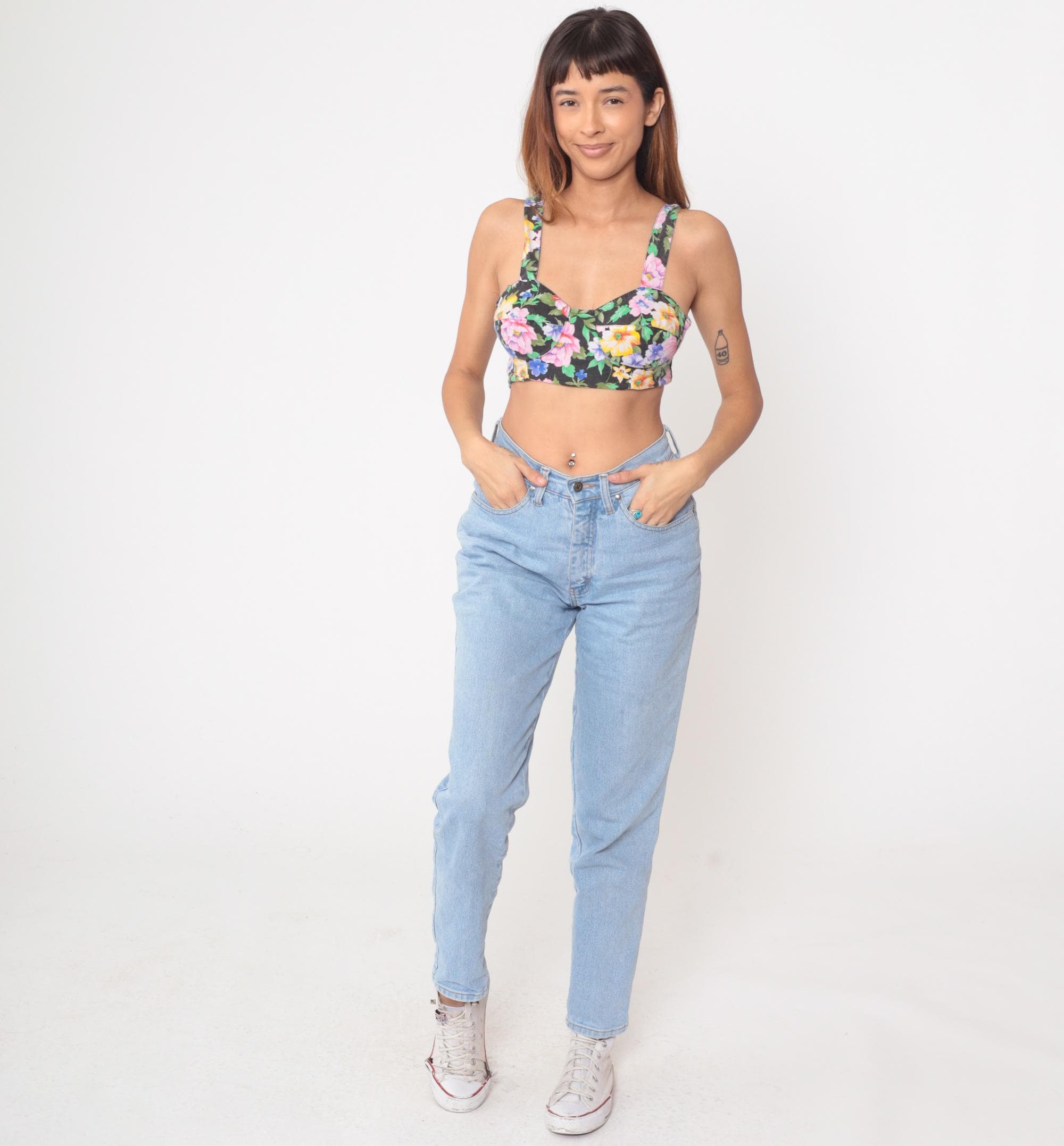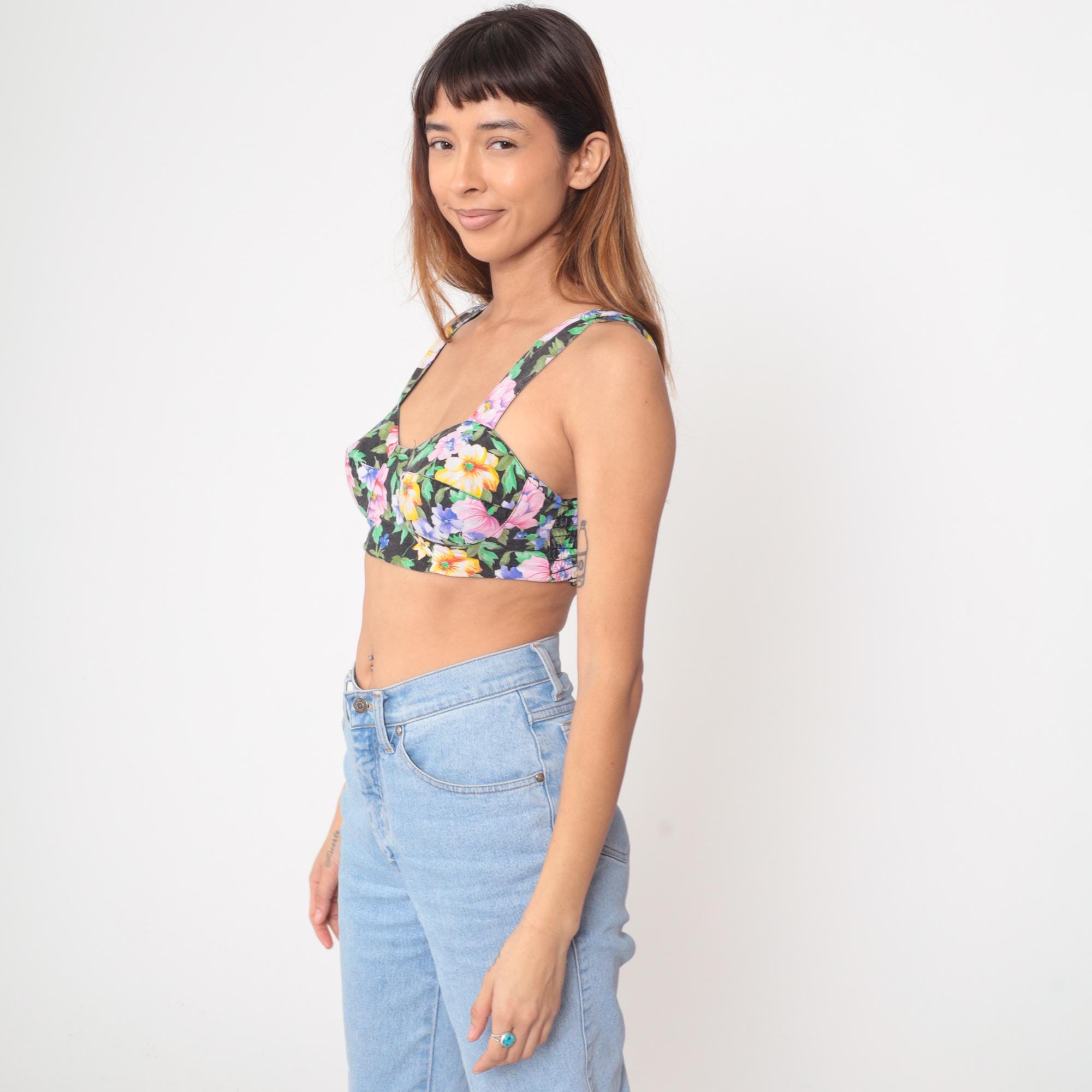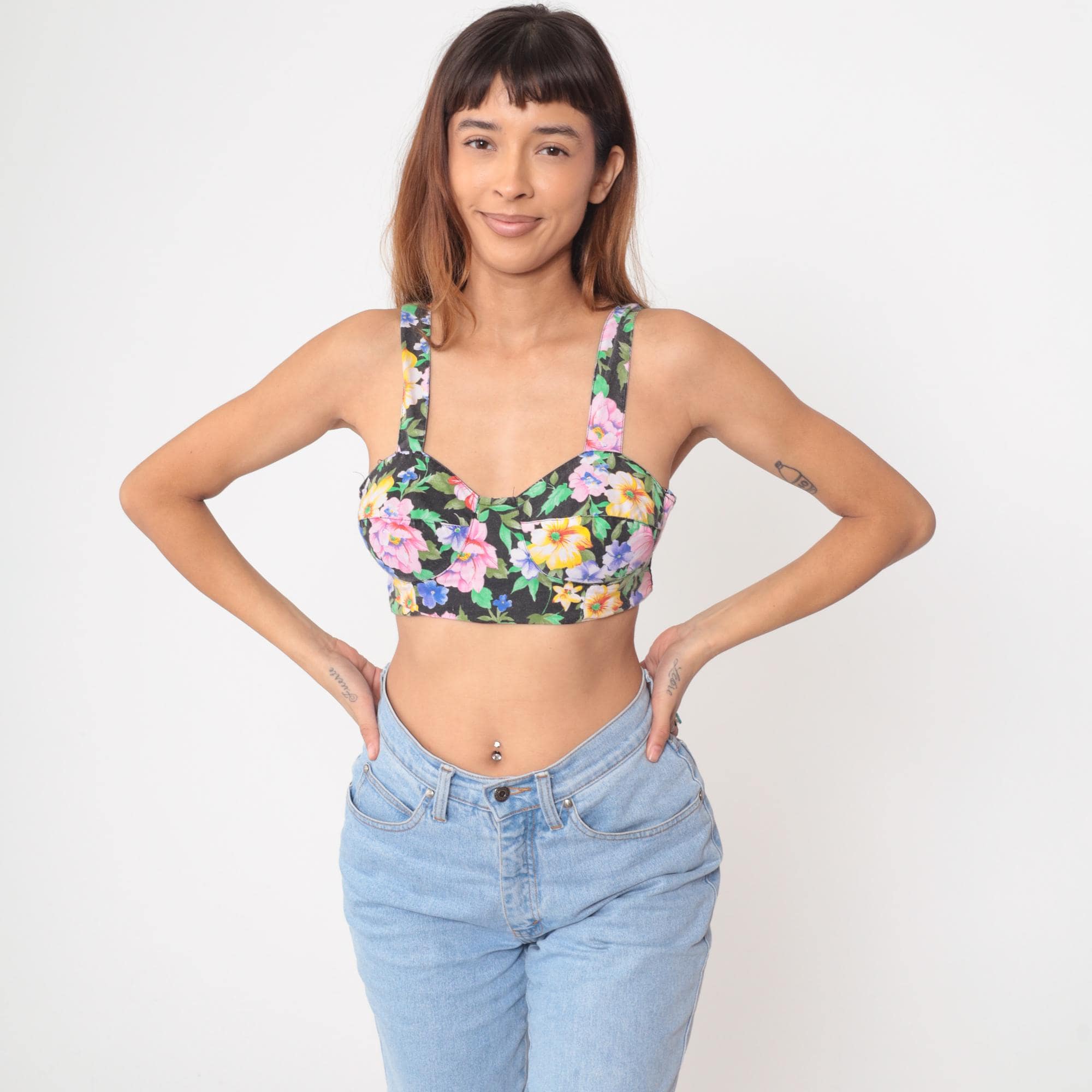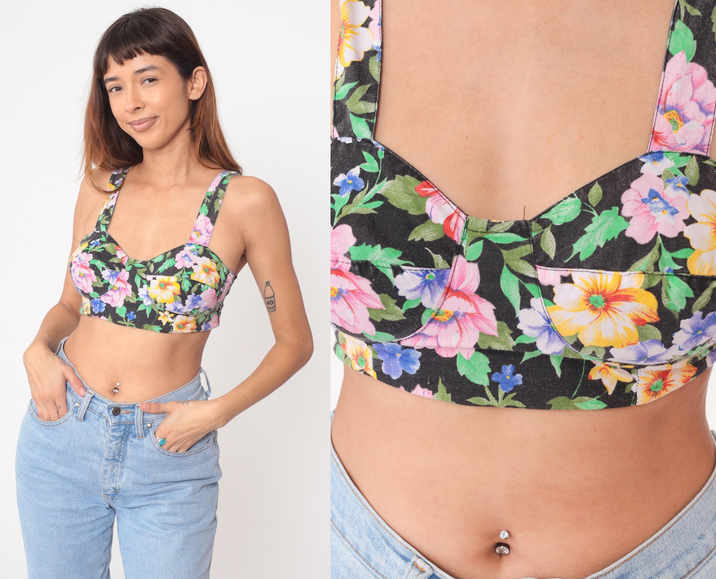 90s black floral crop top from YOU Babes with pink, yellow, blue, and green flowers across the fabric. Bralette style with underwire cups, scoop neckline, and wide shoulder straps. Smocked elastic back panel.