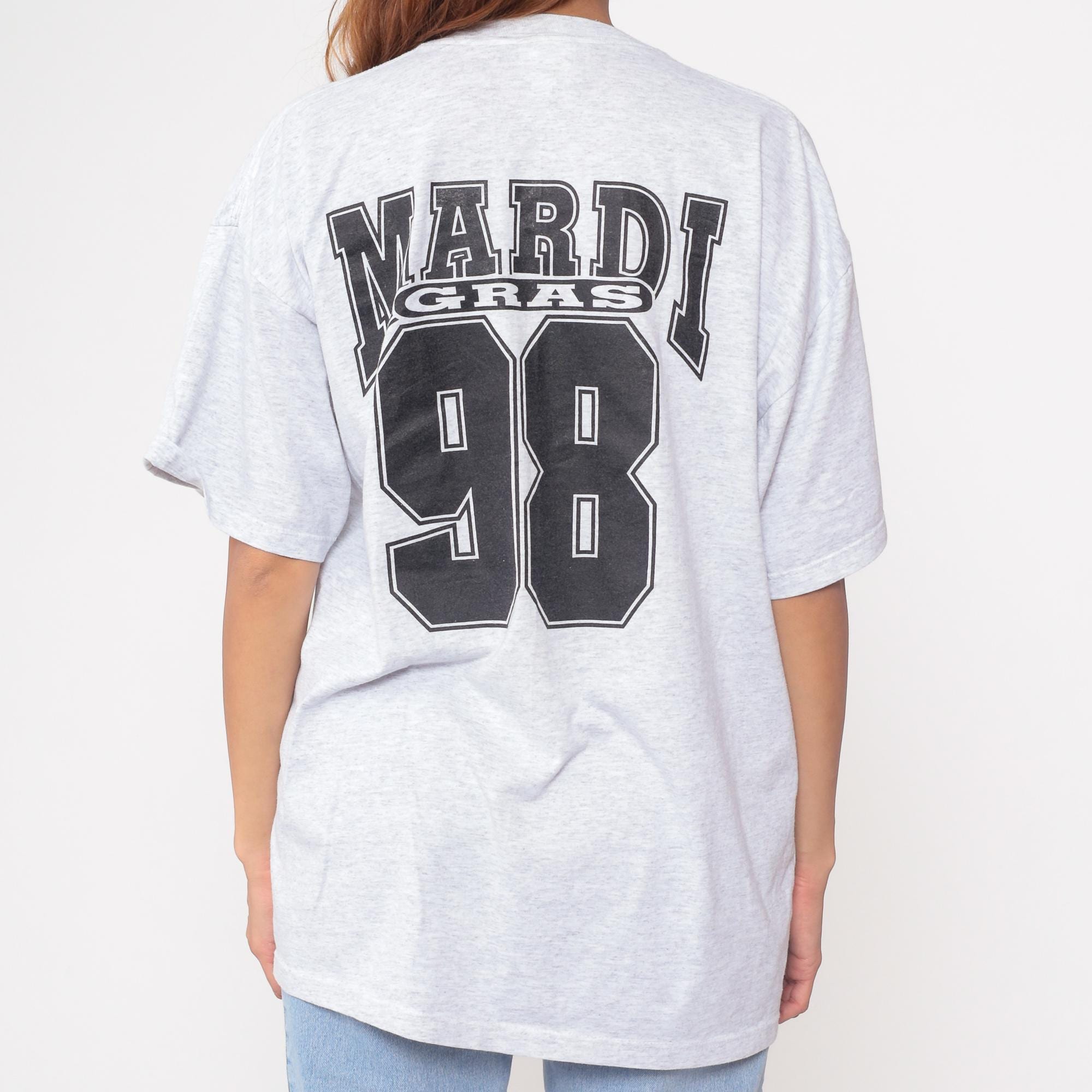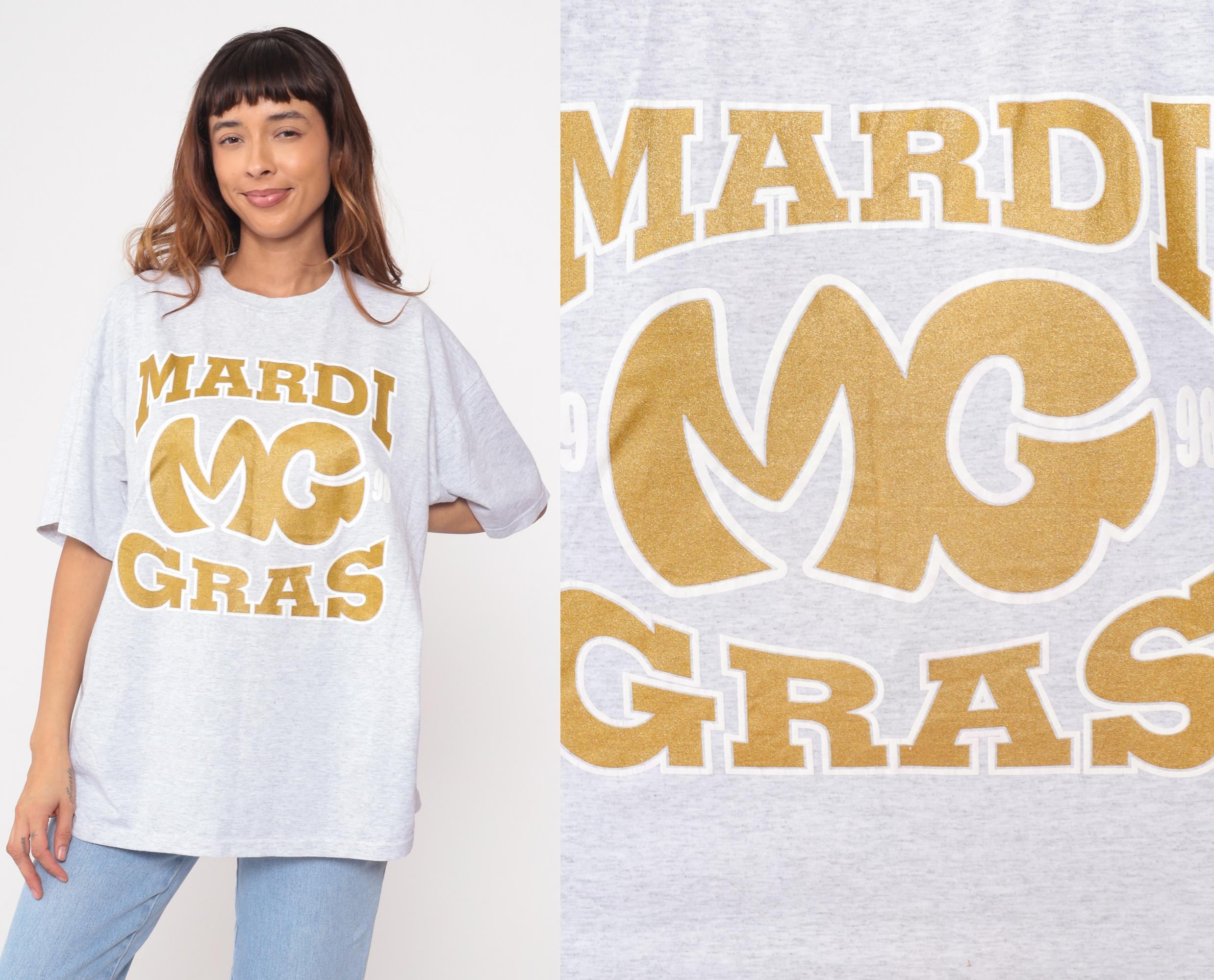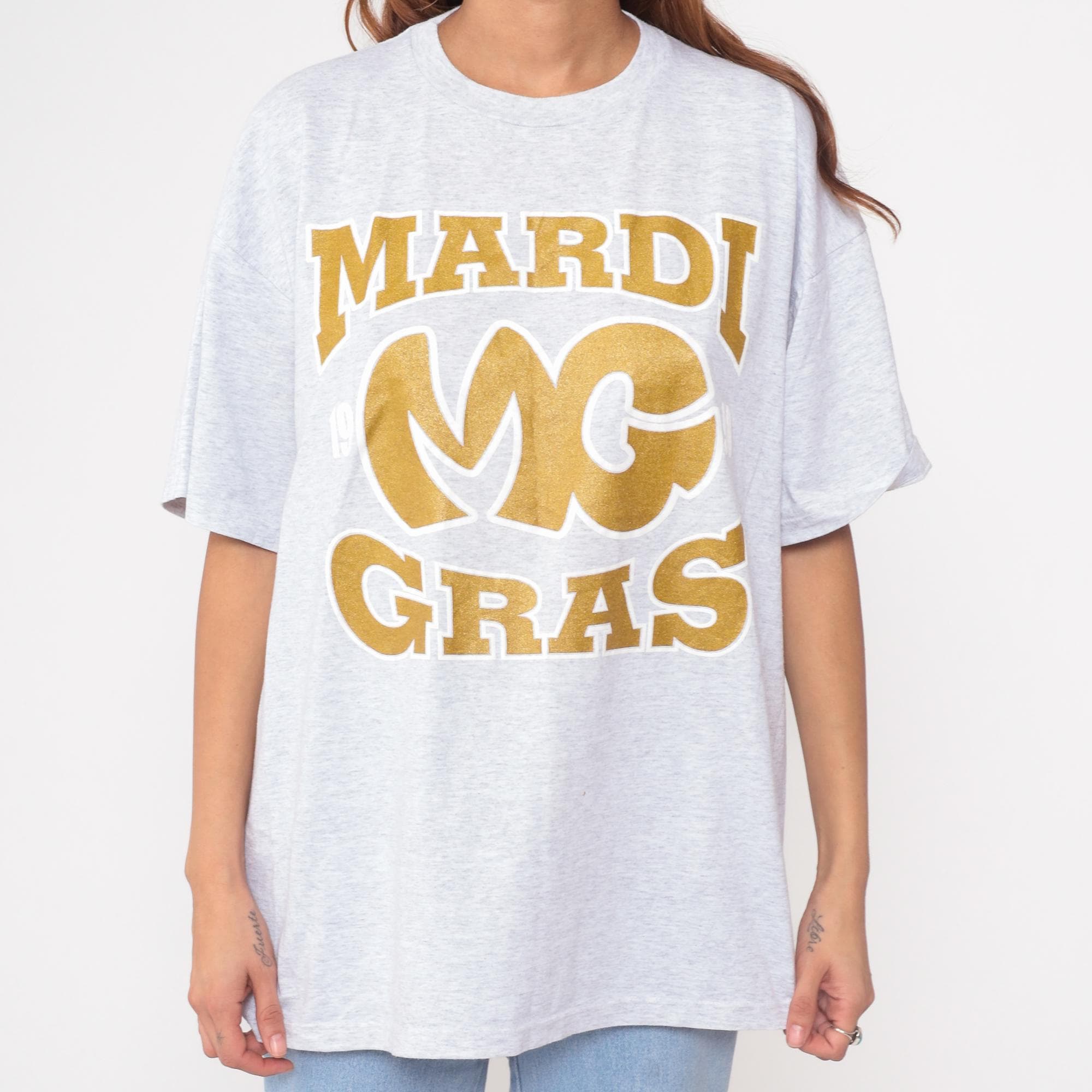 90s gray Mardi Gras t-shirt with gold graphics on front and back. Front features "MARDI GRAS" text with oversized "MG" logo, back displays "MARDI GRAS 98" in varsity-style lettering.