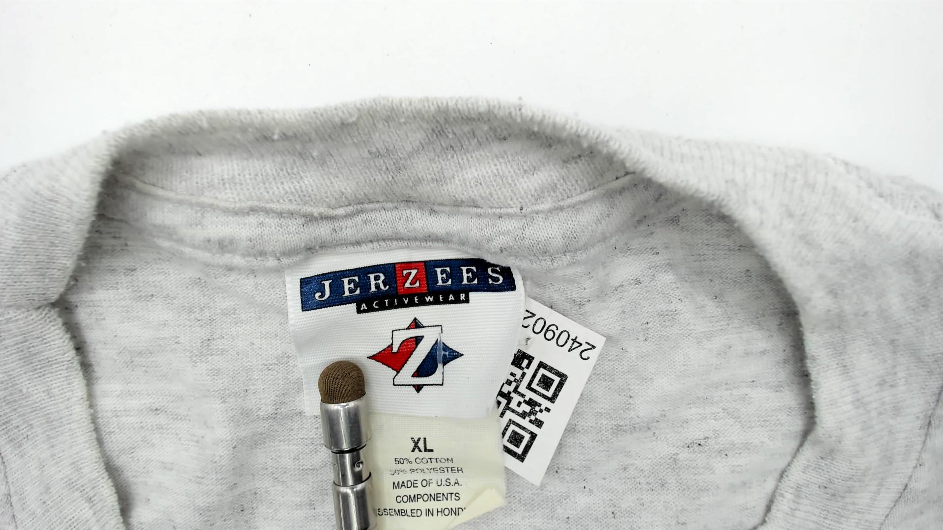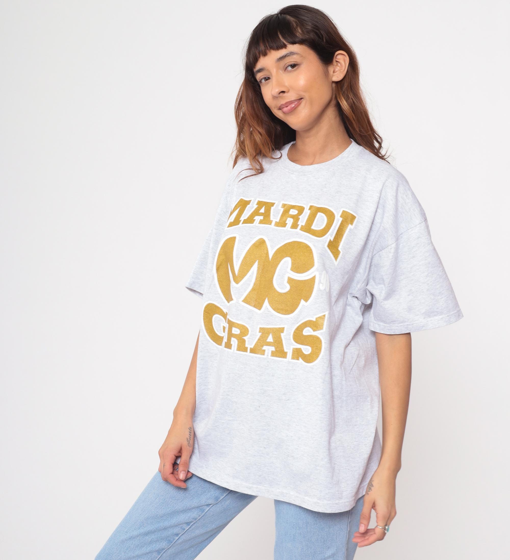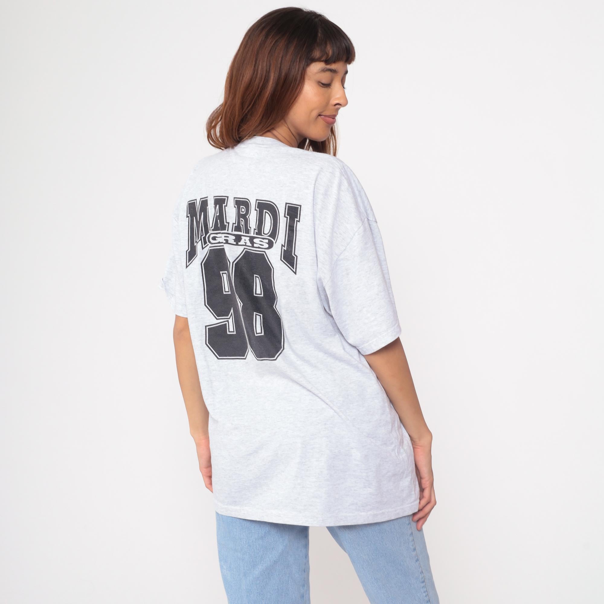 90s gray Mardi Gras t-shirt with gold graphics on front and back. Front features "MARDI GRAS" text with oversized "MG" logo, back displays "MARDI GRAS 98" in varsity-style lettering.