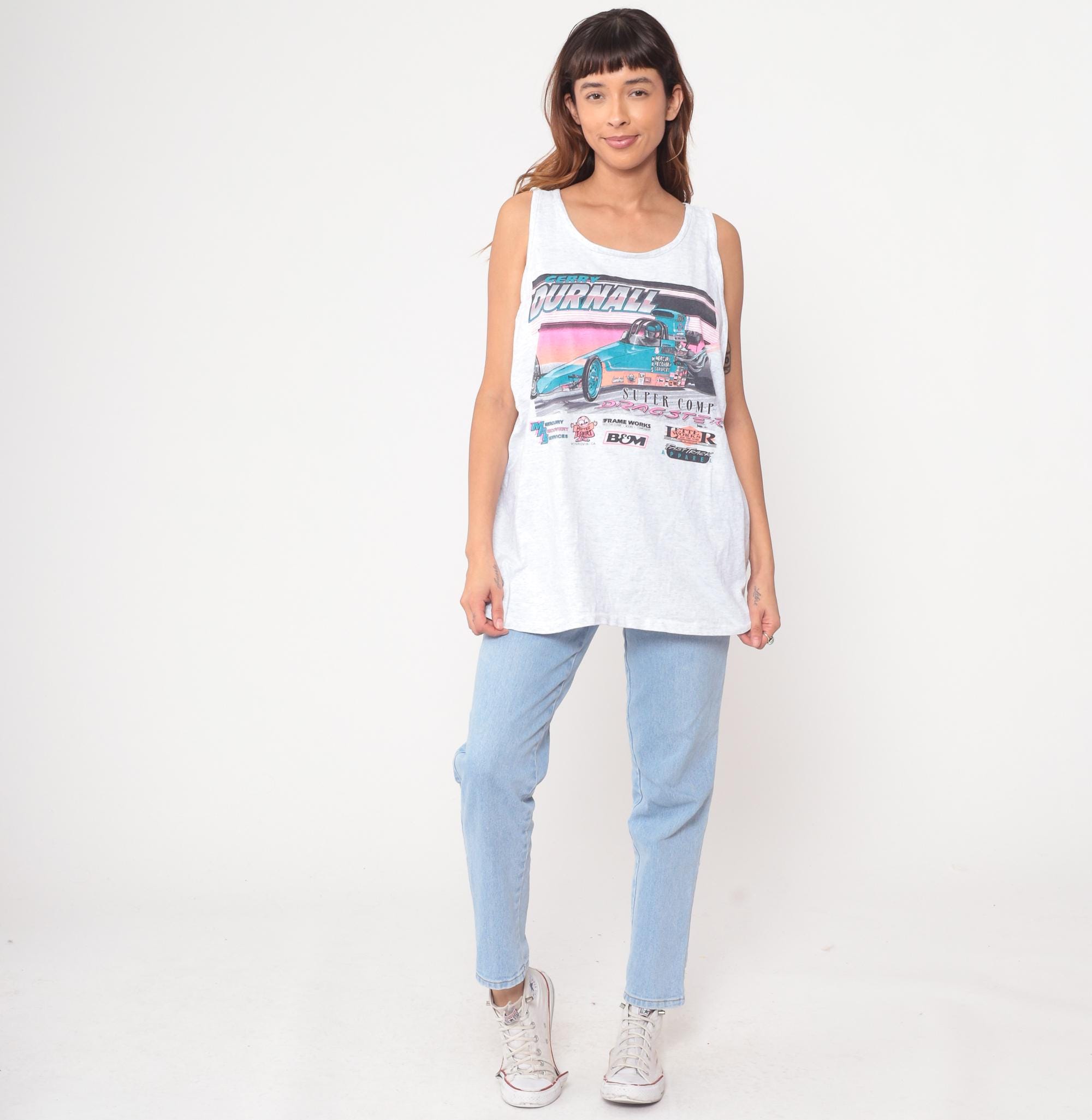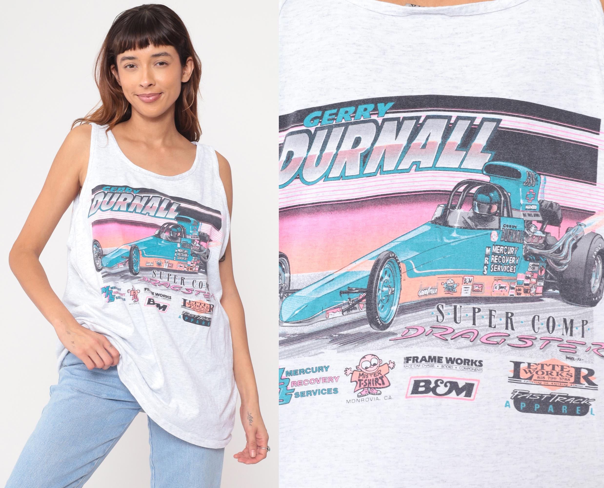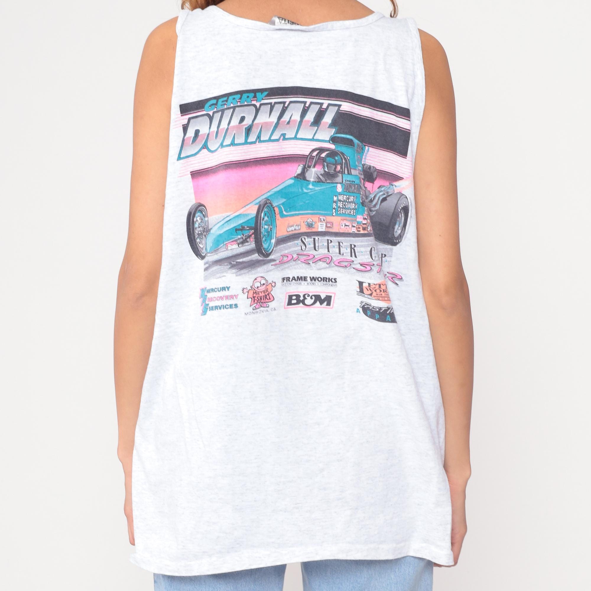 90s white heather sleeveless tank from oneita with Gerry Durwall Super Comp Dragster graphic. Turquoise drag racing car printed on front with pink and teal gradient text, multiple racing sponsor logos.