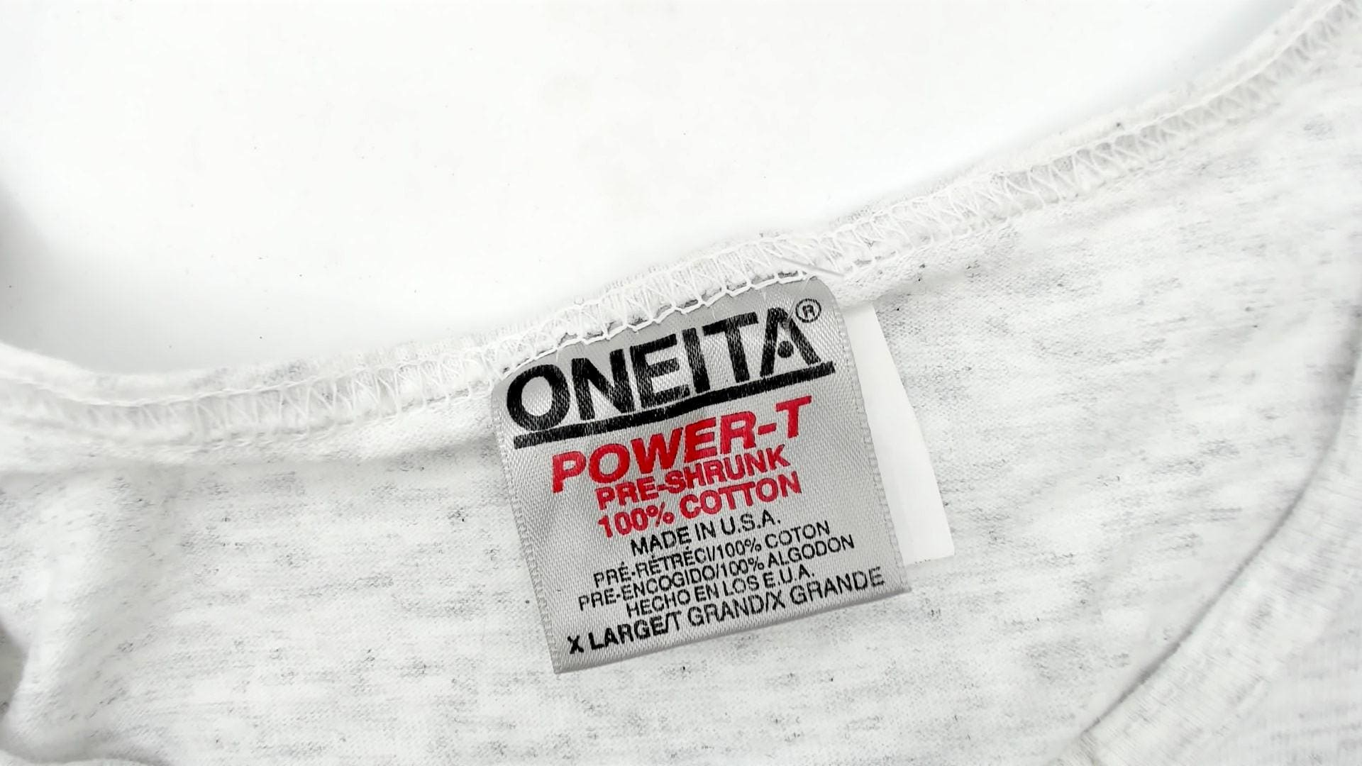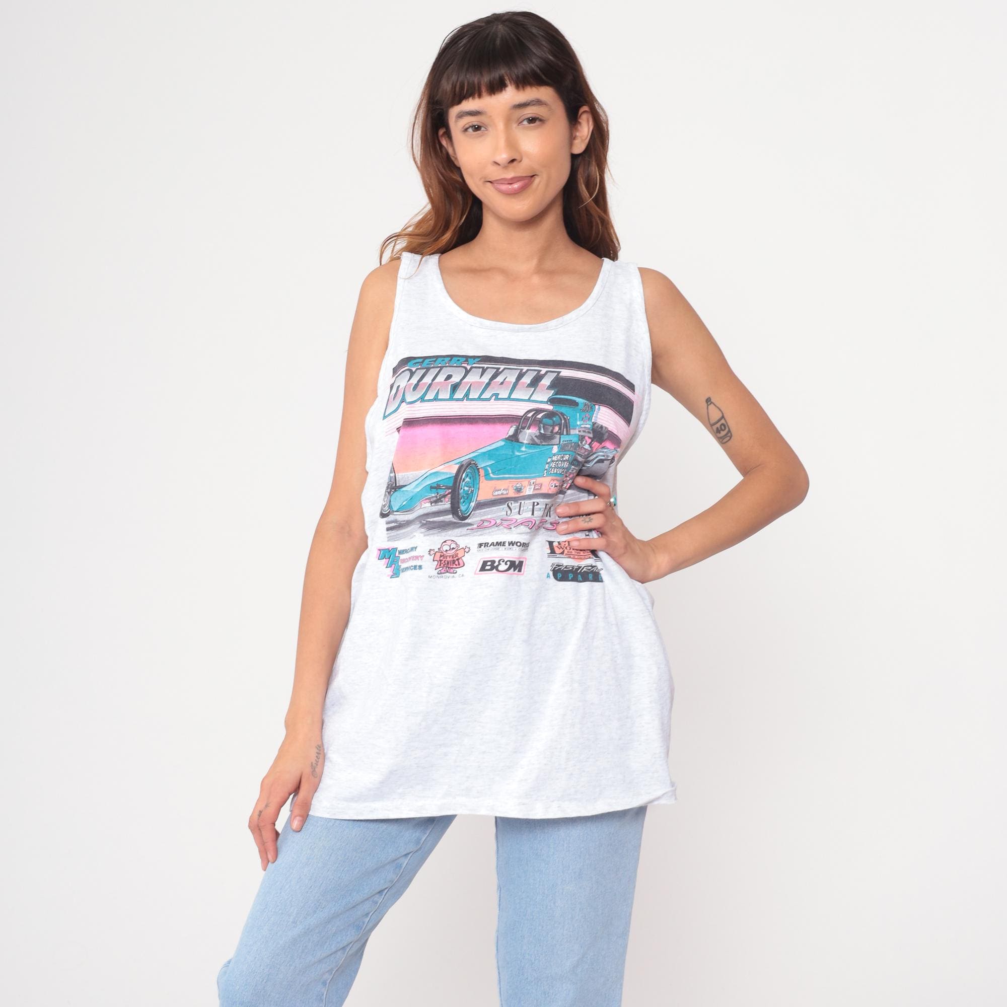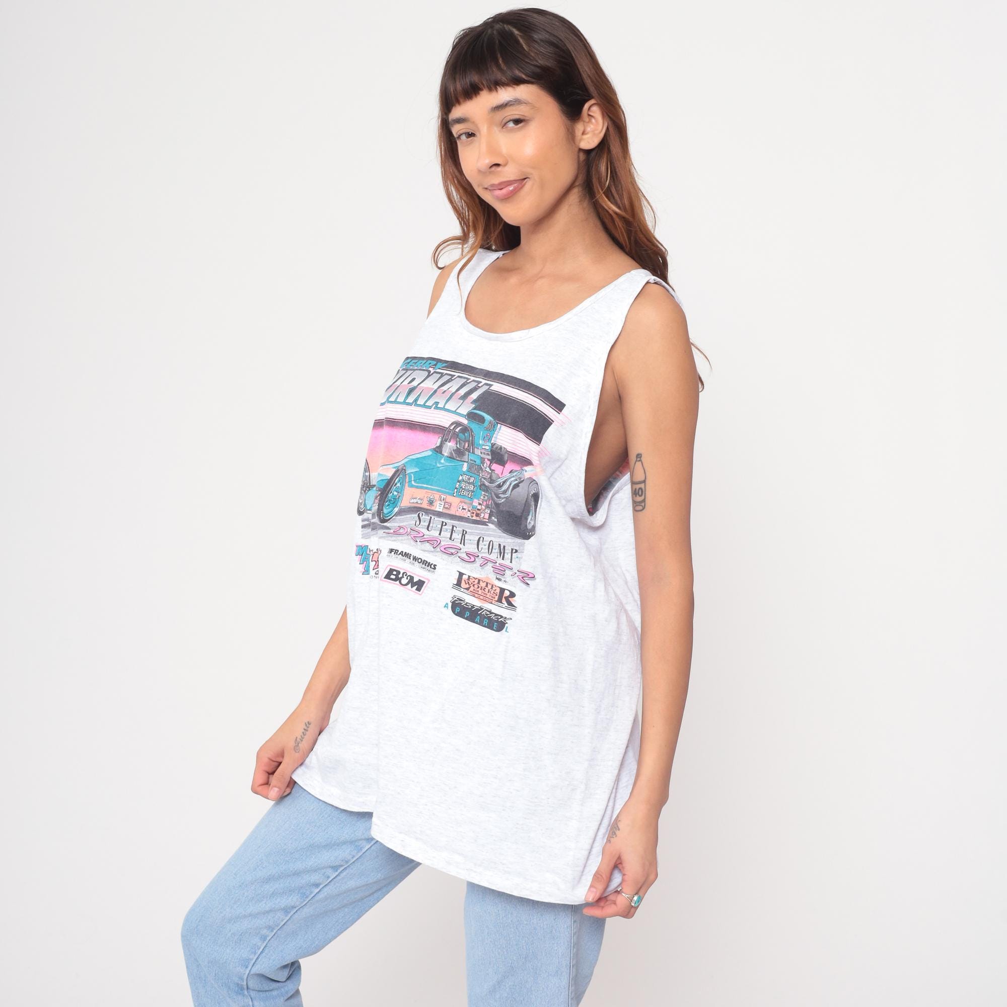 90s white heather sleeveless tank from oneita with Gerry Durwall Super Comp Dragster graphic. Turquoise drag racing car printed on front with pink and teal gradient text, multiple racing sponsor logos.