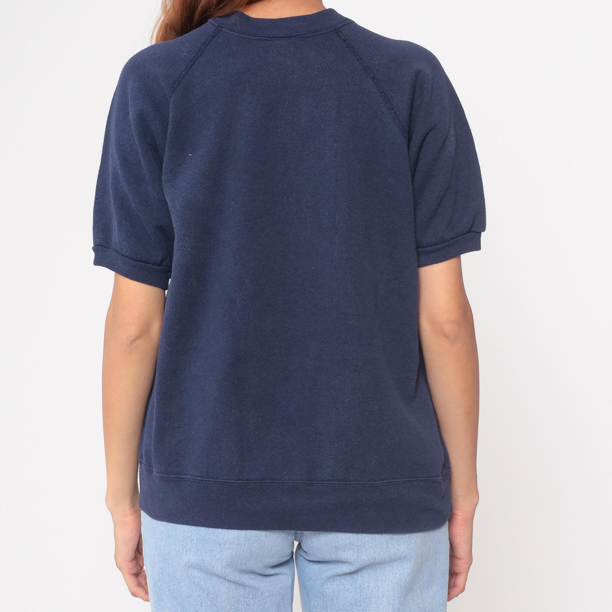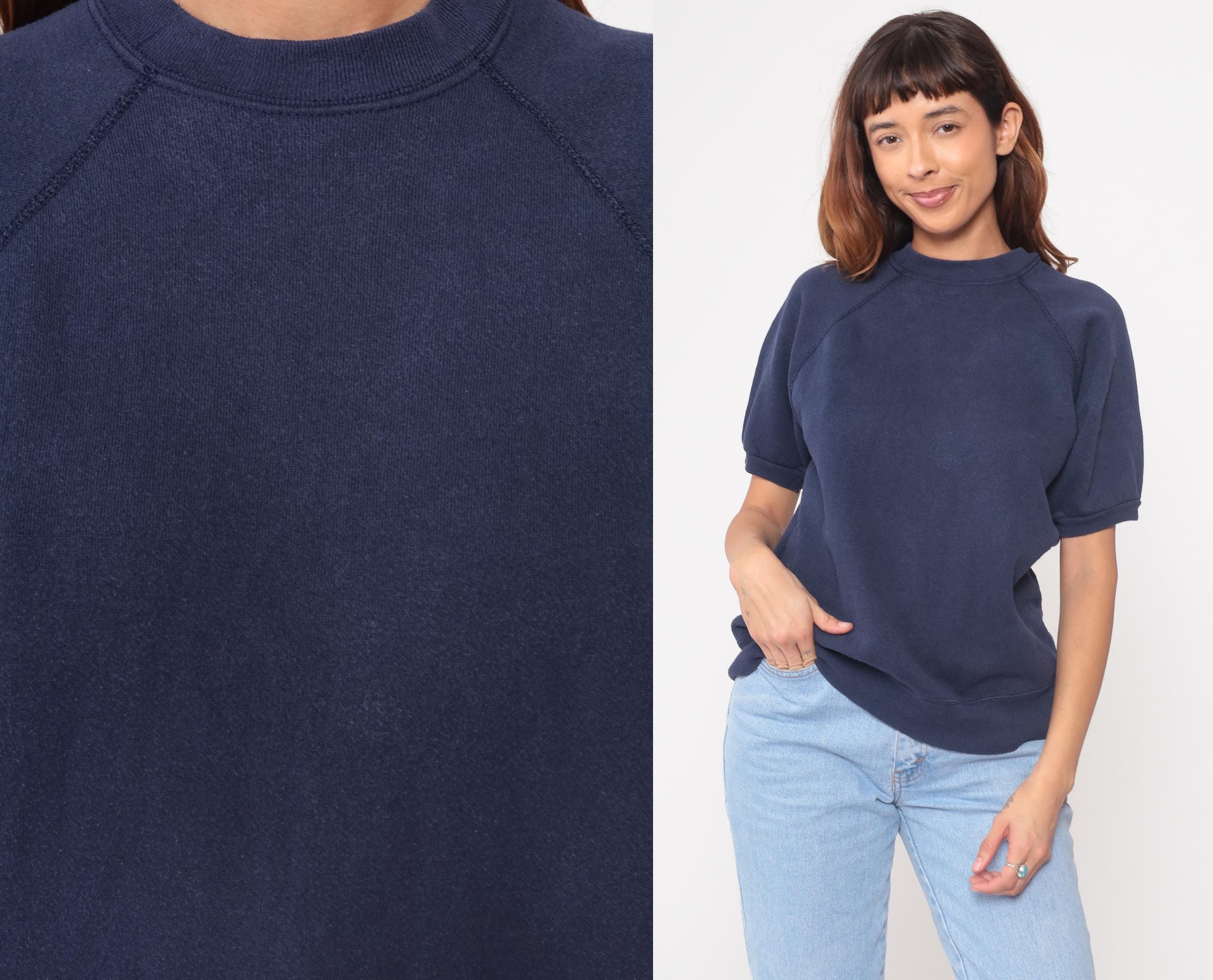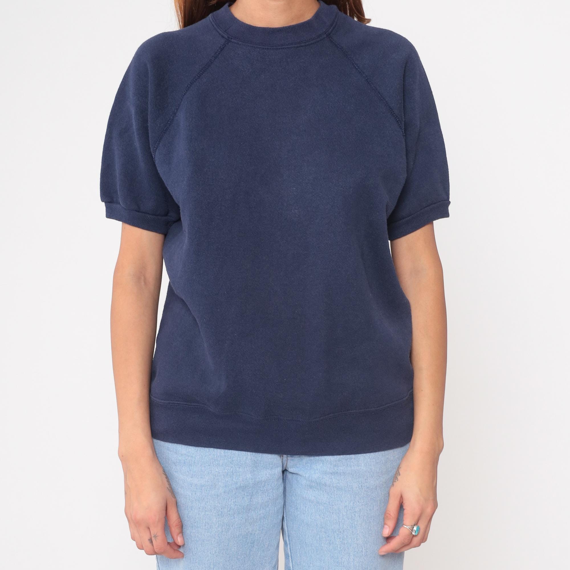 90s navy sweatshirt from tultex with raglan sleeves and ribbed crew neckline. Short sleeves with ribbed cuffs, ribbed hem, solid navy color throughout.