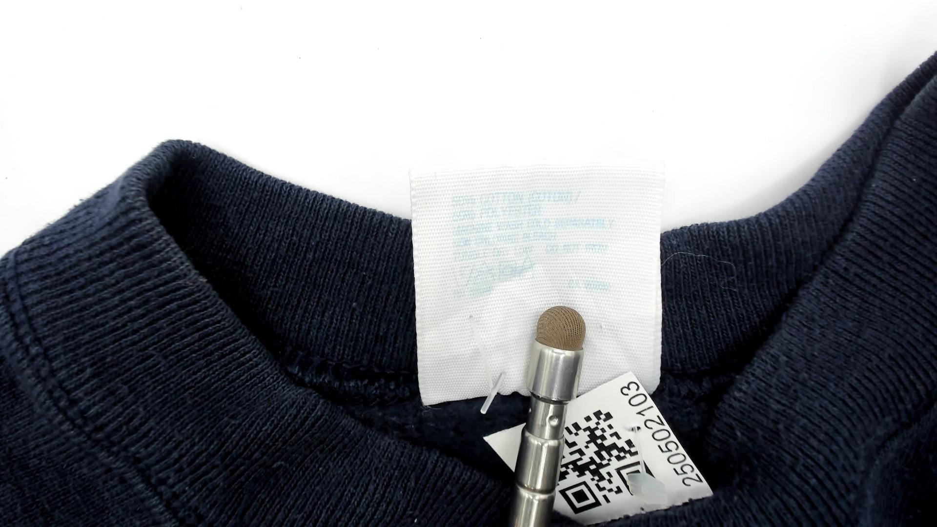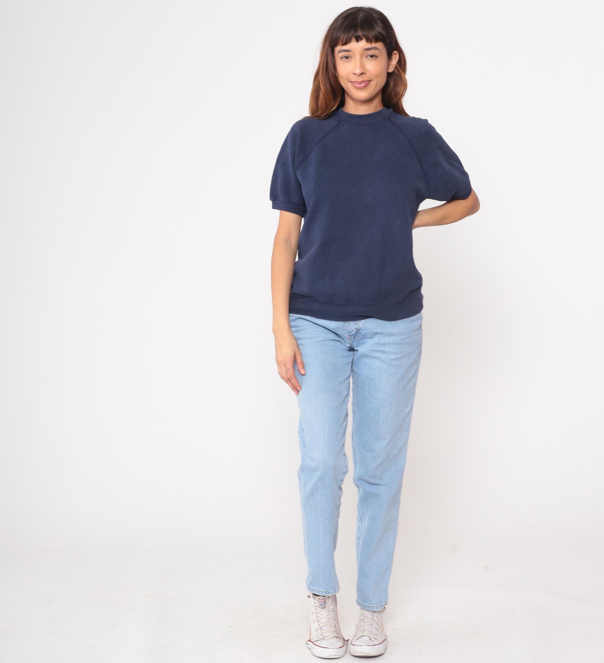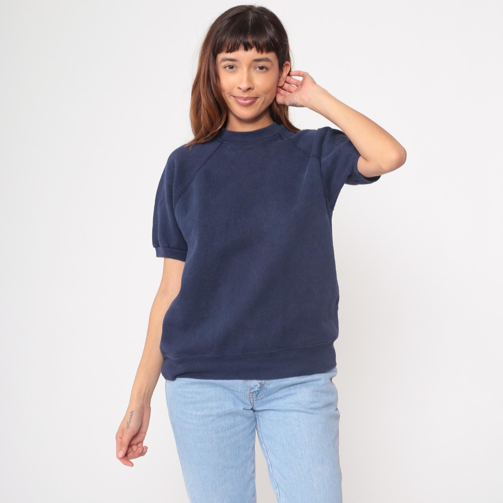 90s navy sweatshirt from tultex with raglan sleeves and ribbed crew neckline. Short sleeves with ribbed cuffs, ribbed hem, solid navy color throughout.