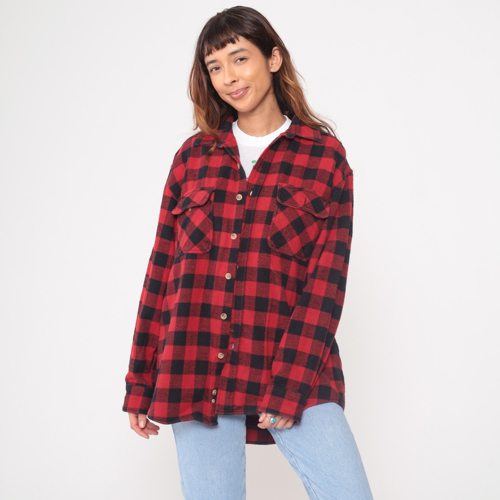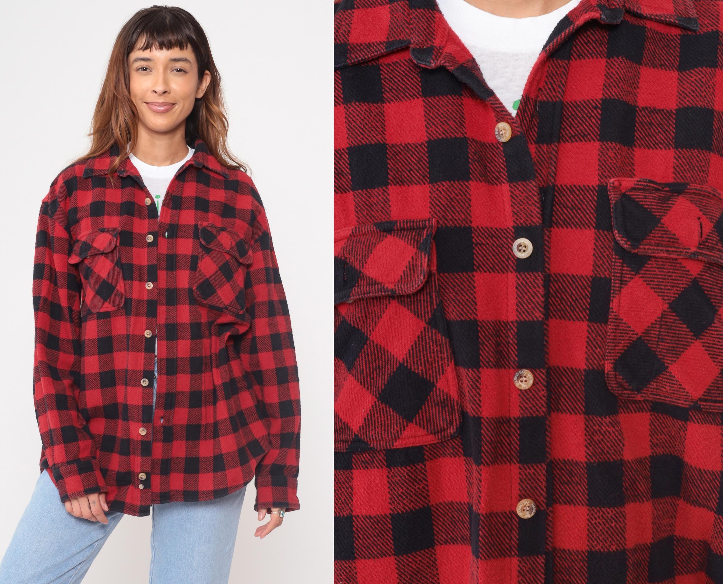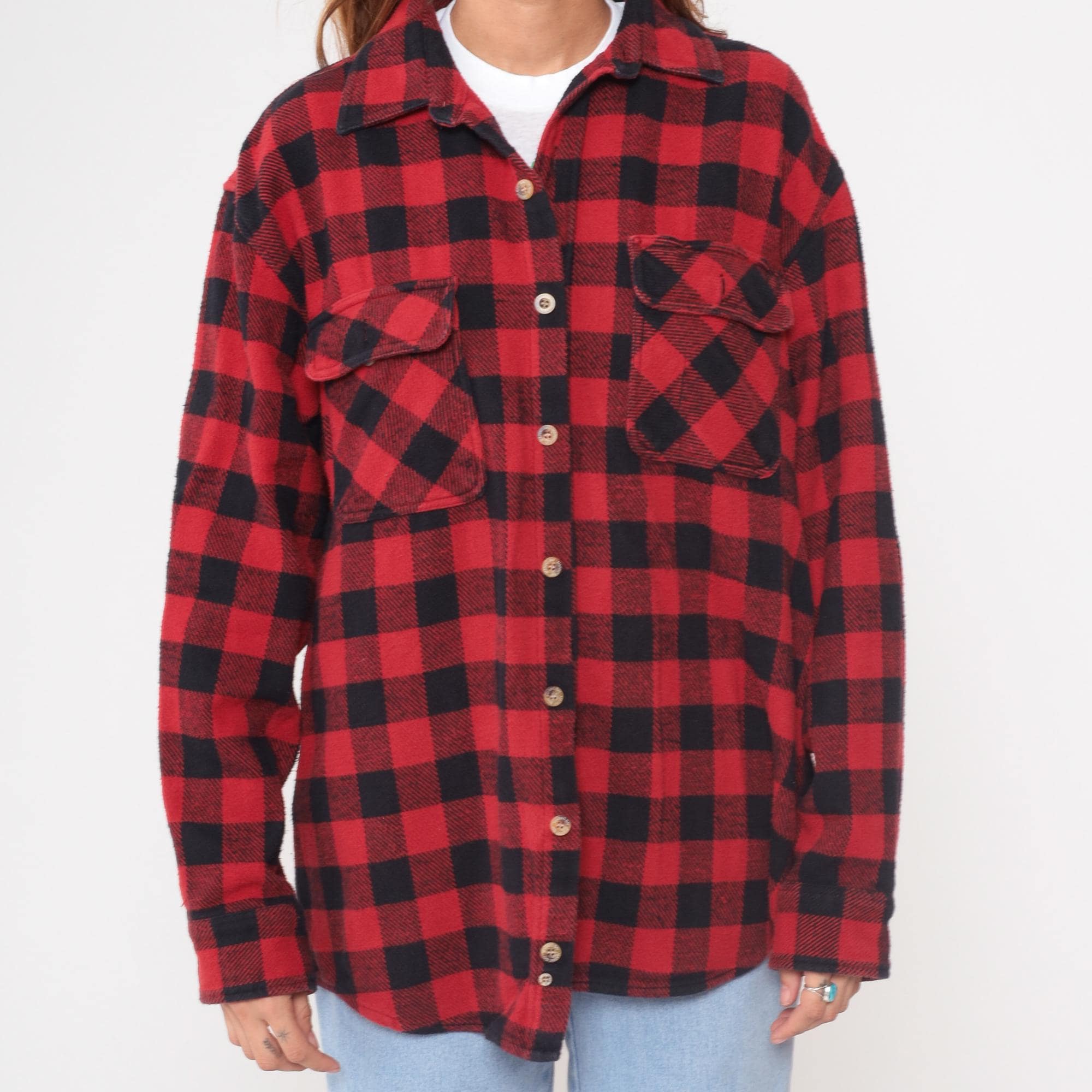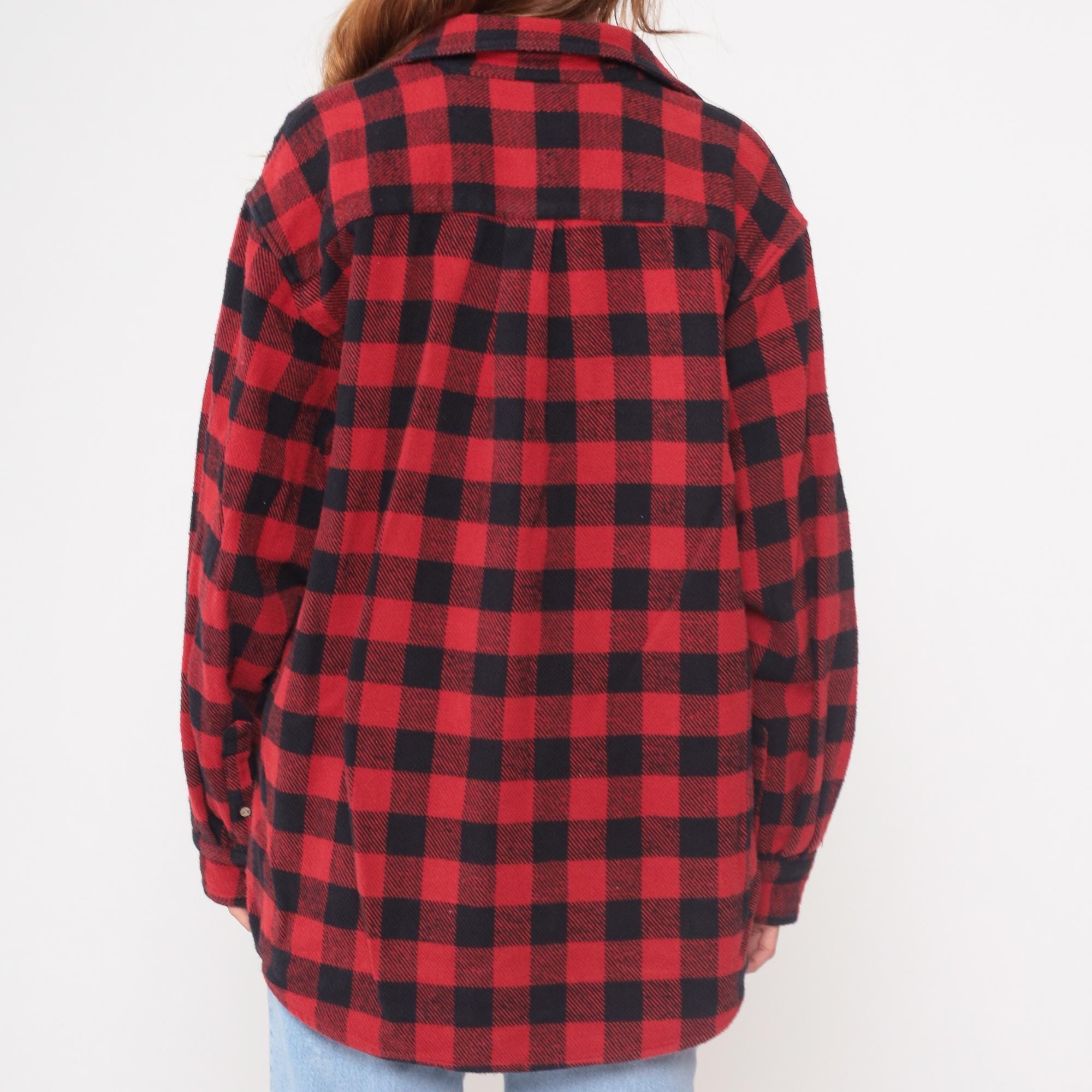 Y2K red and black buffalo plaid flannel shirt from Marino Bay with button front closure and two chest pockets with button-down flaps. Long sleeves, pointed collar, light-colored buttons throughout.