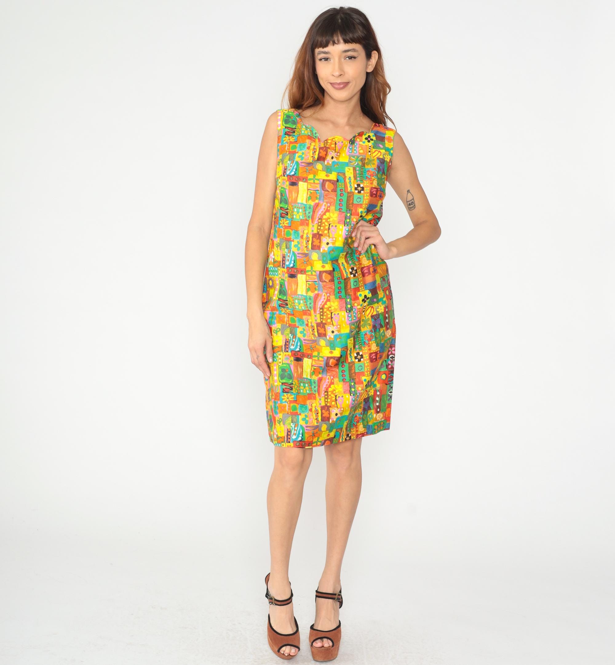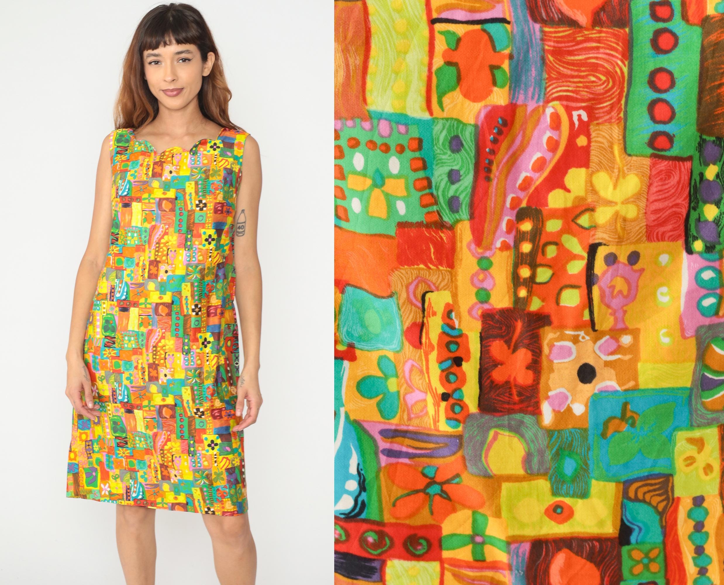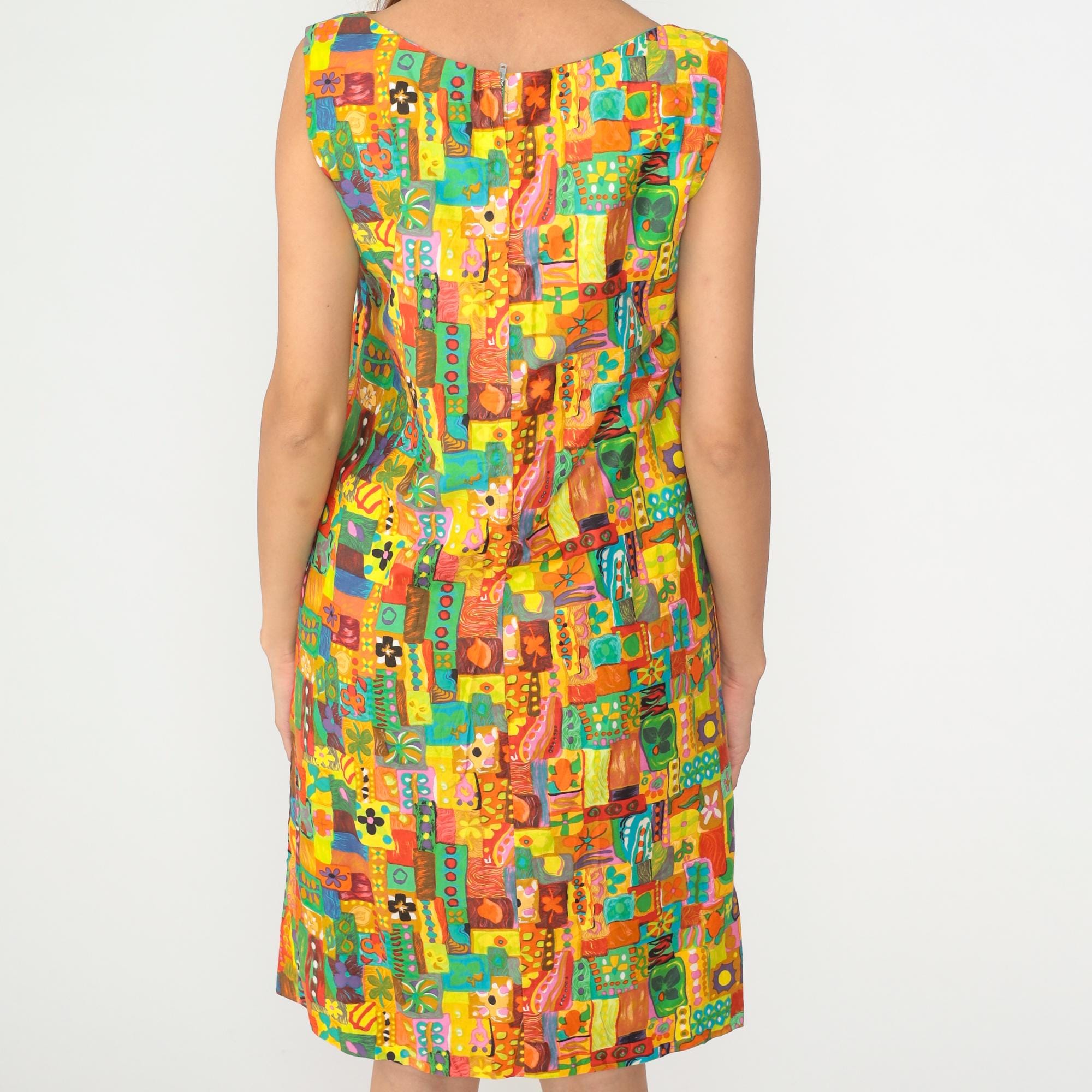 60s sleeveless shift dress in multicolor abstract patchwork print with yellow, orange, red, turquoise, green, and pink geometric and organic shapes arranged in a mosaic pattern across the fabric. V-neckline with straight silhouette and above-knee length.