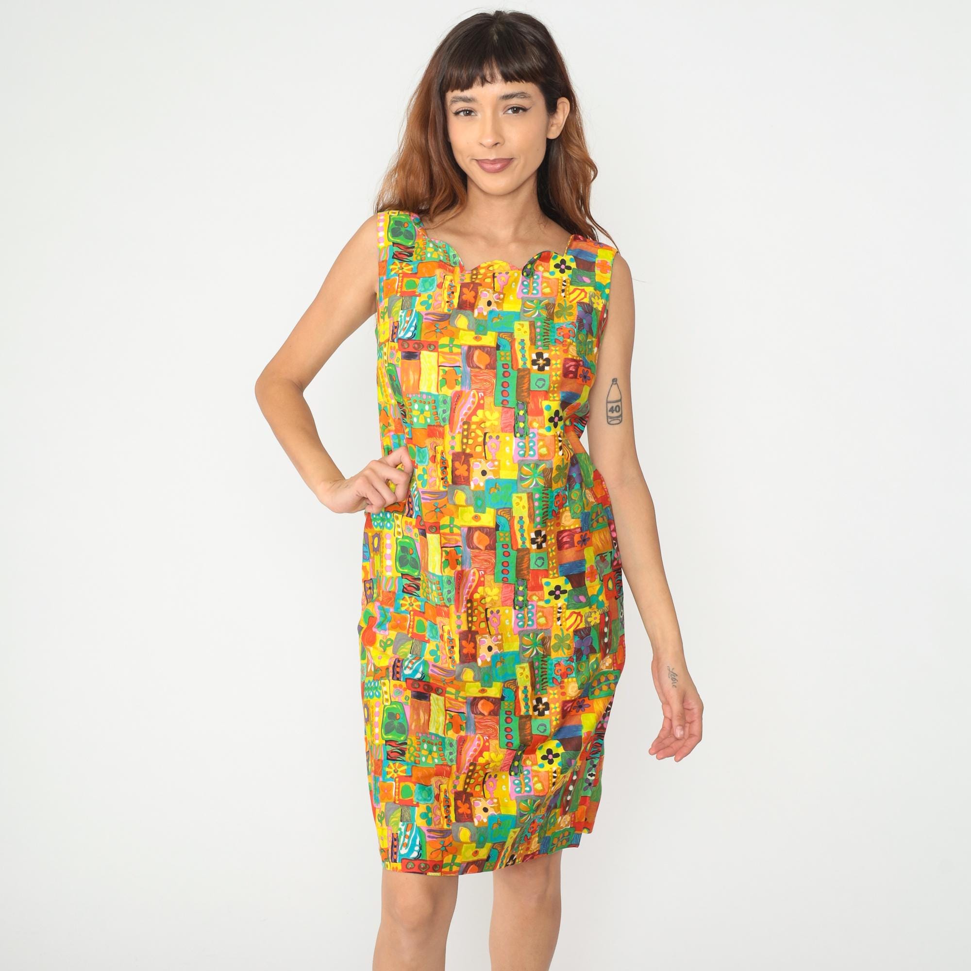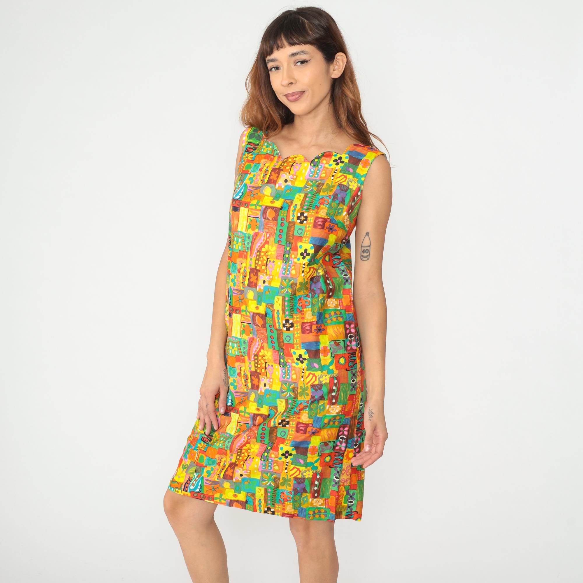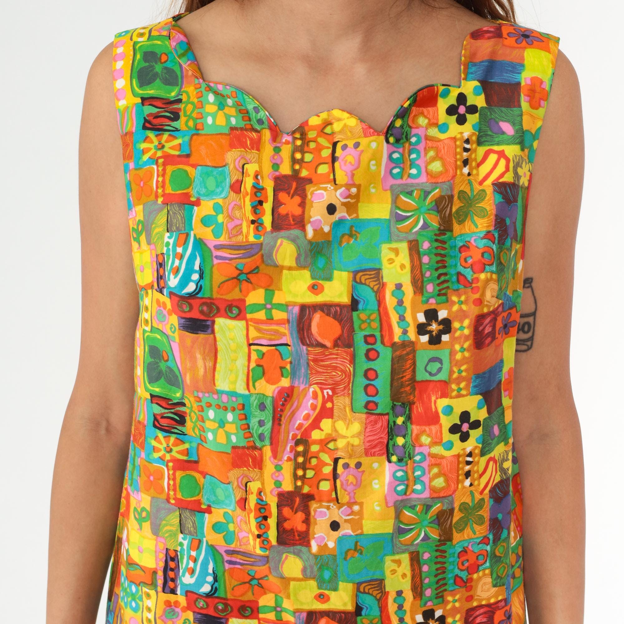 60s sleeveless shift dress in multicolor abstract patchwork print with yellow, orange, red, turquoise, green, and pink geometric and organic shapes arranged in a mosaic pattern across the fabric. V-neckline with straight silhouette and above-knee length.