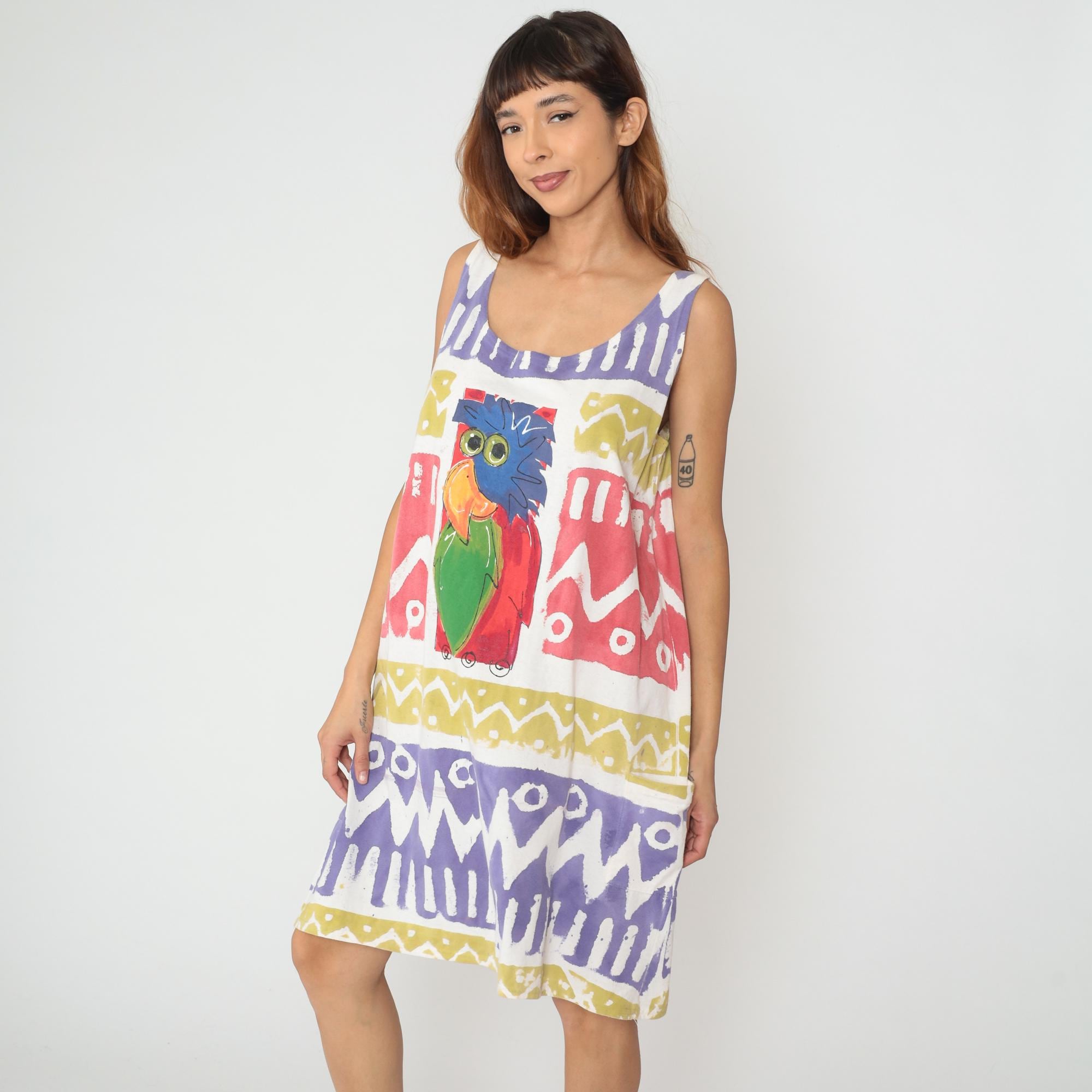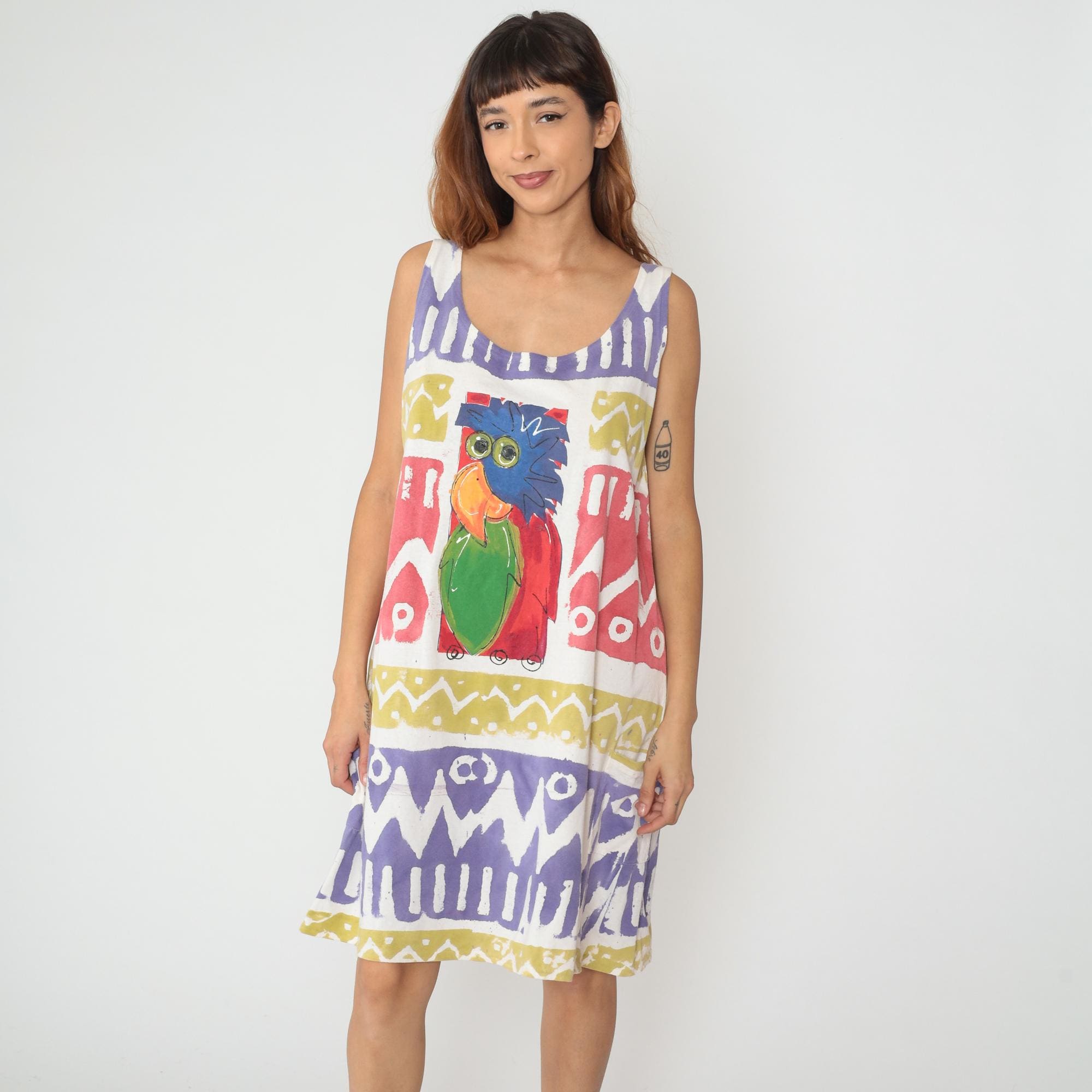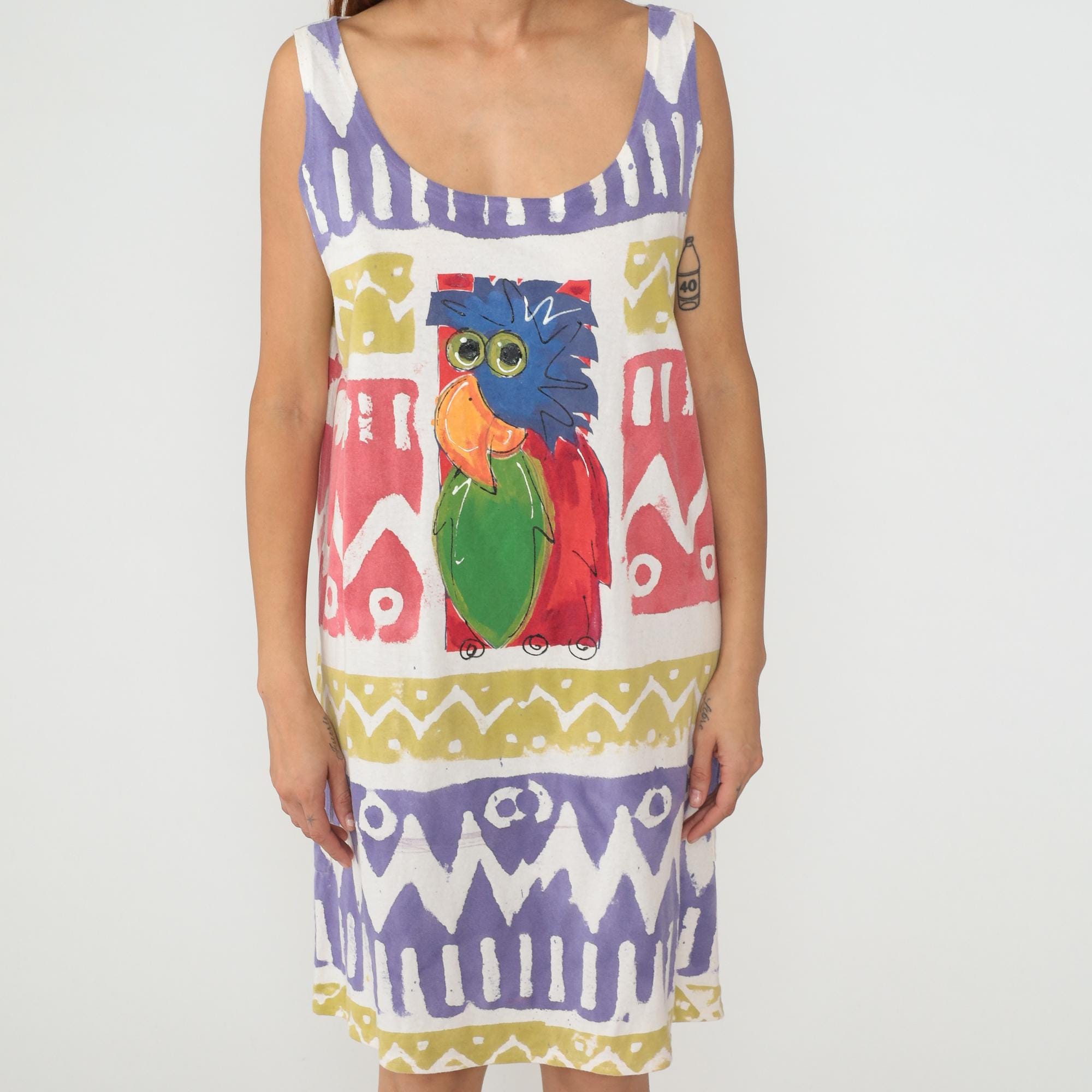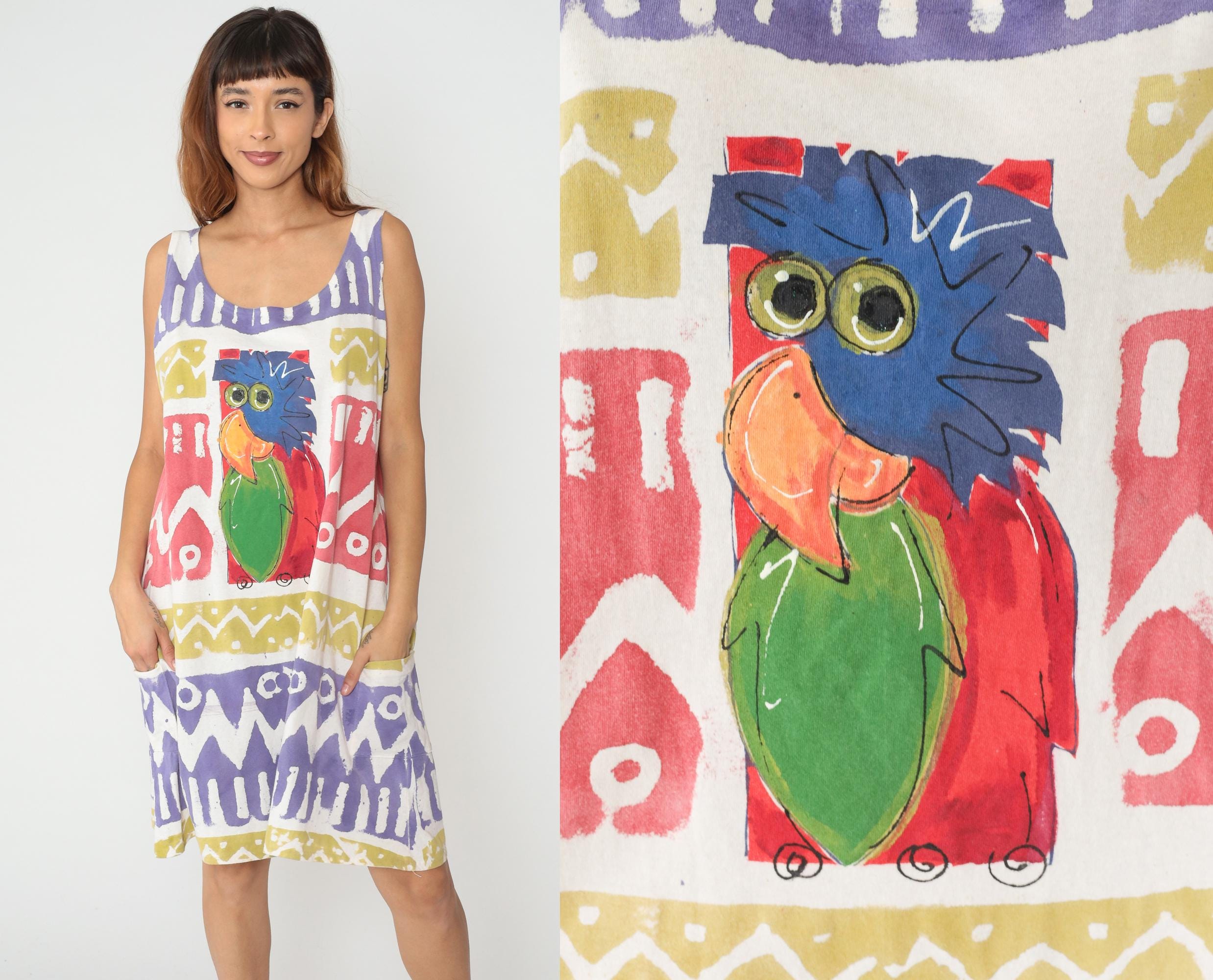 90s sleeveless shift dress with hand-painted parrot and tribal geometric pattern design. Front features a colorful parrot with blue head, orange beak, and green body framed by horizontal bands of purple, yellow, red, and white with zigzag and rectangular patterns.