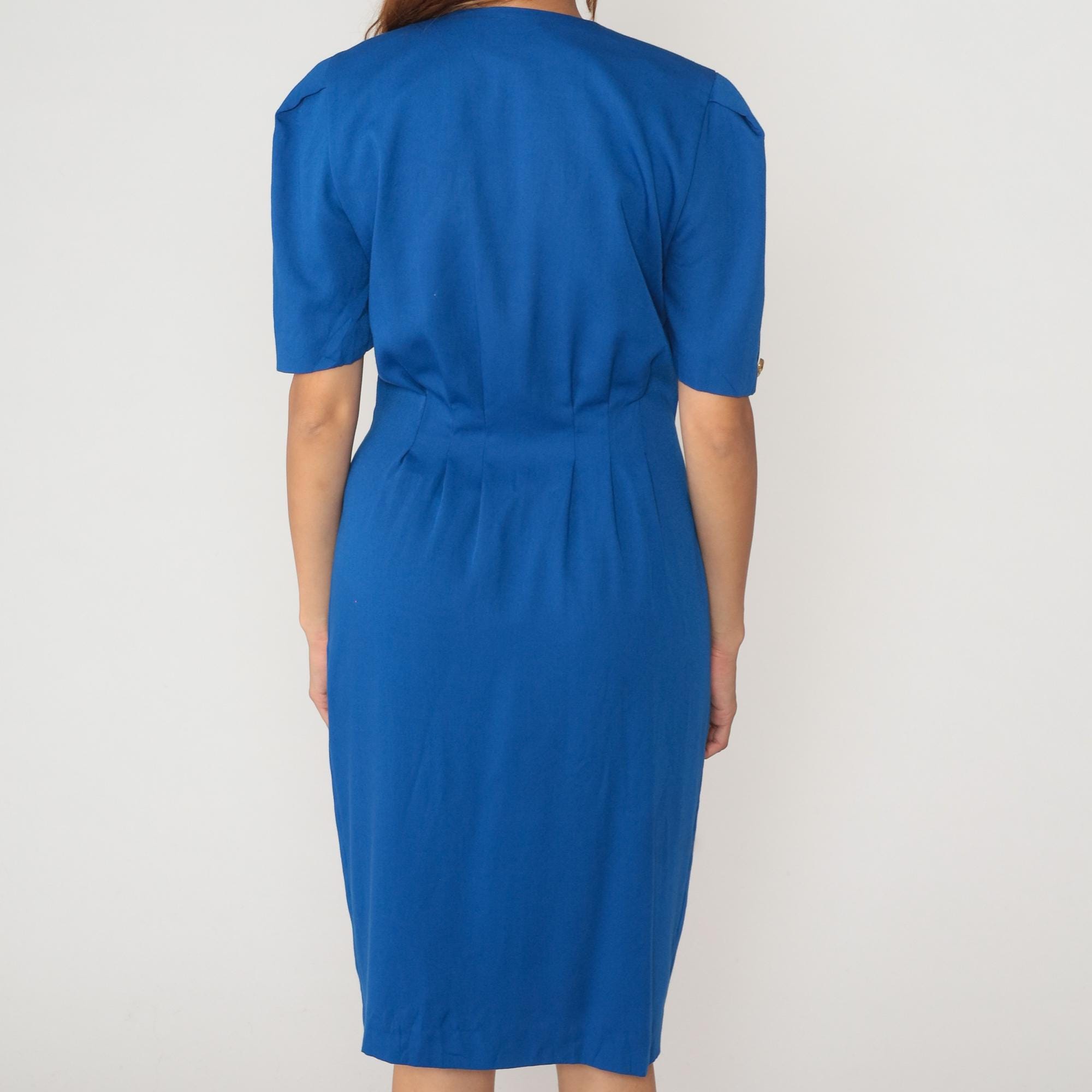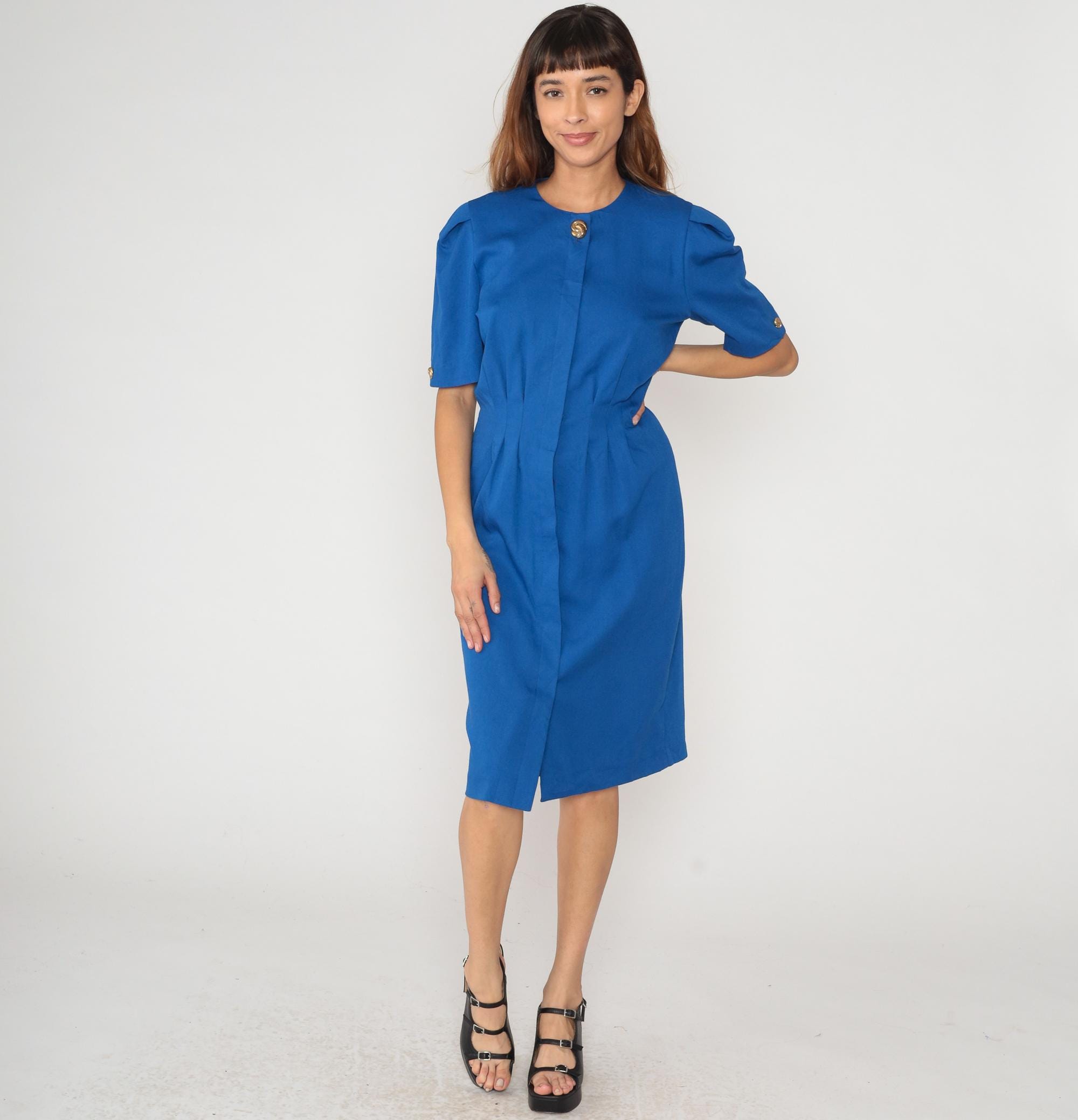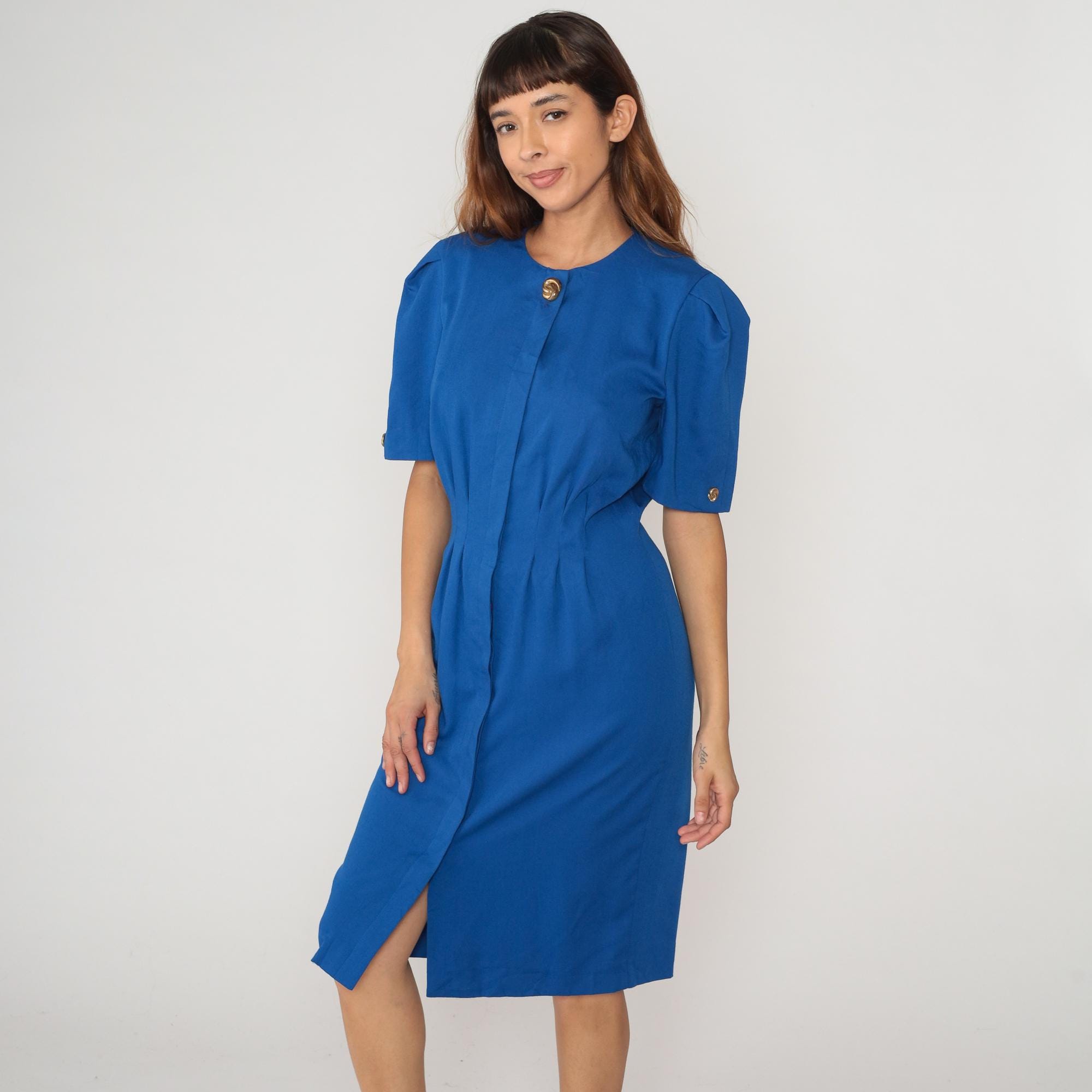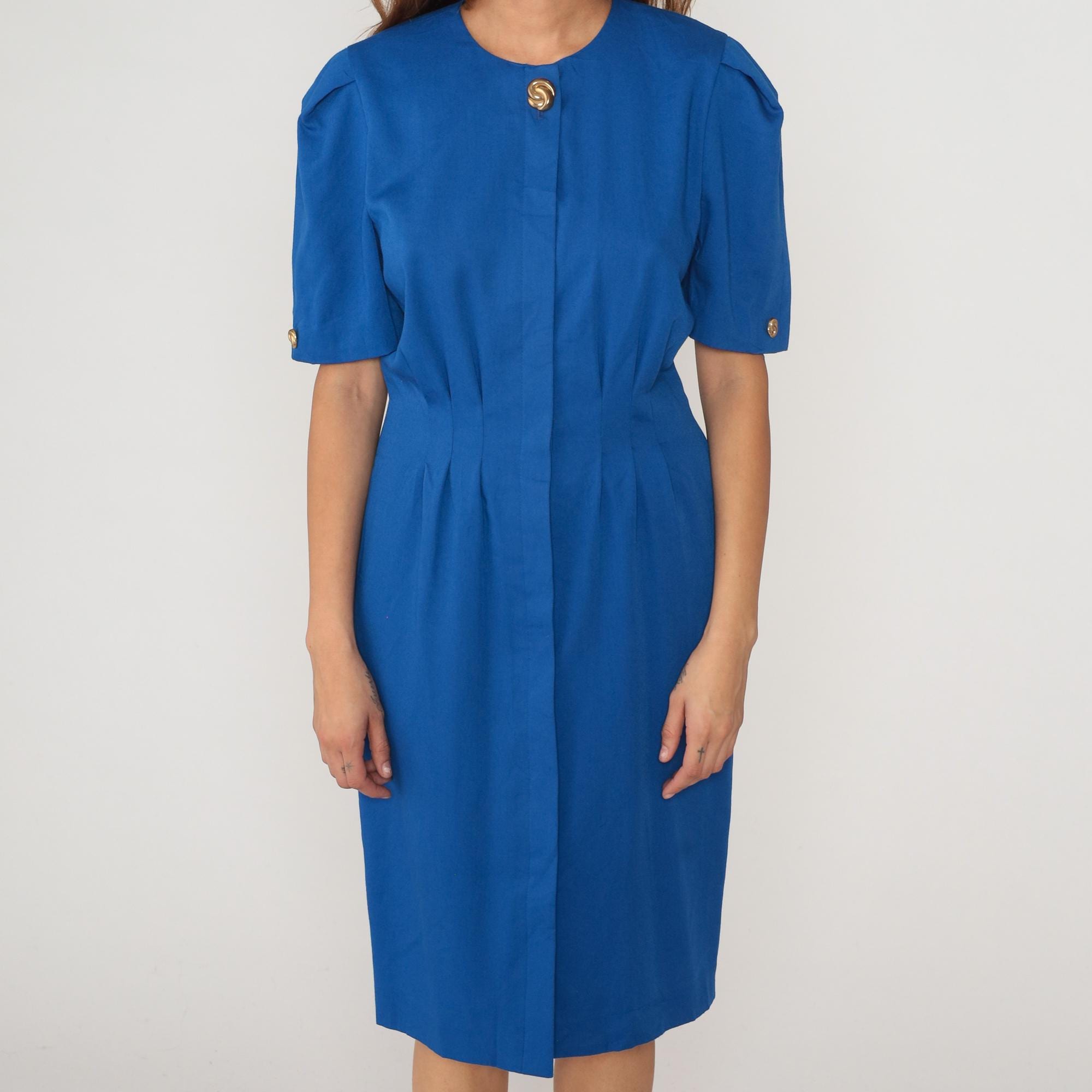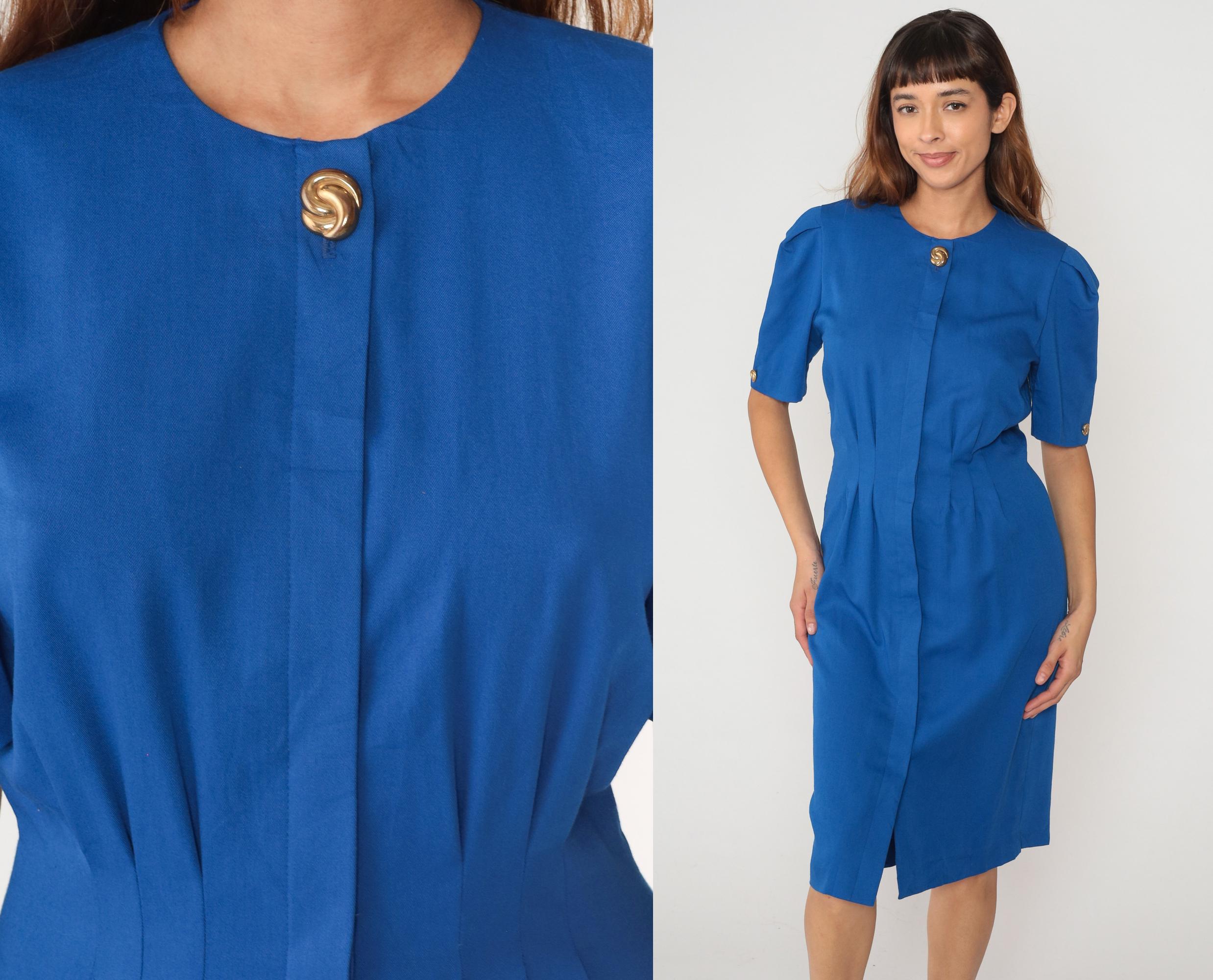 90s cobalt blue dress with single decorative gold button at the round neckline and matching gold buttons on each short sleeve. Fitted bodice with pleating at the waist, straight knee-length skirt with center front seam detail.